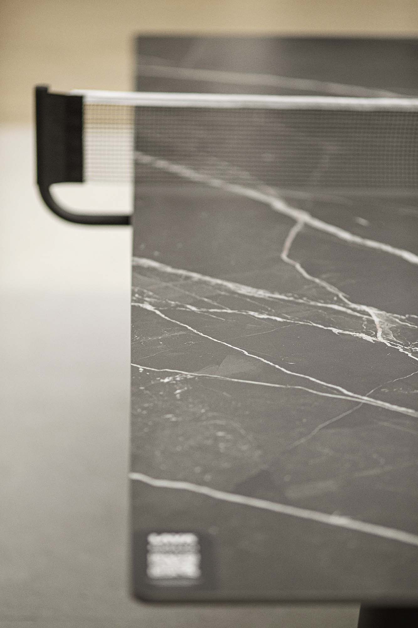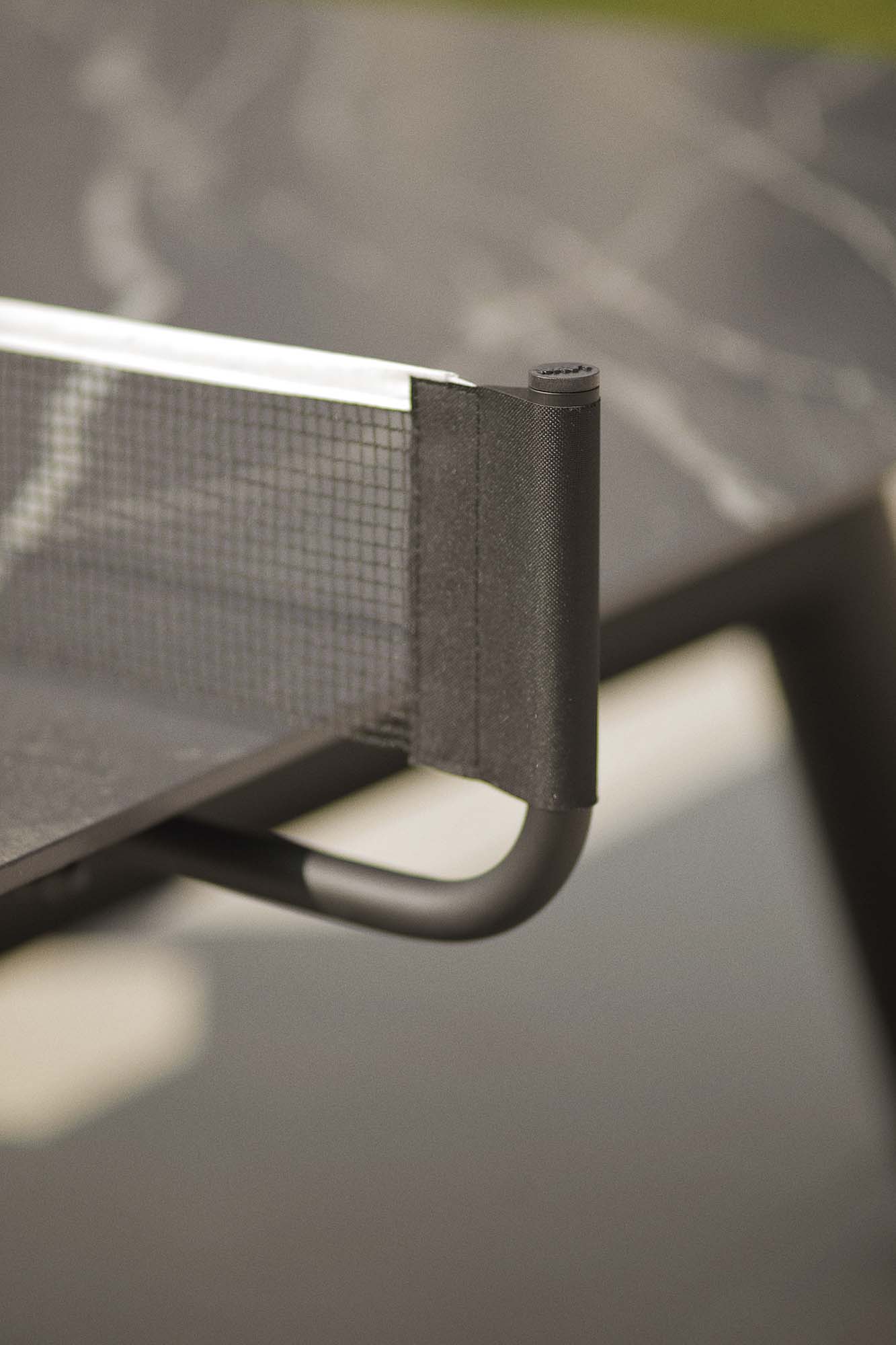 Partitina 0-6 features curved aluminium legs with a 12-centimetre diameter, with a shape inspired by the trajectory of the ball on the table top: a hypnotic trail from one side of the table to the other. The sculptural red or black base contrasts with the sleek, elegant top in white or black marble-effect porcelain stoneware. The combination of top and base colours creates different aesthetics: from the strict and minimal total black to the more cheerful white and red. The reference to the game is metaphorical and transforms into an unusual and sophisticated design that can also bring a smile.