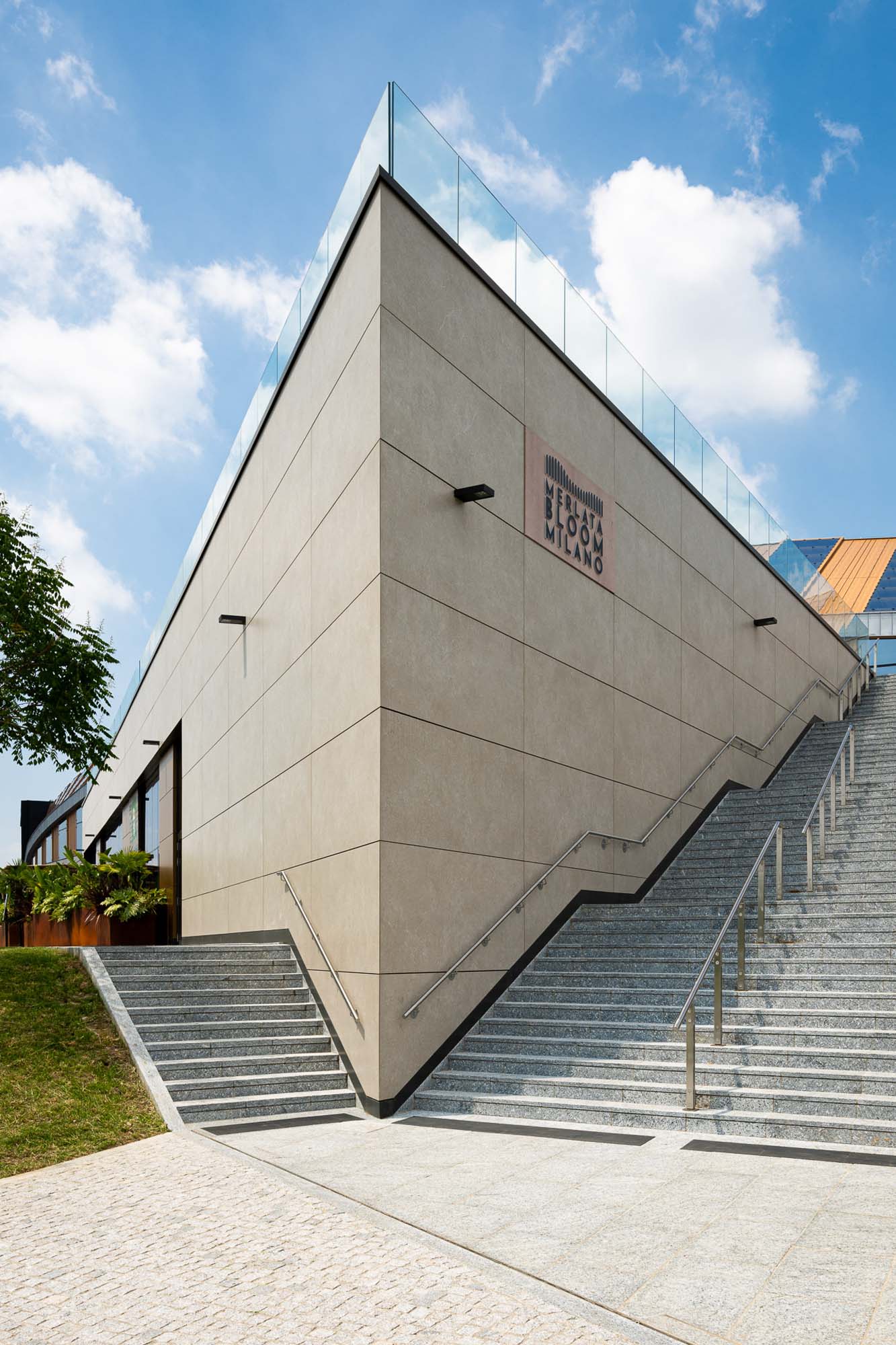 In view of its strength and durability, porcelain stoneware was also the ideal choice for covering part of the building’s facades. The stone-effect of the Grande Stone Look slab collection was chosen in Limestone Sand finish for the pilaster strips of the external walls around the entrance.
