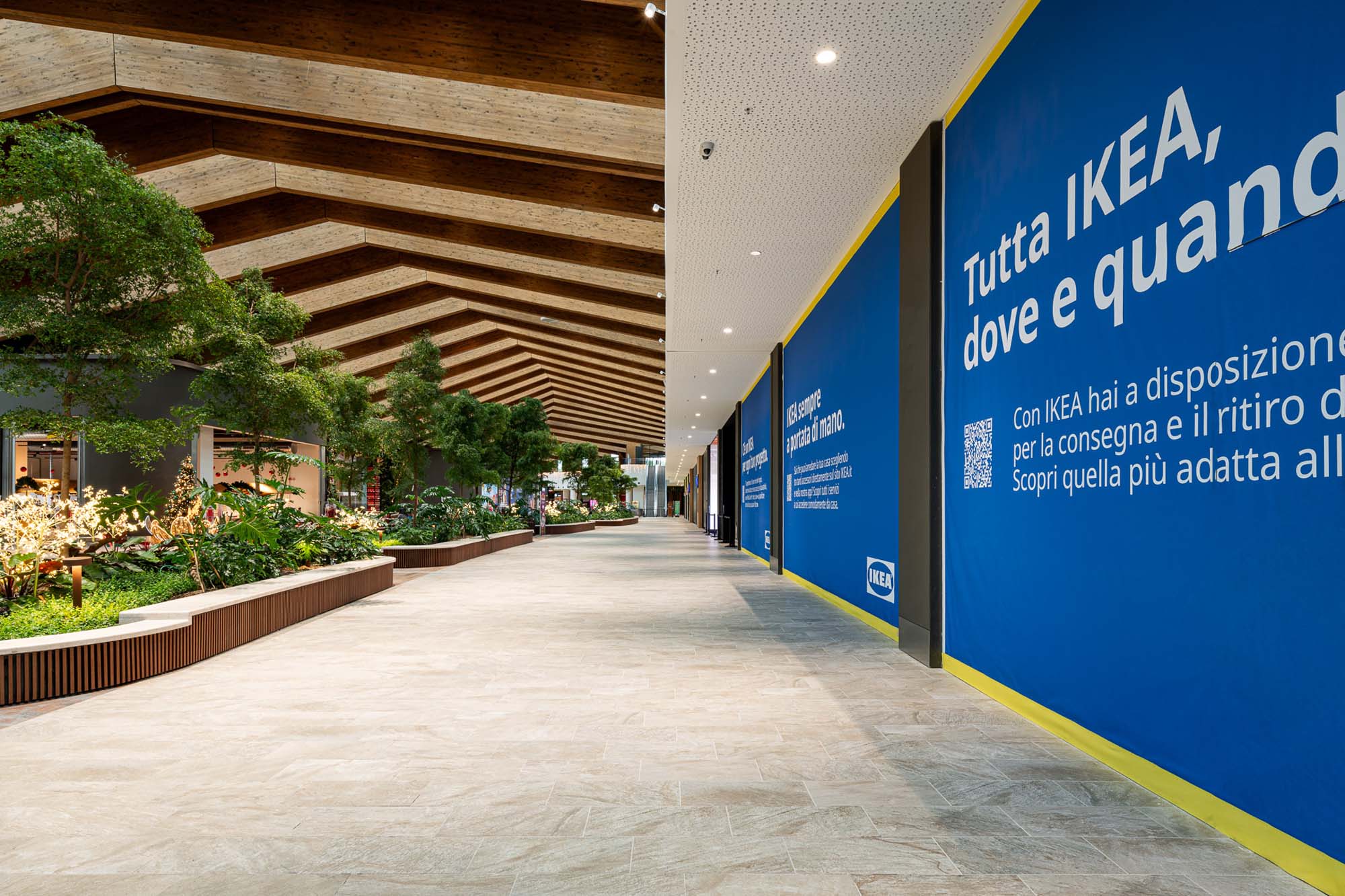 There is constant interaction between the retail areas and the next-door Merlata Bloom park, designed as a place to encourage people to socialise and linger, both indoors and outdoors, in the new Smart Urban District.