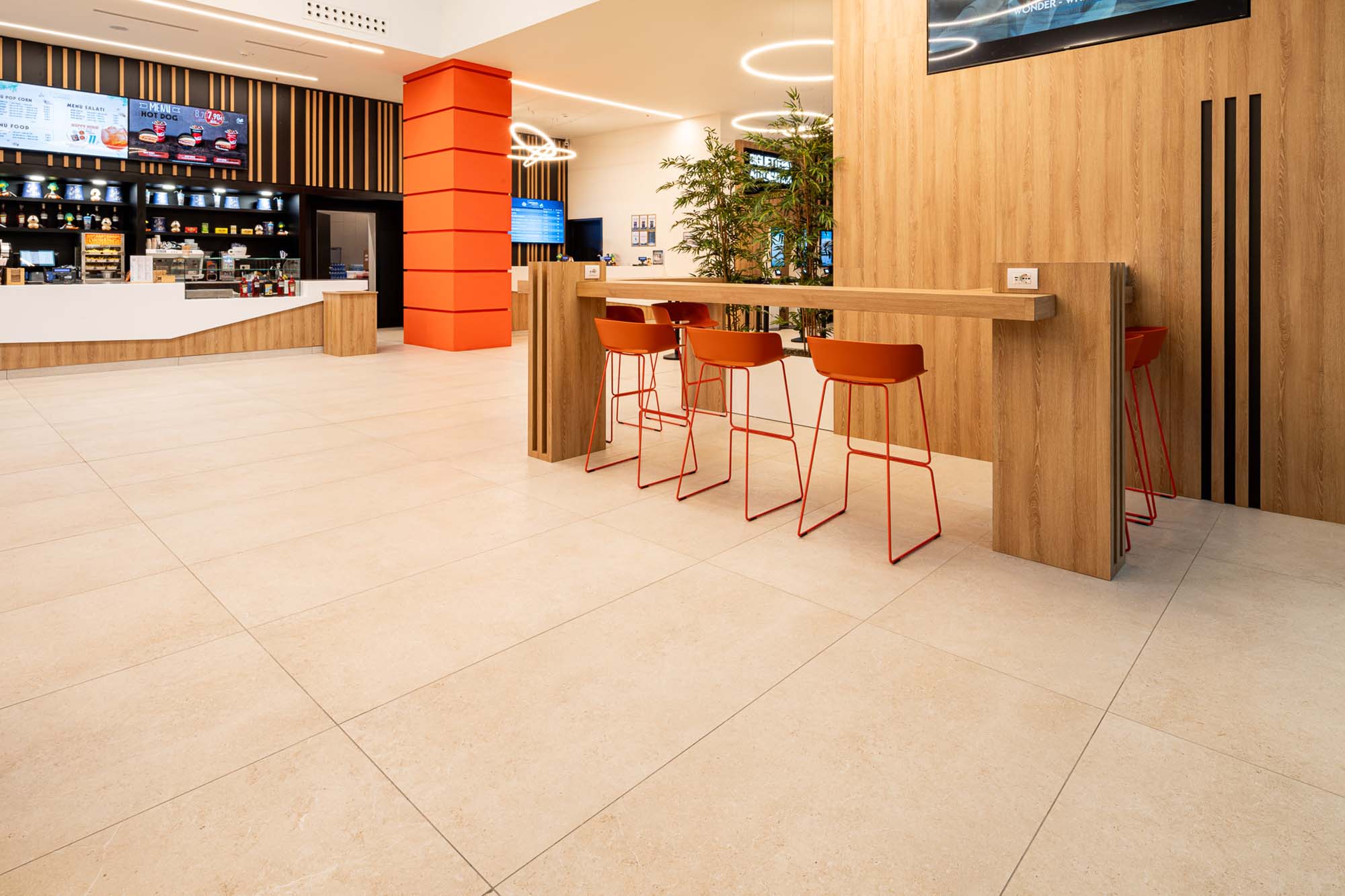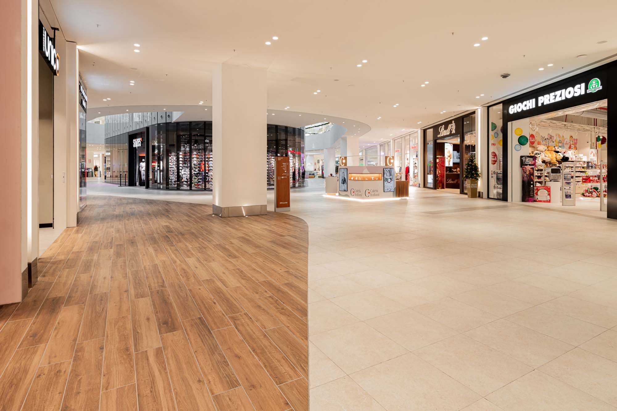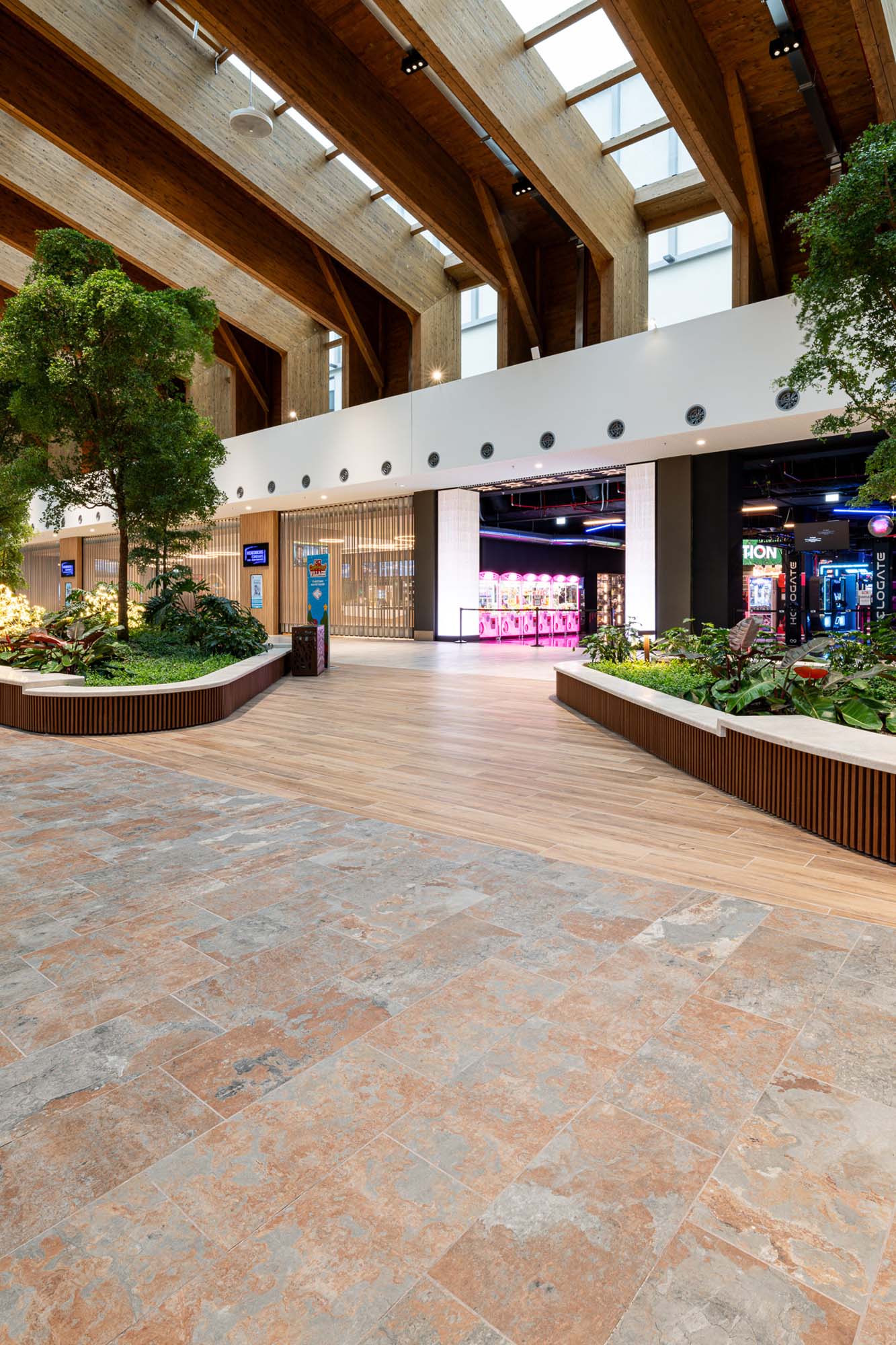 The walkways in the galleries, where the flagship stores of the many brands present at Merlata Bloom and the large multiplex cinema are located, are defined by Rocking series tiles, again combined with the nature-inspired textures of the Treverkview collection, with structured surface, in the Multicolor version inspired by the constantly varied aesthetic of natural stones and in Beige. In the 20 mm thick version, these same tiles accompany visitors in the Life Style Centre’s public outdoor areas, for which they provide the compositional module.