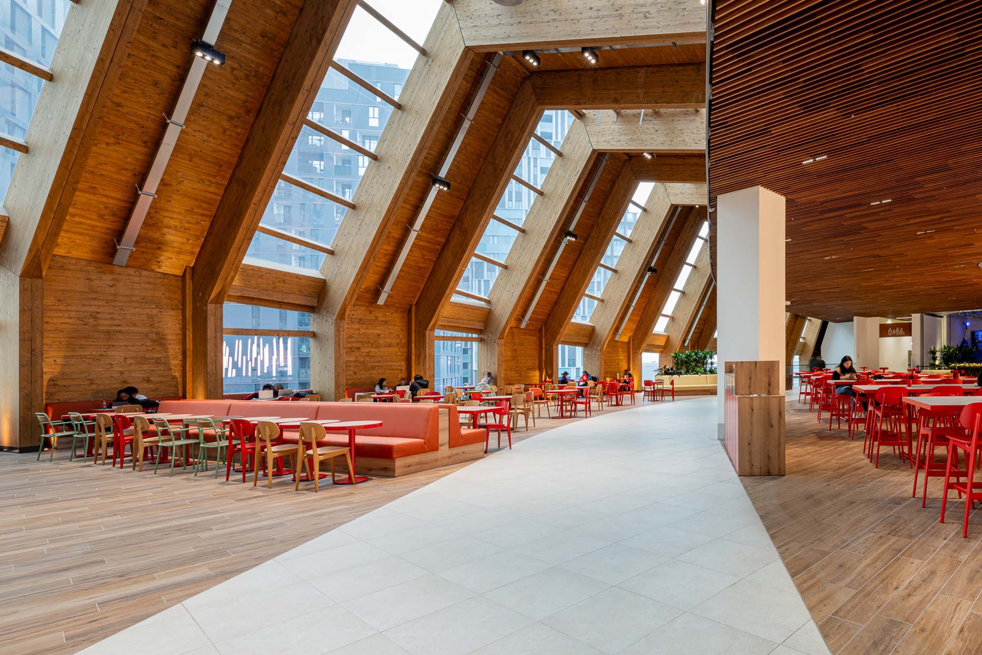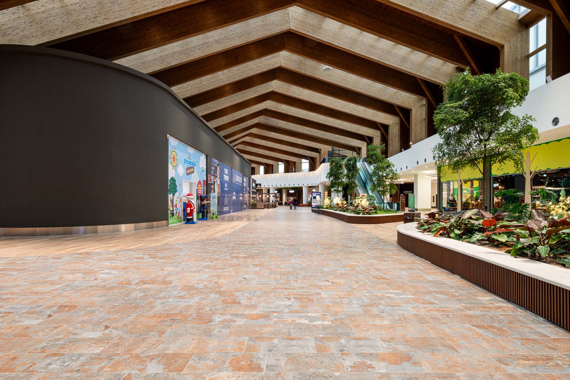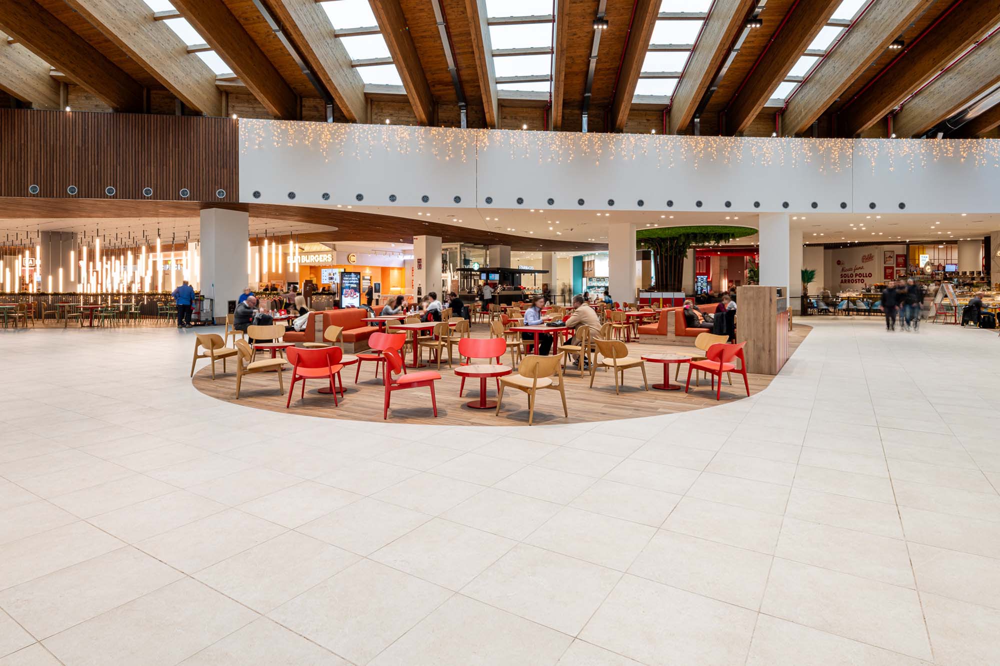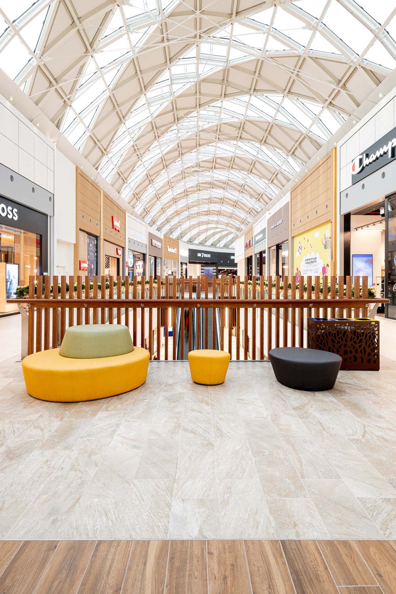 The public squares giving access to the mall, the terraces that create the visual link between indoors and outdoors and also the large-scale use of natural materials such as structural timber and porcelain stoneware paving, not to mention the use of plants in many indoor spaces, all facilitate seamless integration with the surrounding urban environment.