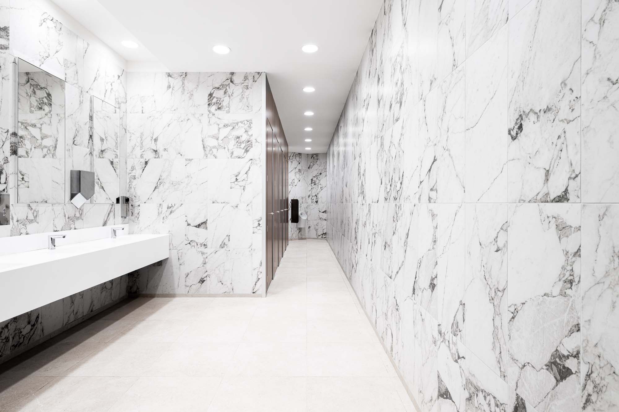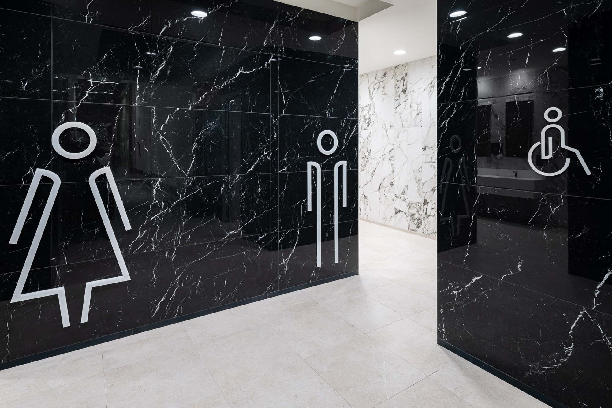 In the washrooms Allmarble slabs in Calacatta Extra and Elegant Black versions, both with glossy finishes, are combined to create bright, elegant interiors.