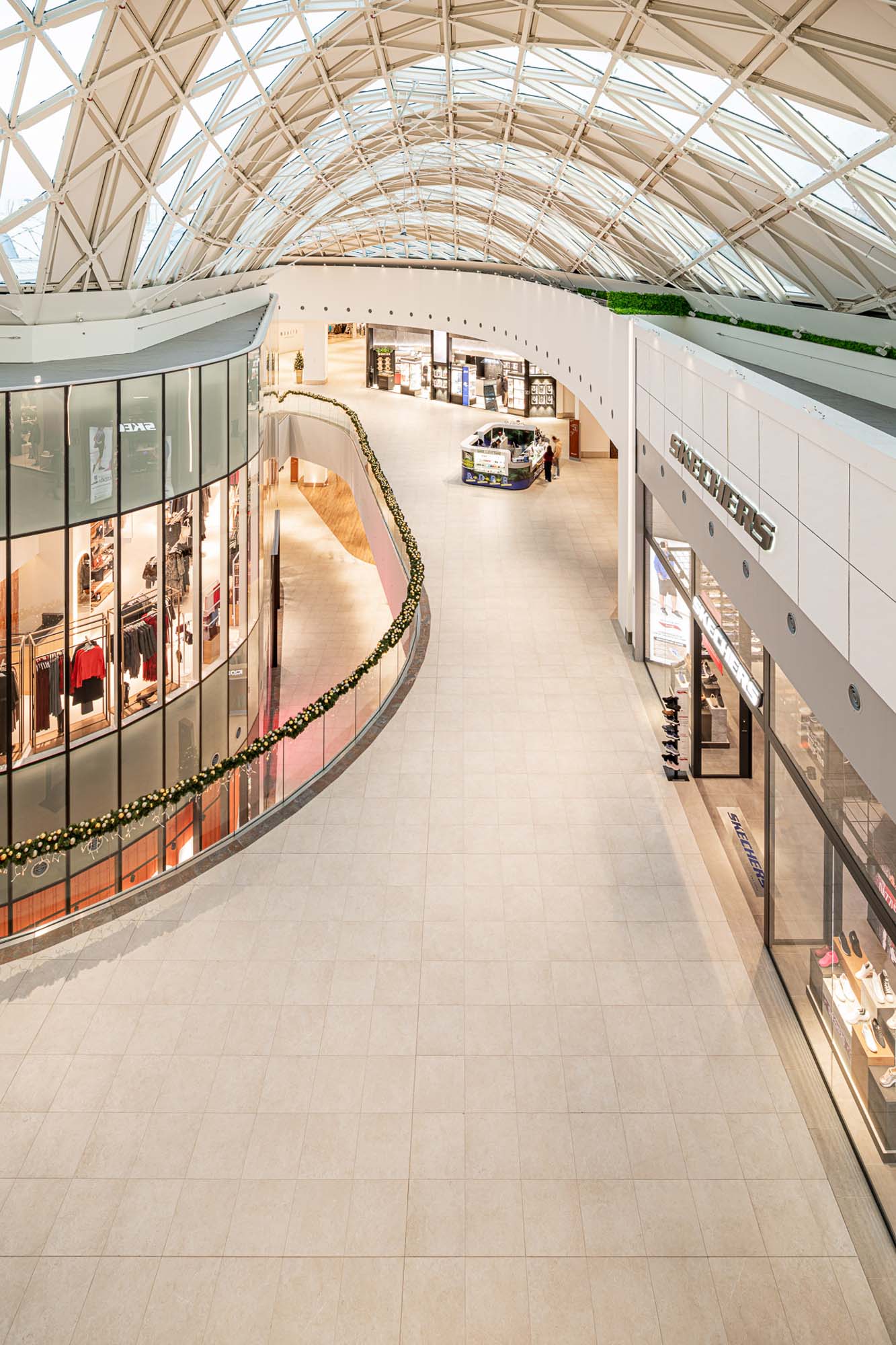The green walkway on the roof, which carries a photovoltaic power plant of 5 thousand square metres and also features a modern rainwater collection system, is paved with the Market collection in Stone Grey version. As its concrete-effect aesthetic suggests, this product is extremely hard-wearing and was specifically developed for heavily used areas like shopping malls.