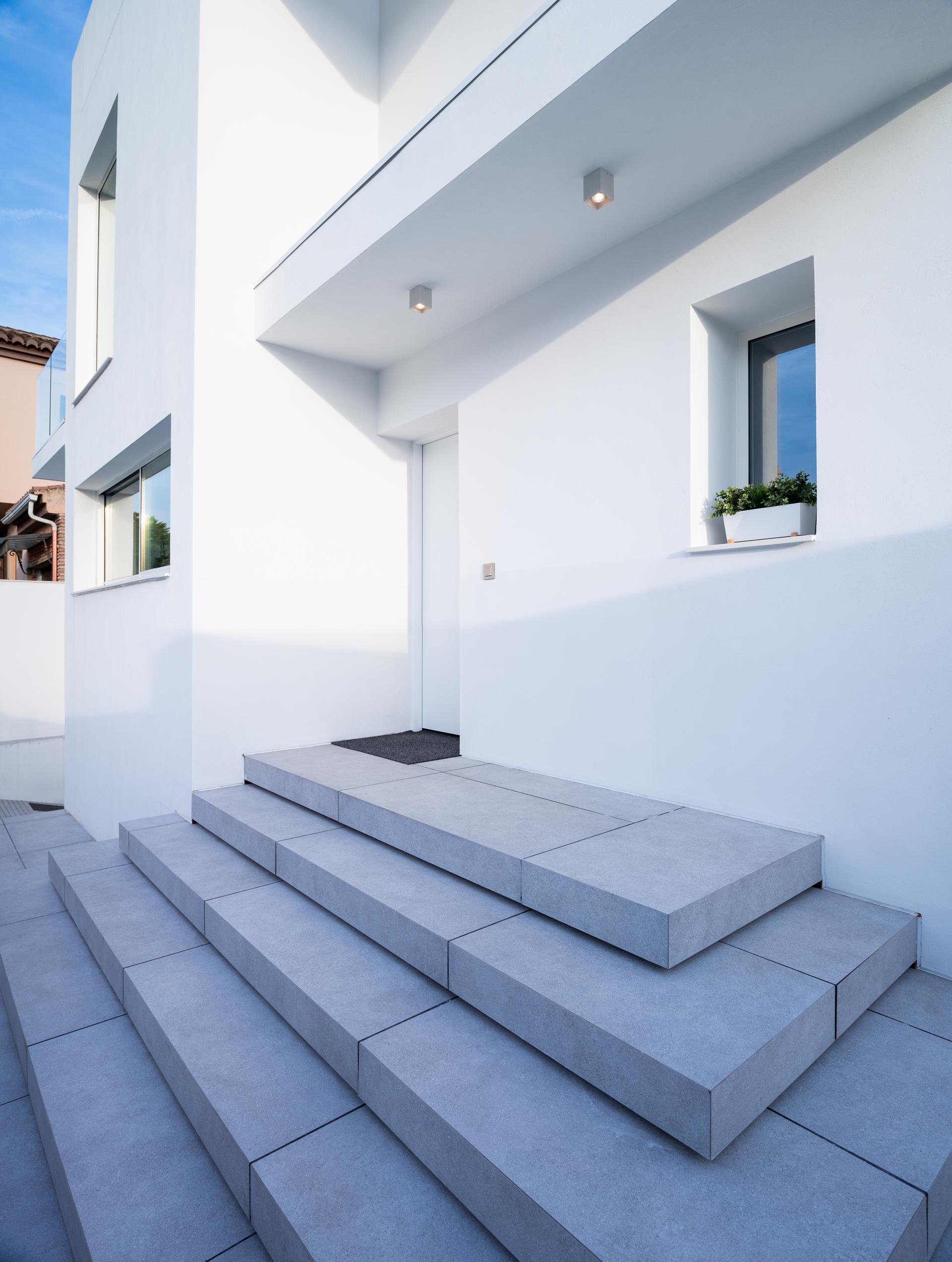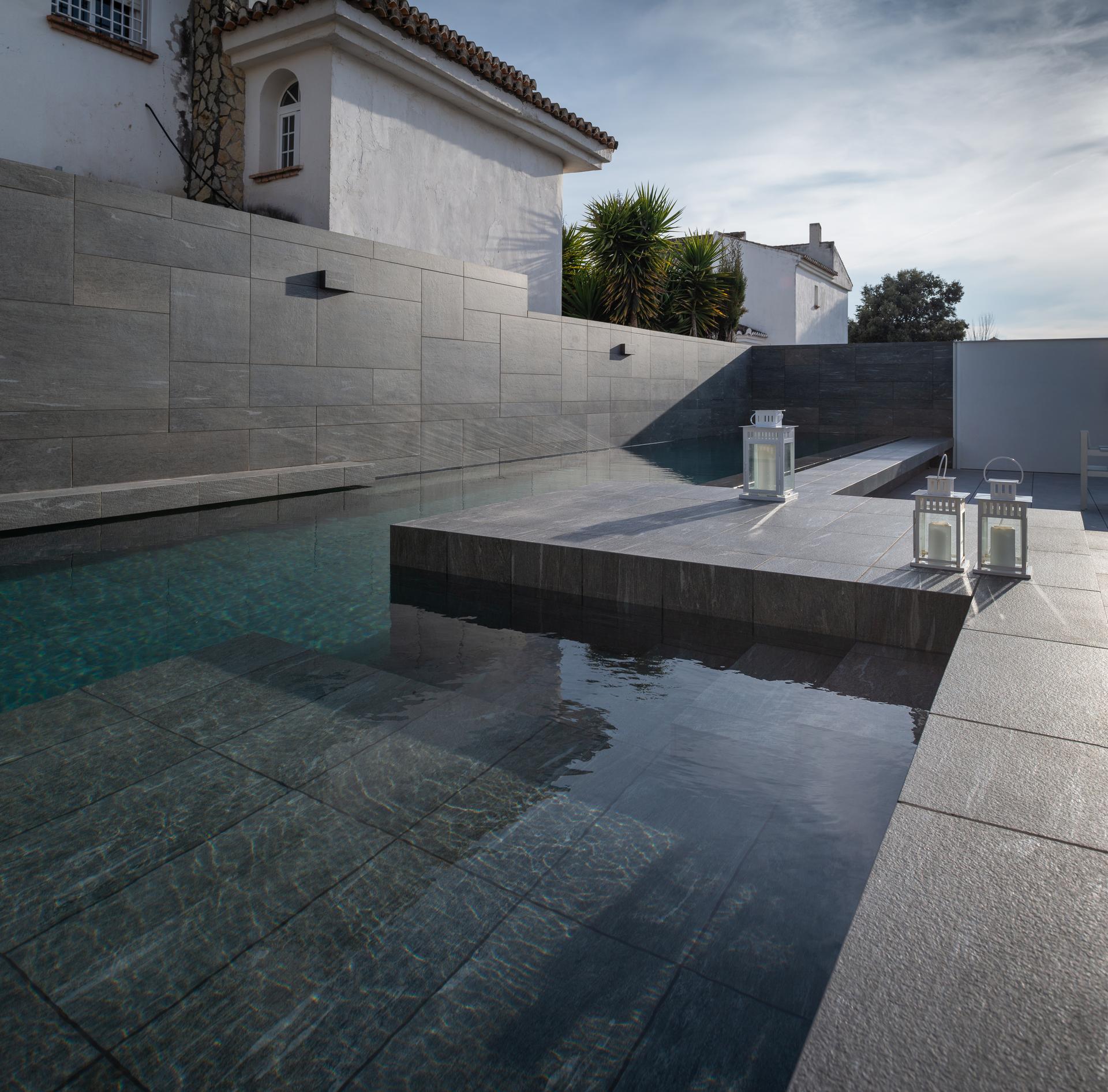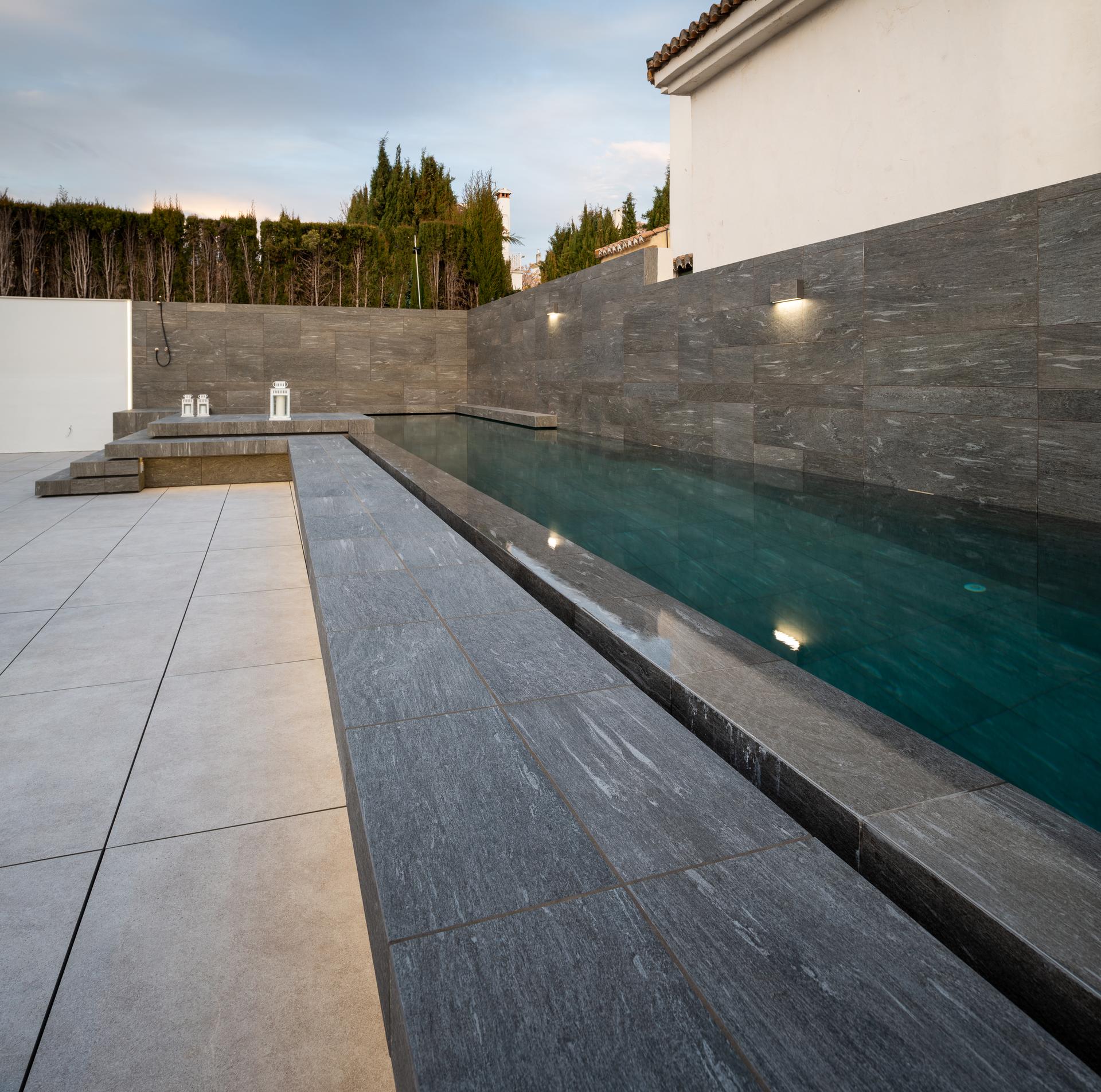 The pool is undoubtedly the project’s playful and relaxing element and it is certainly the most rejuvenating feature: it can be enjoyed all year round thanks to Andalusia’s warm climate. Here, the choice of the Antracite finish from Marazzi’s Mystone Pietra di Vals series, made using High Performance technology, has created a marked chromatic contrast with the light-coloured flooring surrounding the house, as though to define a more natural area characterised by water and quartzite, reproduced with extraordinary accuracy in porcelain stoneware by Marazzi. Mystone Pietra di Vals, which in the various sizes – 60×120, 30×120, 60×60 and 30×60 cm – permits the random installation pattern typical of natural stone, was used not only for the vertical covering featured on the pool and its perimeter walls, but also for the edges, steps and shower area due to its outstanding non-slip properties, tactility and resistance to moisture and weathering.