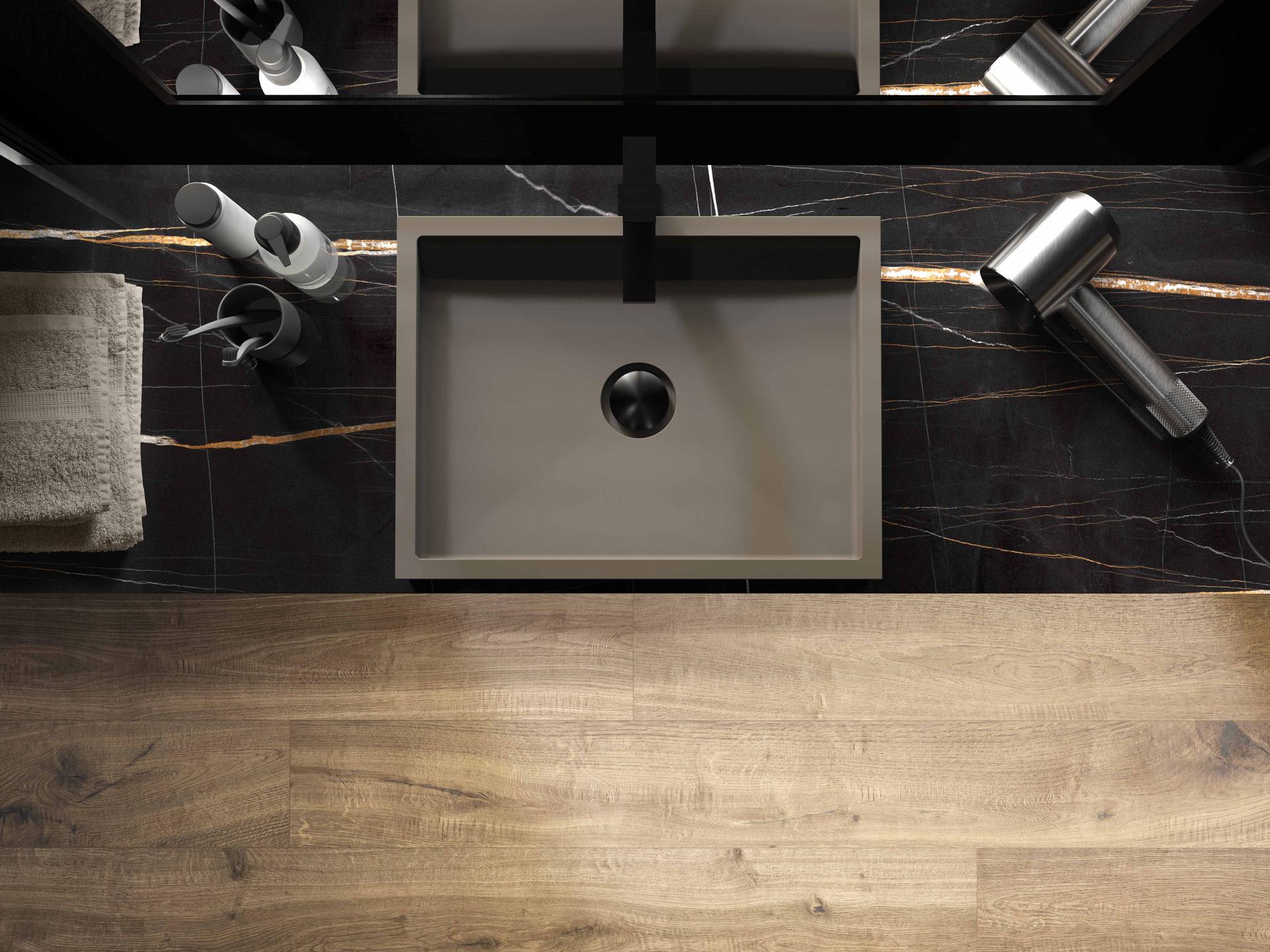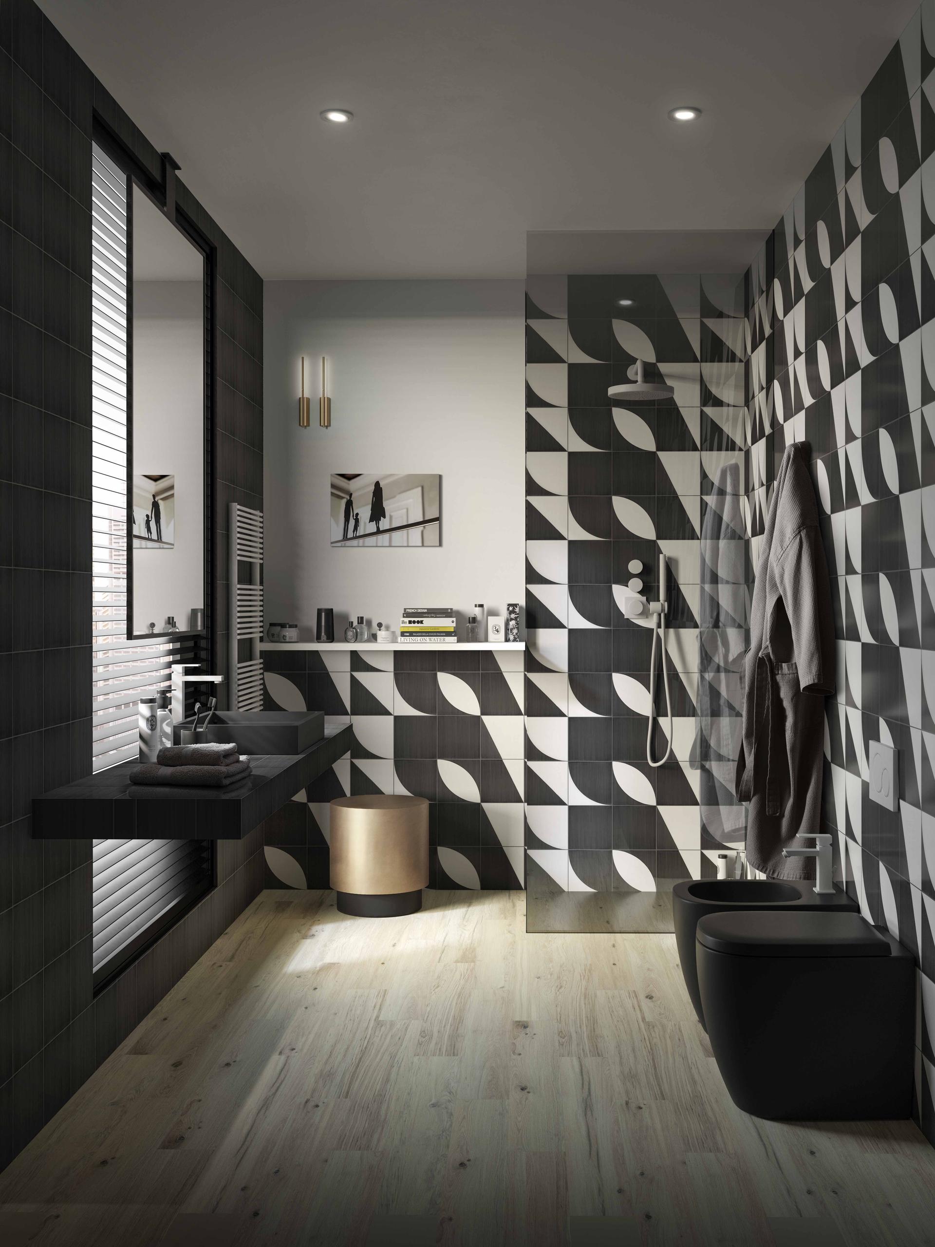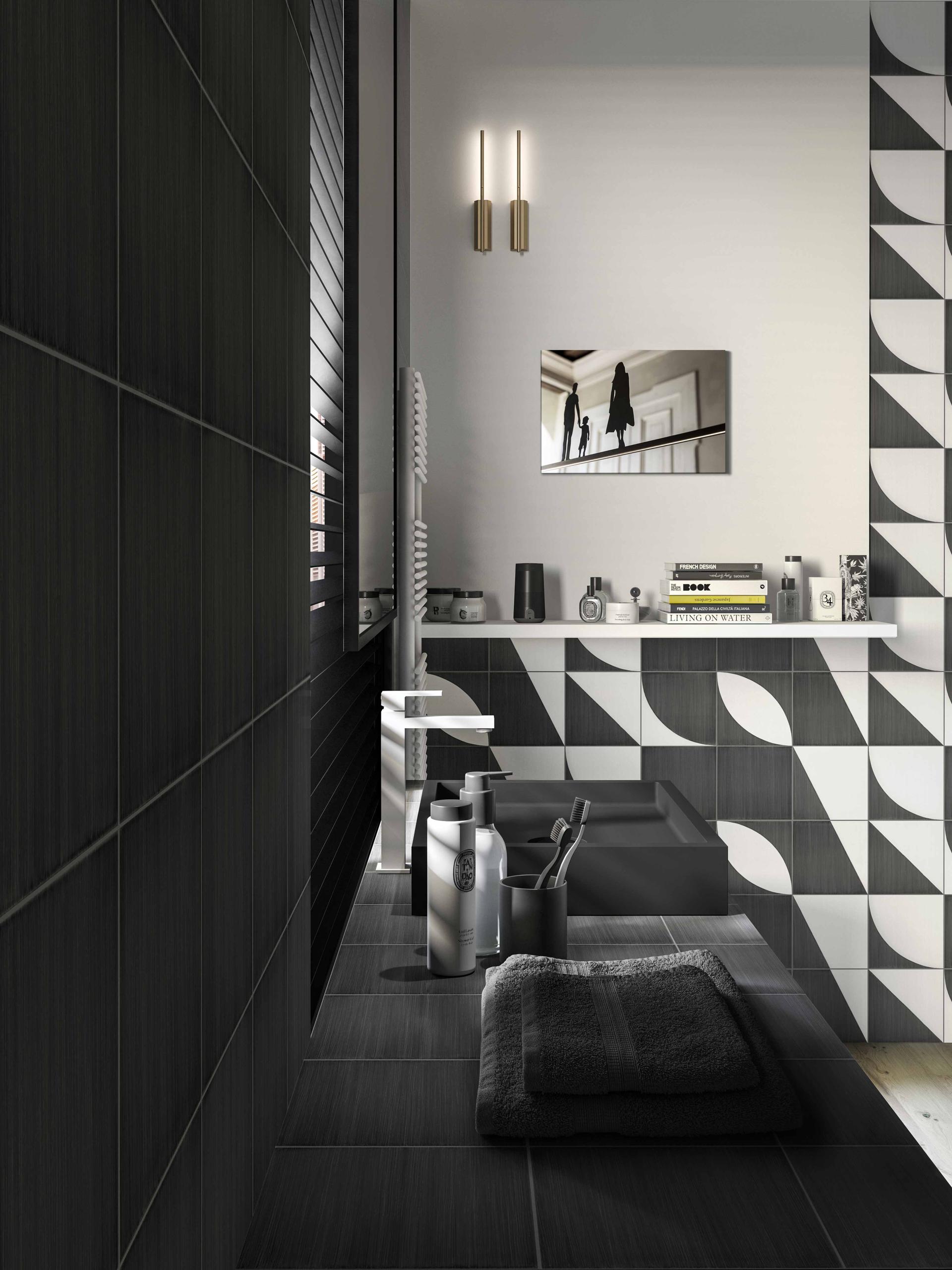 To achieve this result, it just takes a few carefully chosen details: a shower with an elegant combination of glass and fine wall coverings, a hung mirror accompanied by fixtures in the same shades as the coverings. A haven of peace and well-being, a very contemporary idea of luxury. The choice of texture combinations plays, once again, a decisive role: the first design preview features Grande Marble Look Sahara Noir marble combined with Vero wood in the Castagno finish; in the second, the Scenario Decoro Mix Nero is harmoniously balanced with the Treverklook White collection laid on the floor.