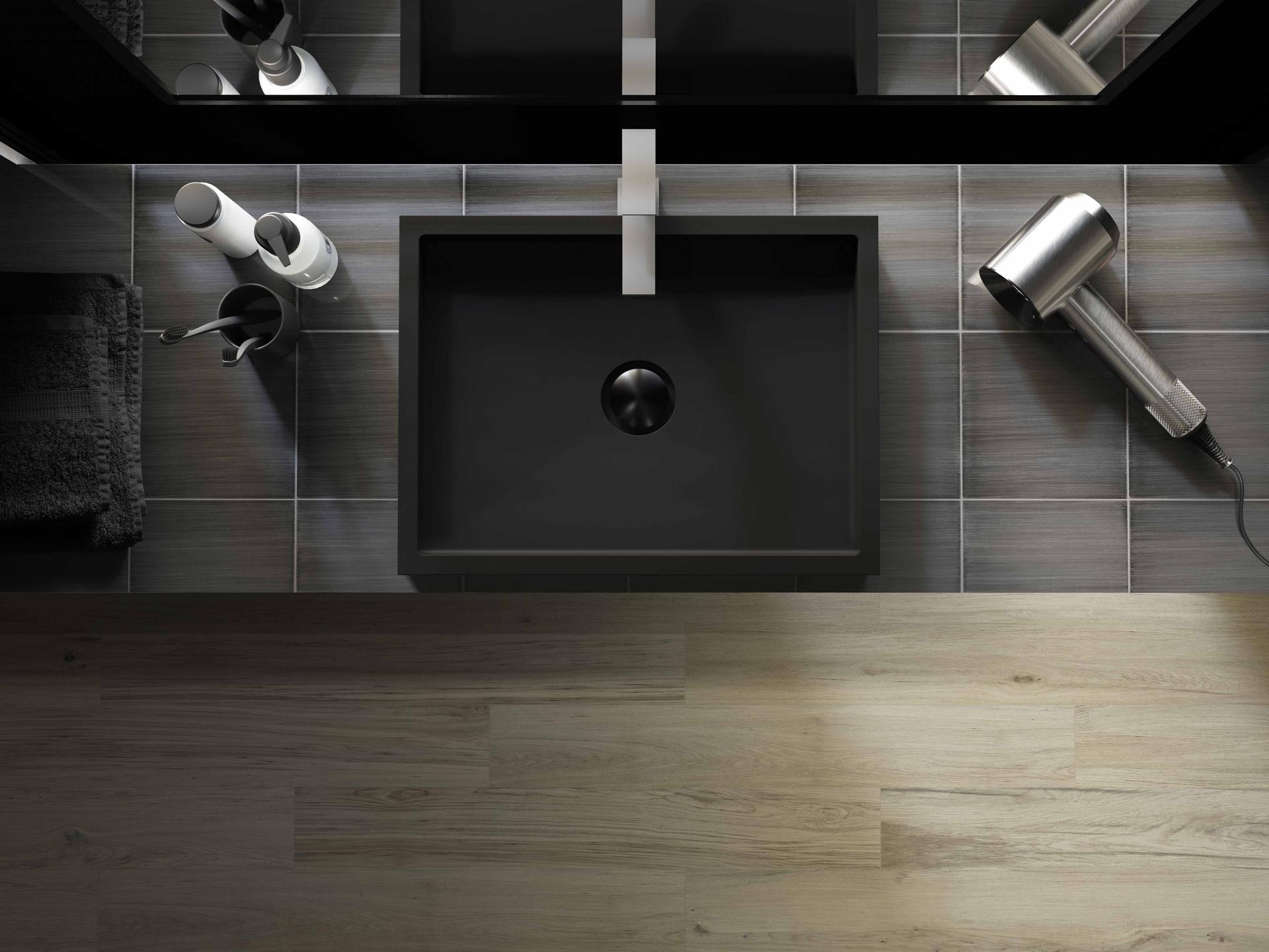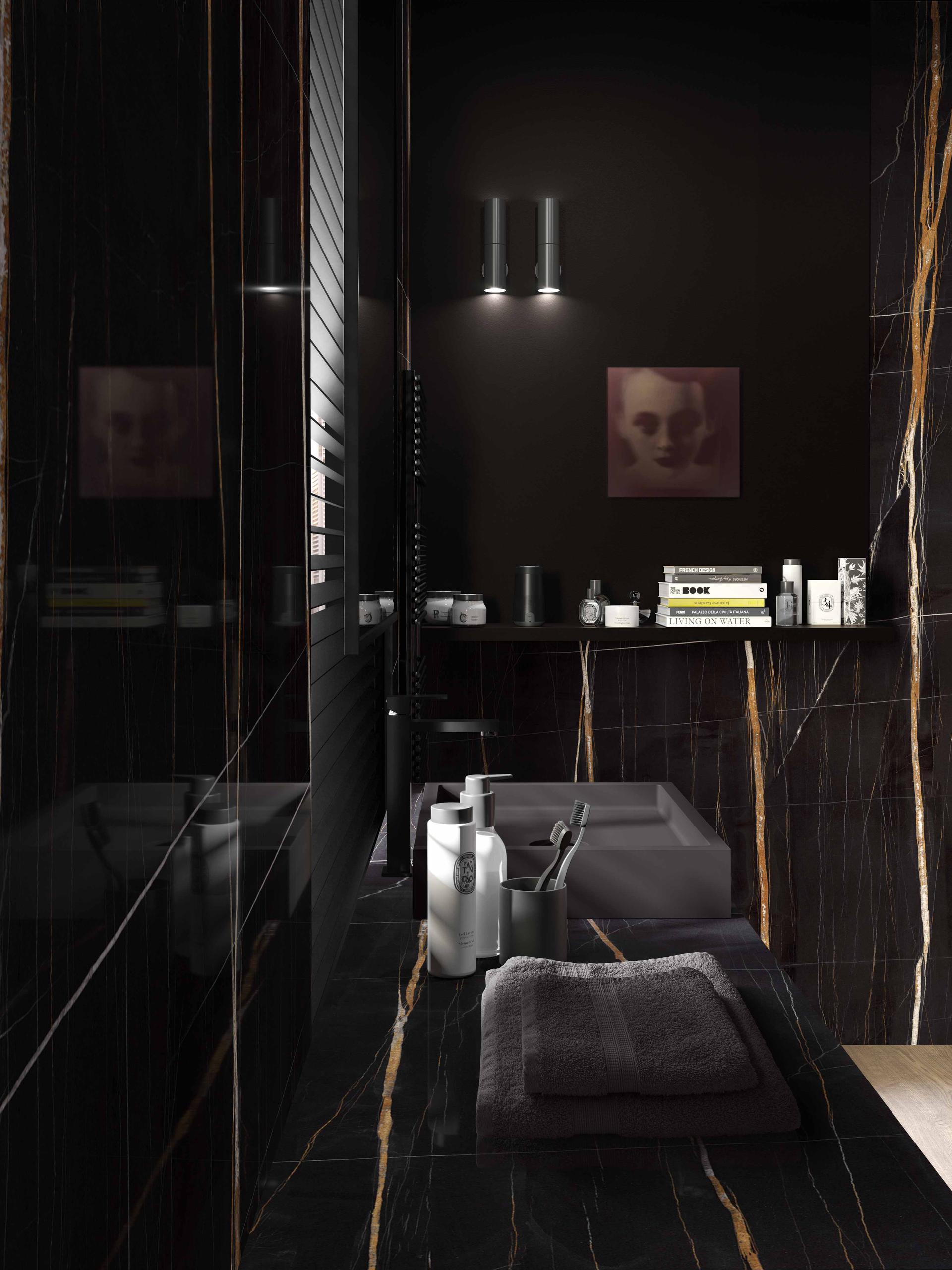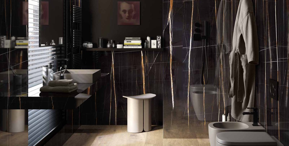 To achieve this result, it just takes a few carefully chosen details: a shower with an elegant combination of glass and fine wall coverings, a hung mirror accompanied by fixtures in the same shades as the coverings. A haven of peace and well-being, a very contemporary idea of luxury. The choice of texture combinations plays, once again, a decisive role: the first design preview features Grande Marble Look Sahara Noir marble combined with Vero wood in the Castagno finish; in the second, the Scenario Decoro Mix Nero is harmoniously balanced with the Treverklook White collection laid on the floor.
