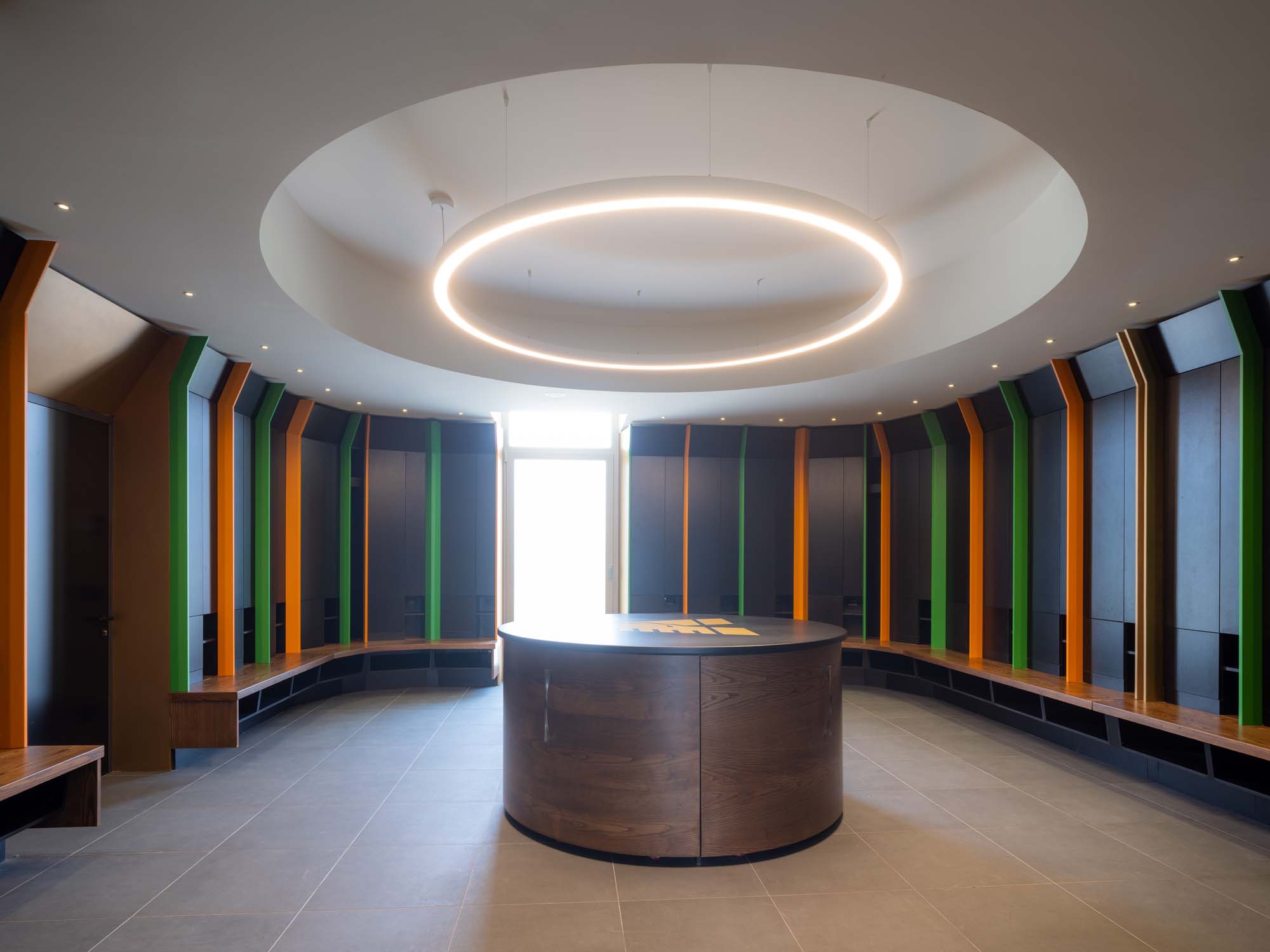 In the building’s interior spaces, from the changing rooms to the offices and sanitary facilities, Cementum porcelain stoneware is the main choice, in different colours, ranging from lighter Ash and Nickel to darker Carbon, sizes and surfaces for all floor and wall coverings in the football venue. A material that not only lends a contemporary aesthetic to the spaces, but also guarantees high performance, produced with recycled materials and the most advanced Marazzi Premium Technologies, perfectly adapting to the needs of this dynamic sports environment. This material also contributes to LEED credits thanks to its certifications.