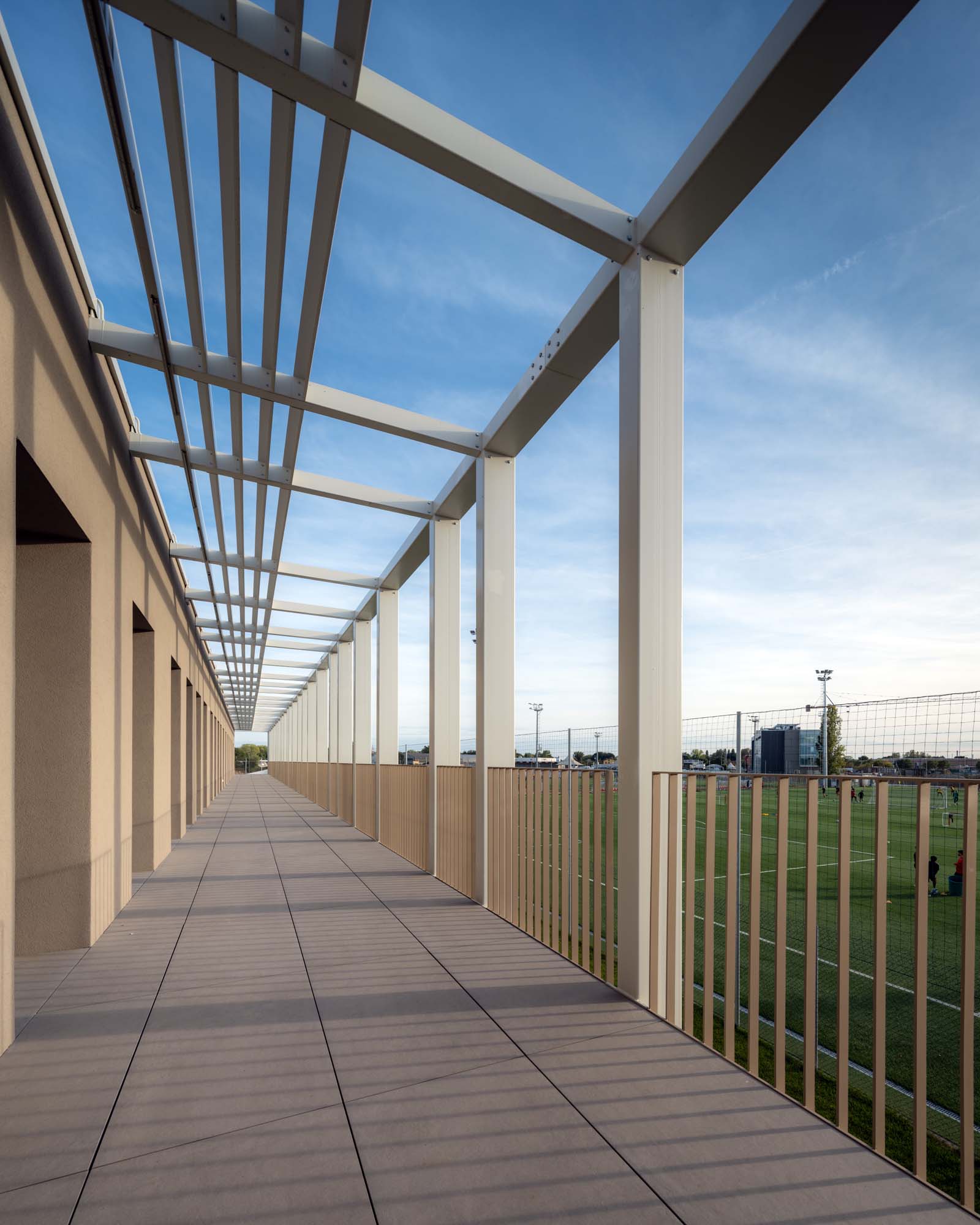One of the project’s distinctive architectural elements is the loggia that surrounds the building, offering panoramic views of the surrounding football fields. For the exterior, the designers opted for a floating floor using the same concrete-effect collection in the 60×120 cm size in a 20 mm version (Cementum20). The raised floor features highly effective technology since it creates a continuous void under the floor surface that can be utilized to route technical systems.