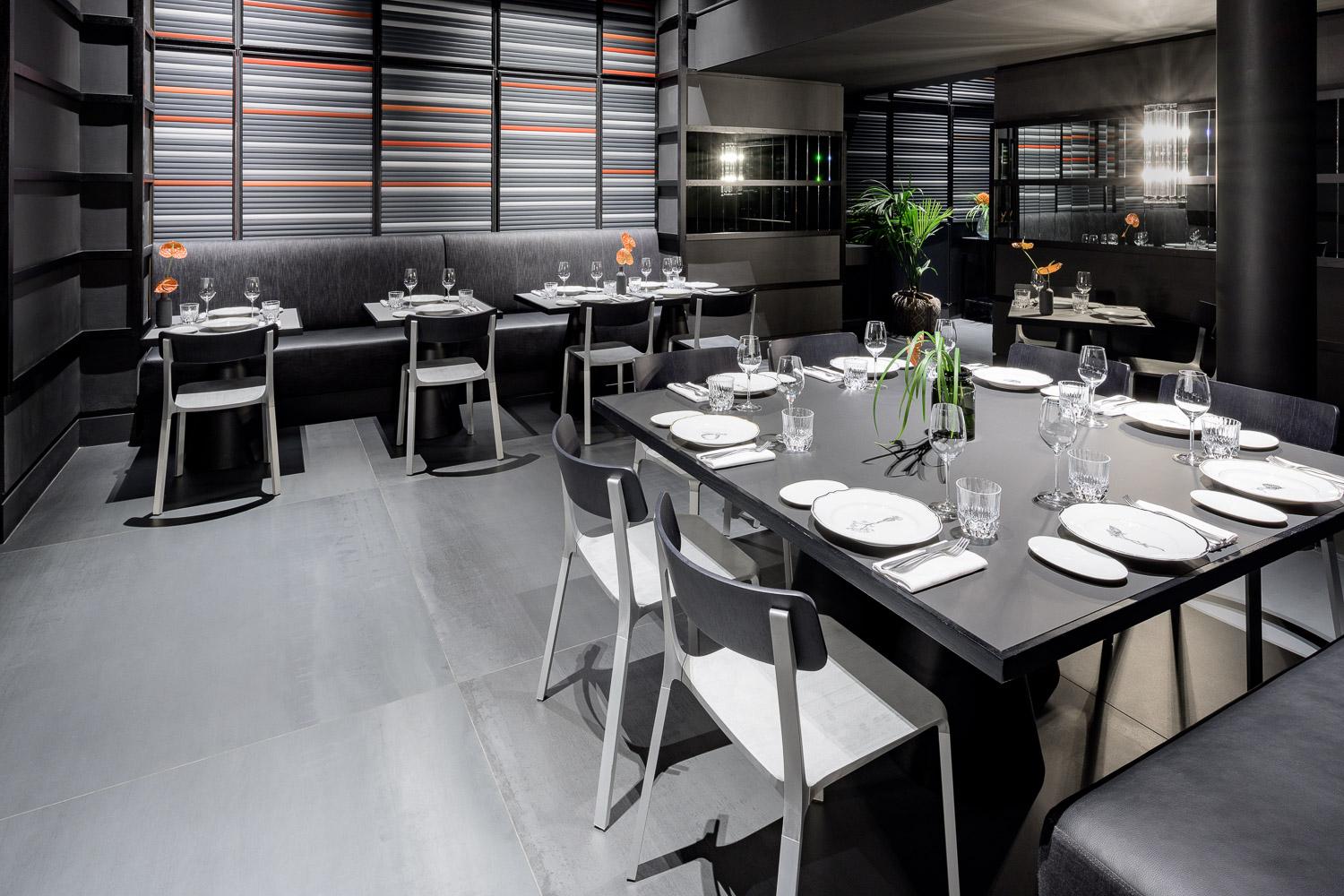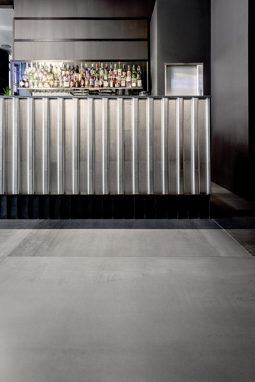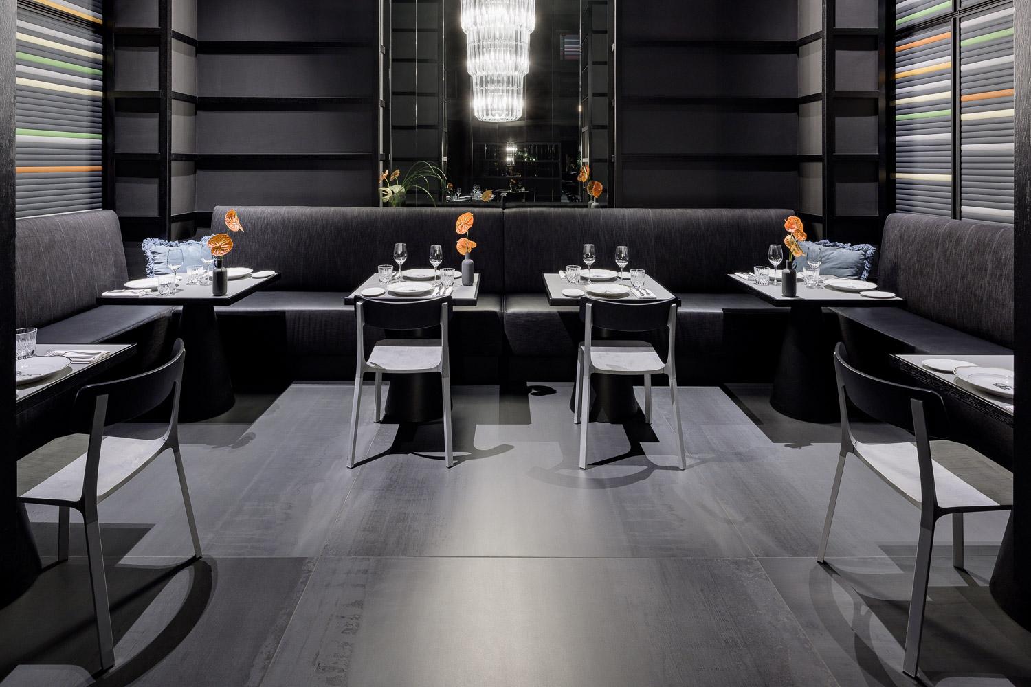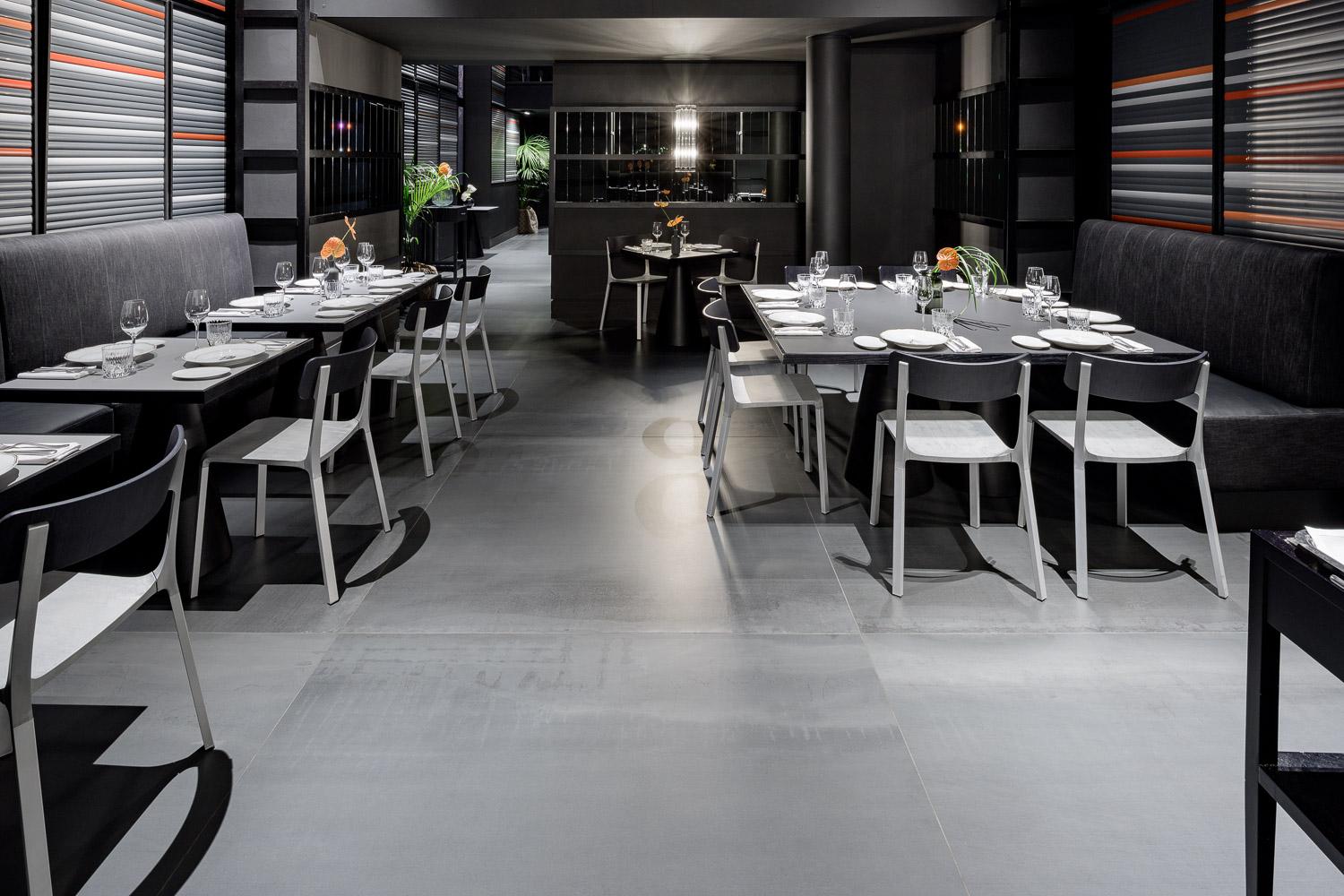 An underground bistro in which Gio Tirotto’s interior design plays with the dark shades and iridescent reflections of Grande Metal Look stoneware