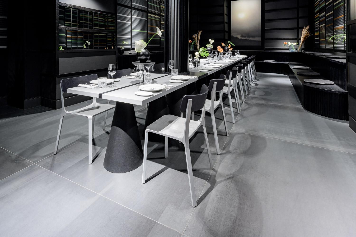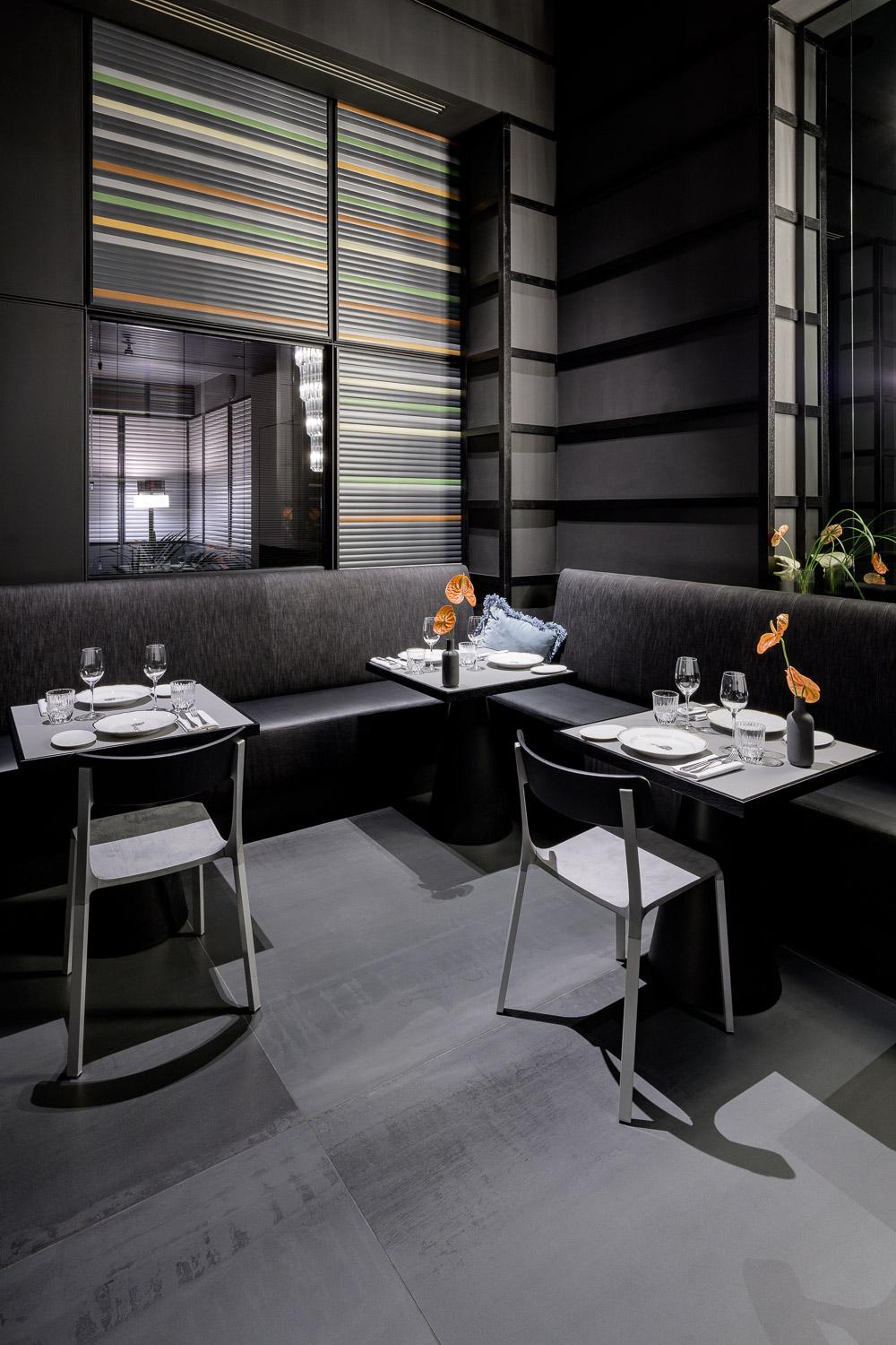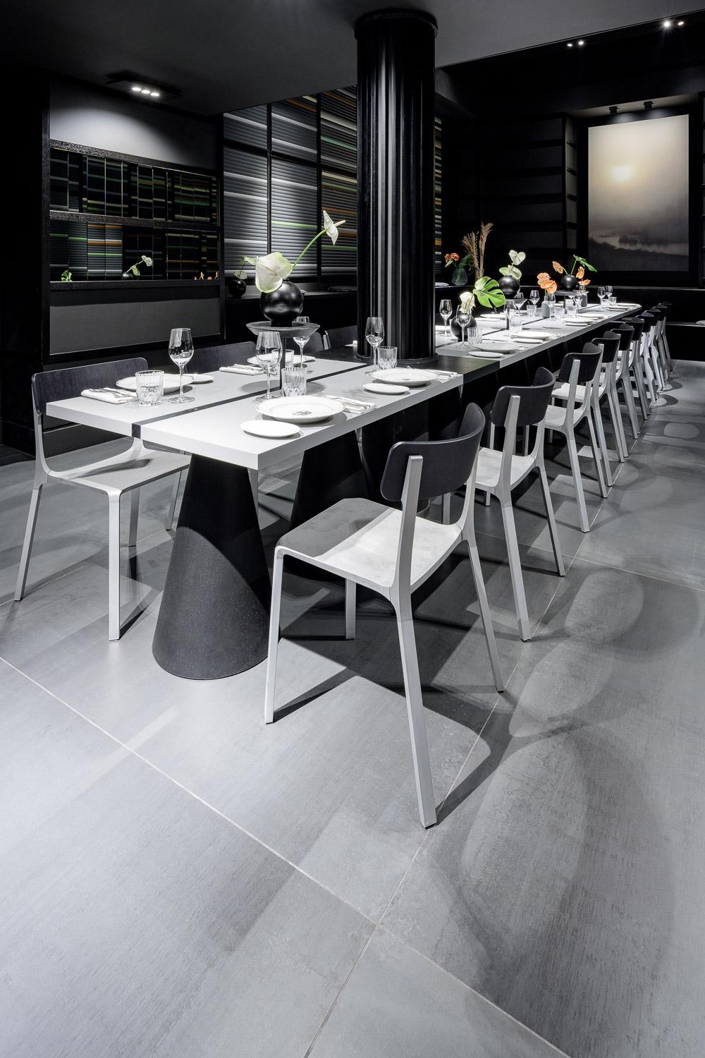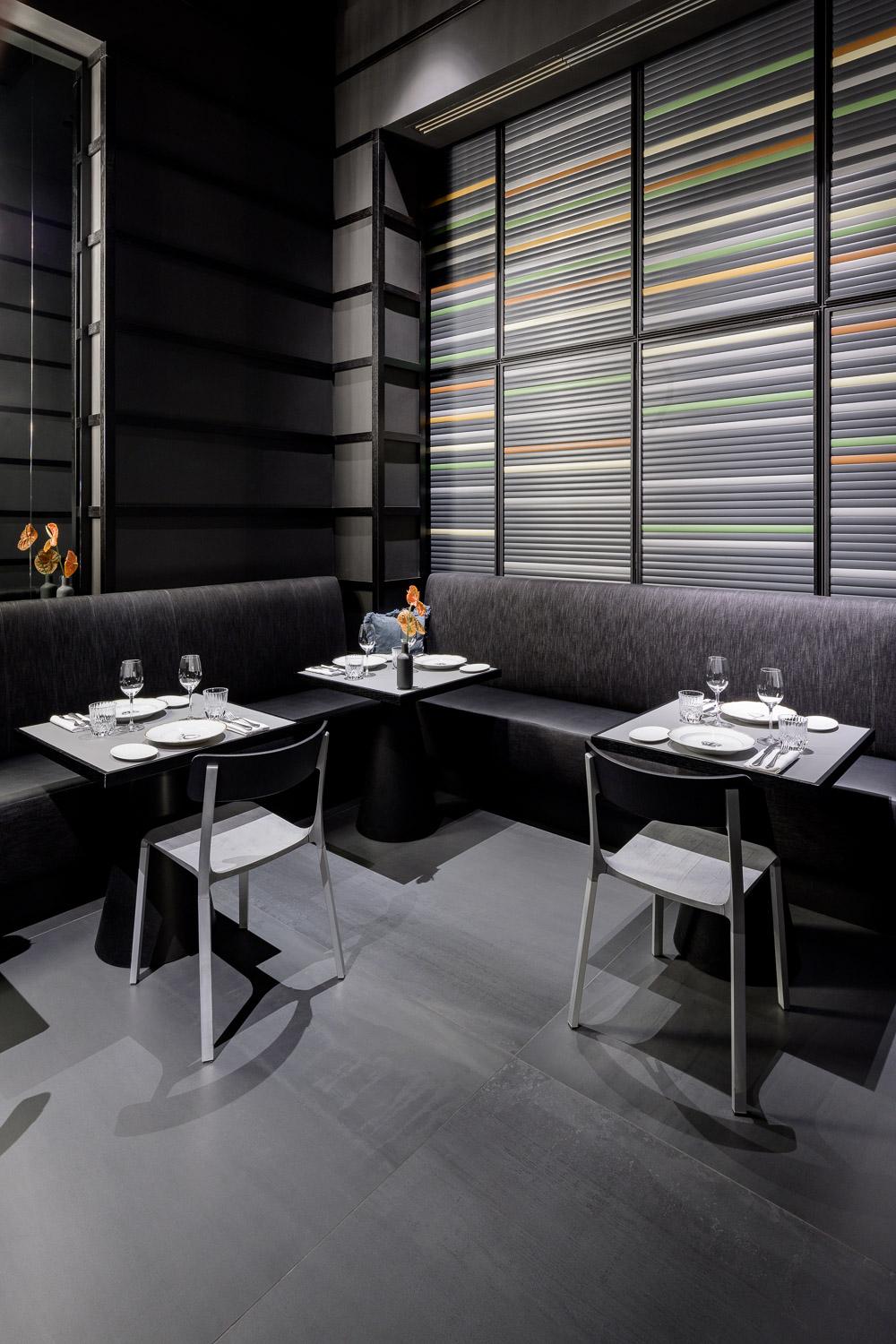 An underground bistro in which Gio Tirotto’s interior design plays with the dark shades and iridescent reflections of Grande Metal Look stoneware
