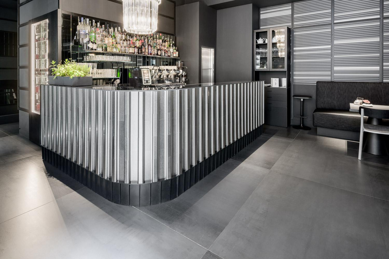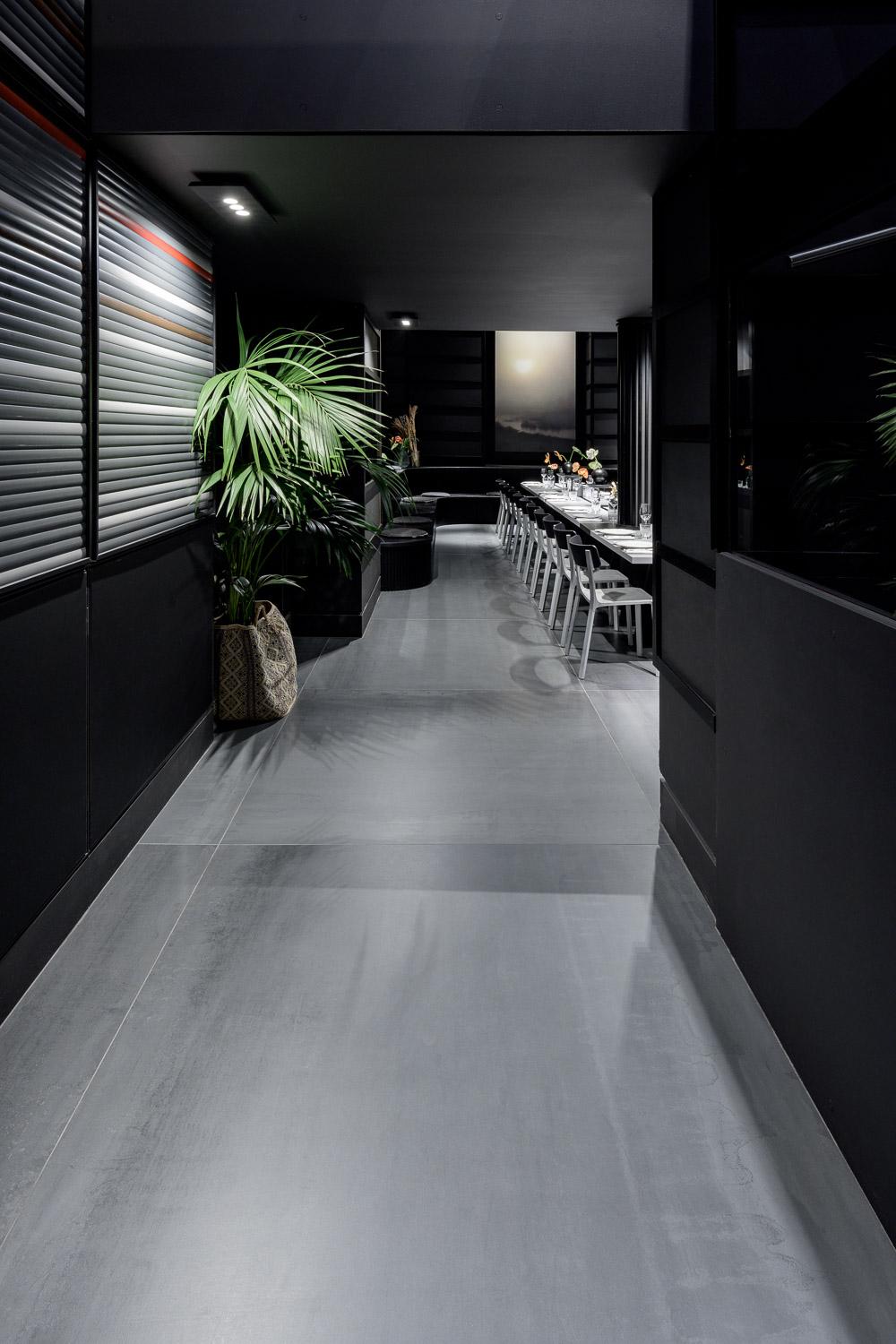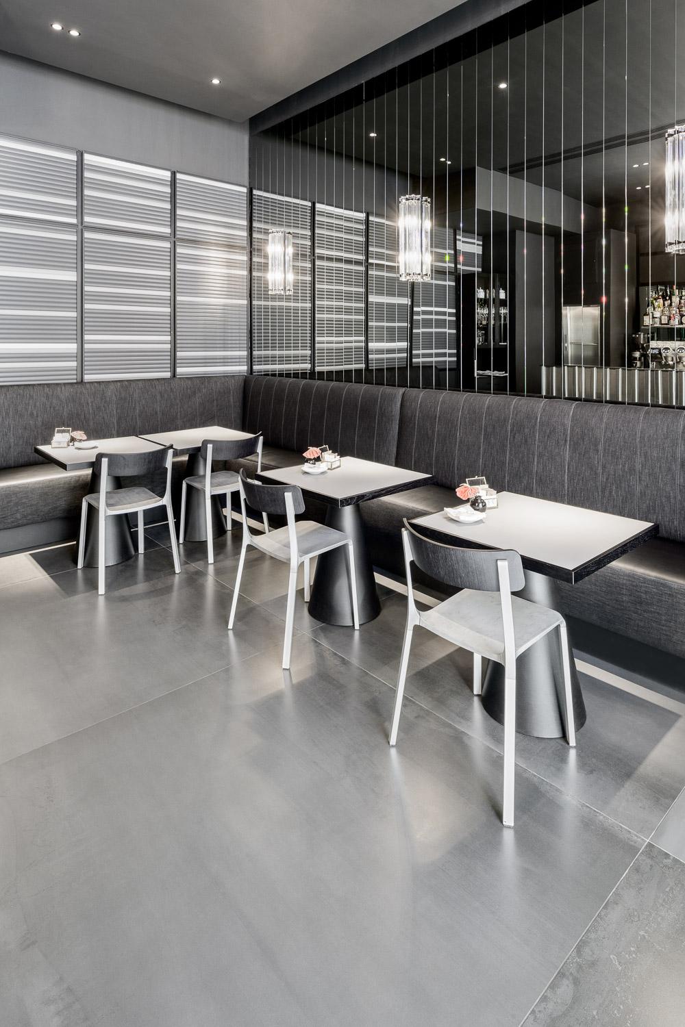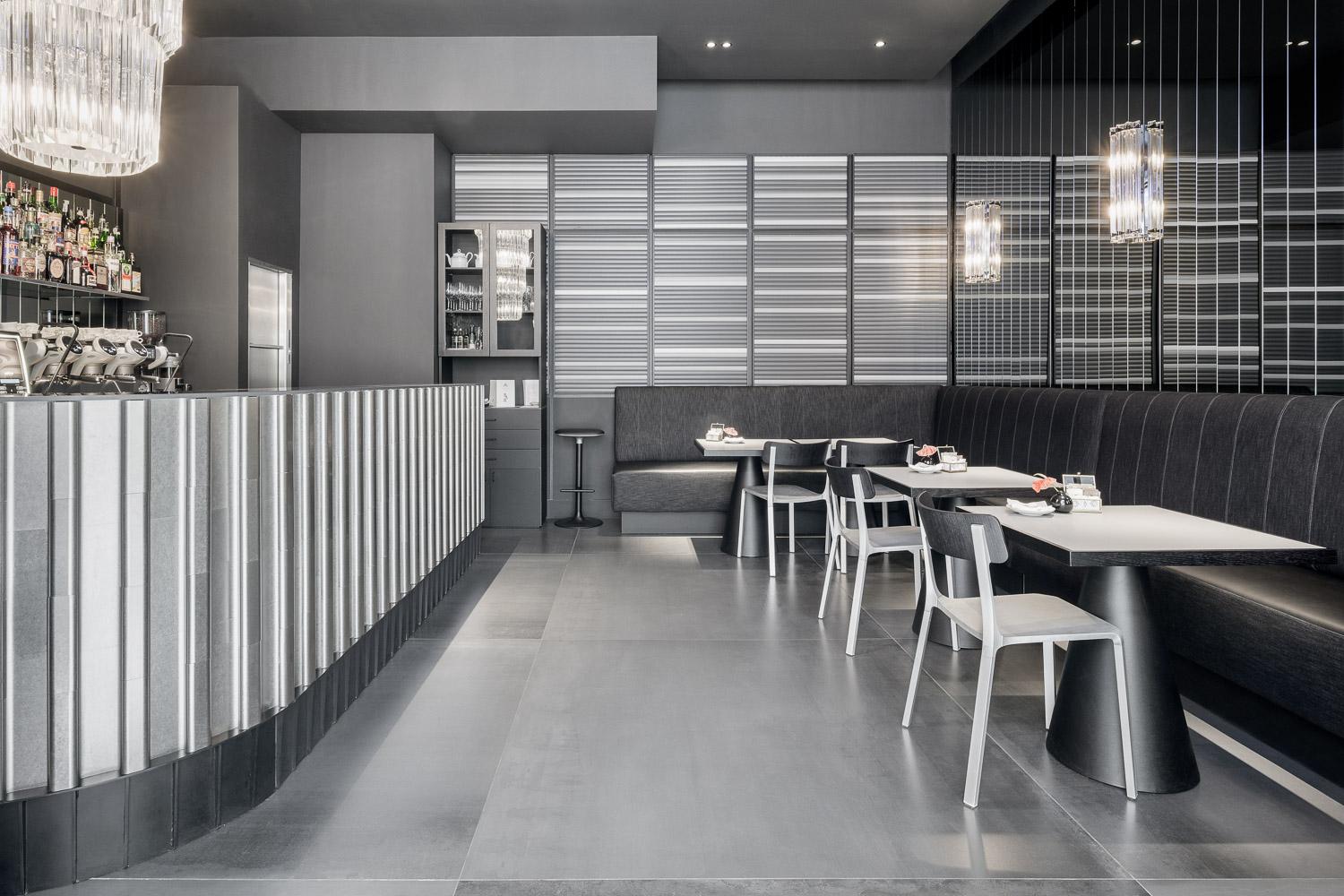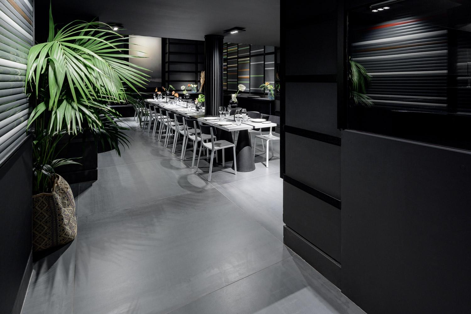 An underground bistro in which Gio Tirotto’s interior design plays with the dark shades and iridescent reflections of Grande Metal Look stoneware