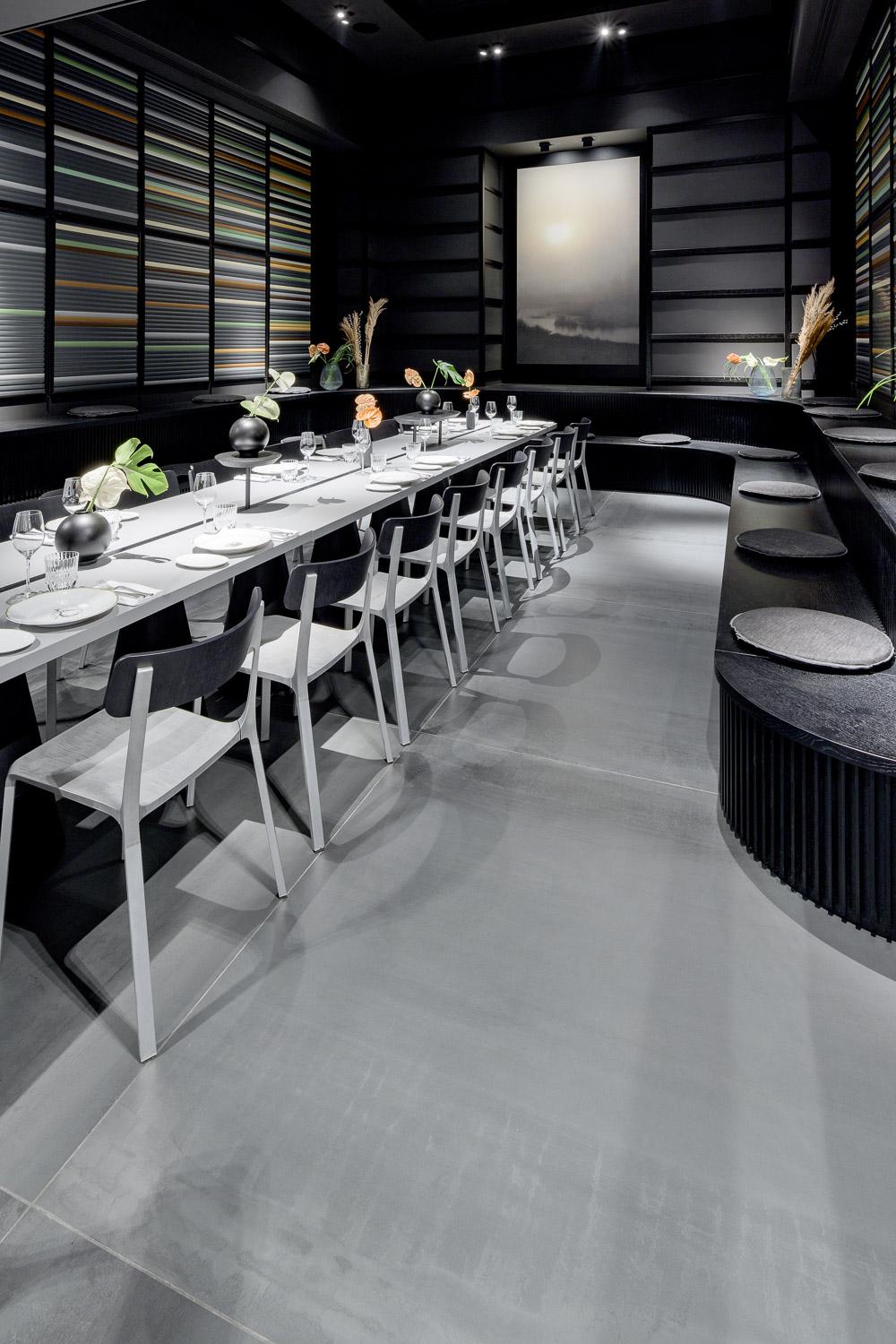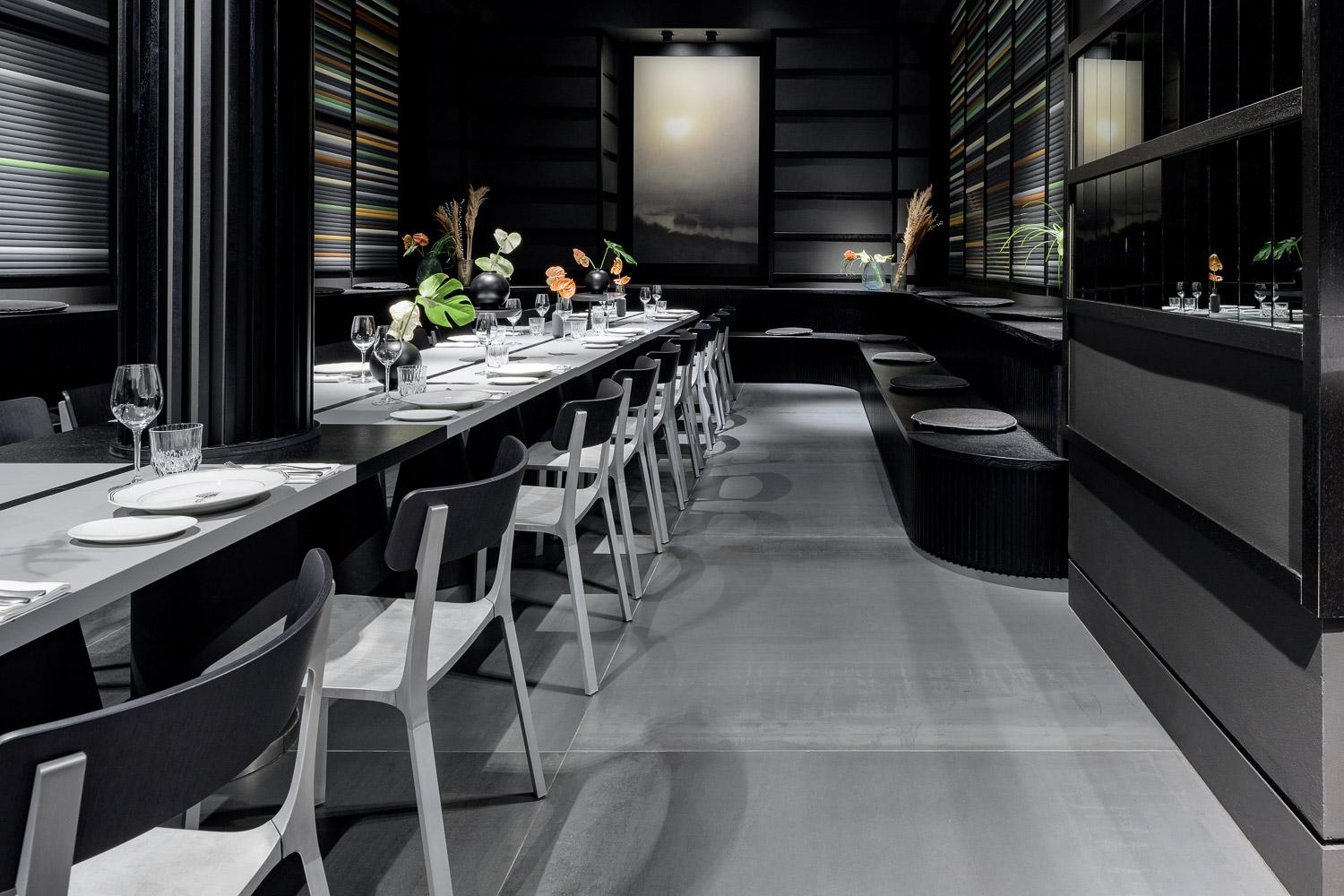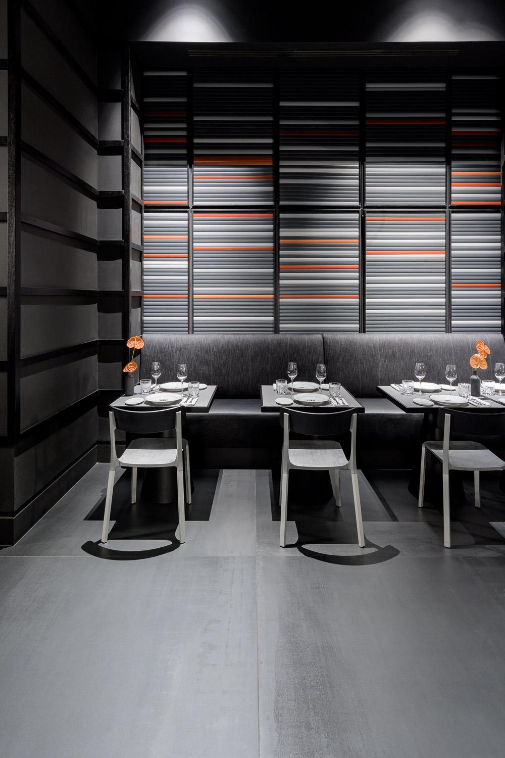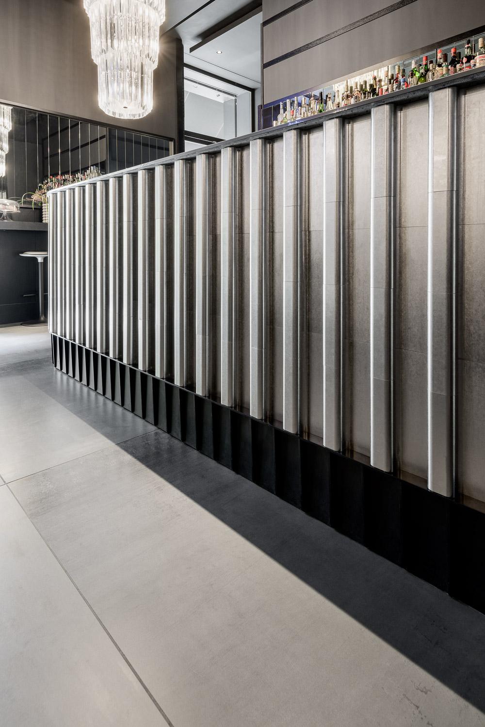 An underground bistro in which Gio Tirotto’s interior design plays with the dark shades and iridescent reflections of Grande Metal Look stoneware