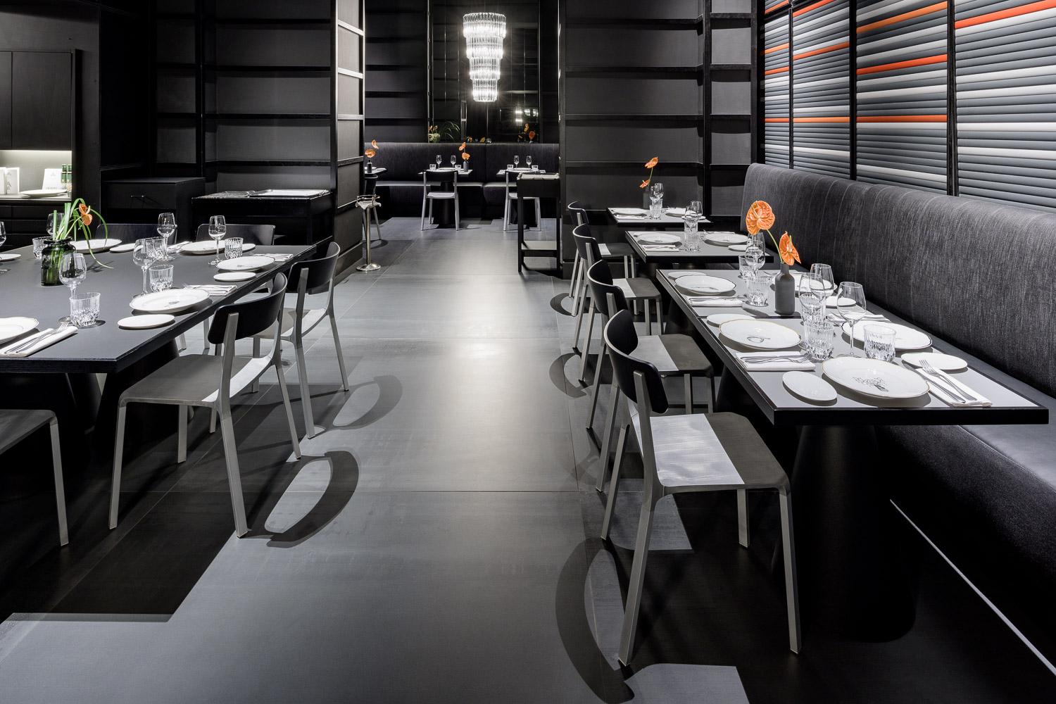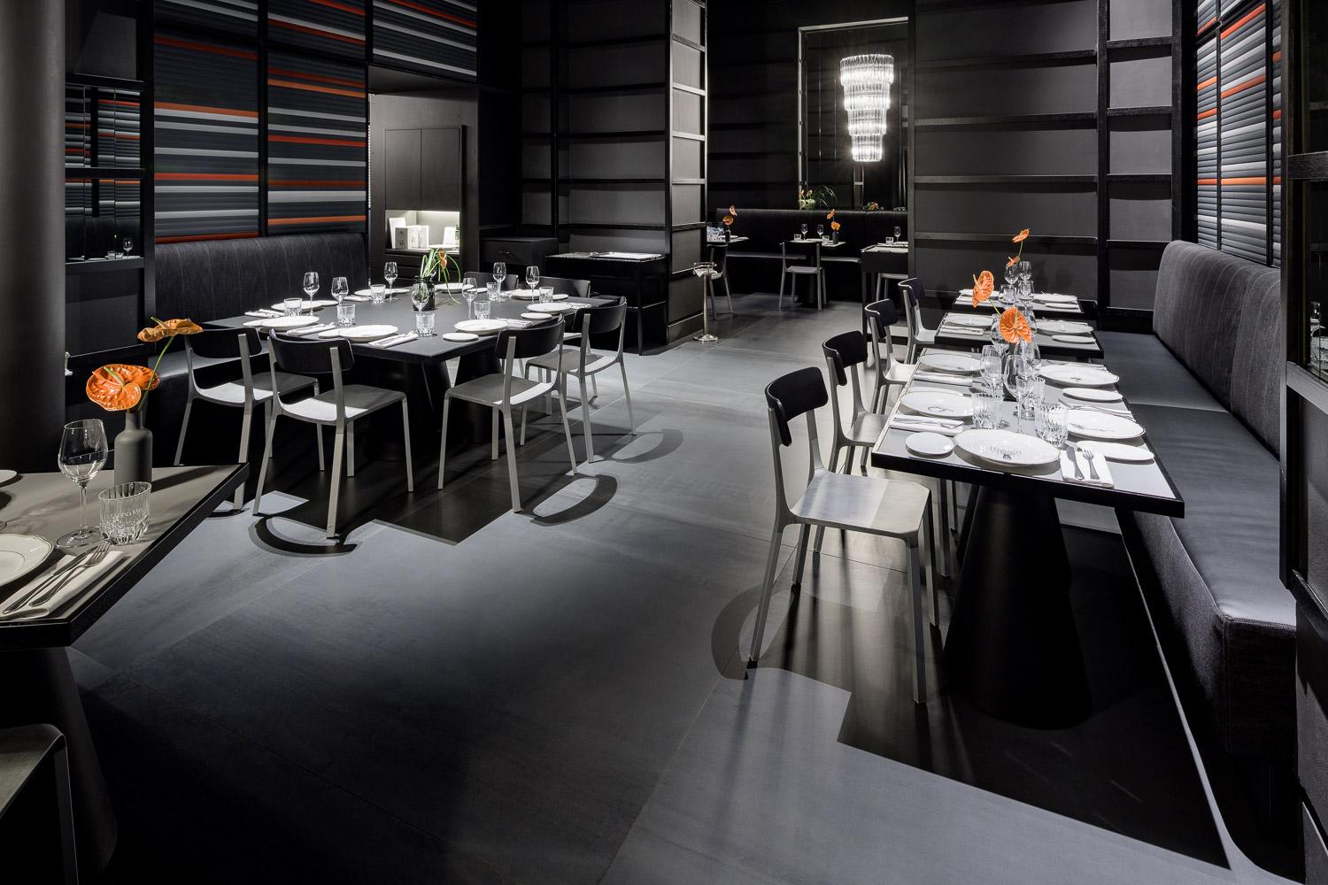 The restaurant’s unconventional style is immediately apparent in the bar entrance area on the street, which features a pewter-effect steel counter topped by a sculptural Venini chandelier, sofas upholstered in black washed denim and raw aluminium chairs. From here, a staircase leads to floor – 2, which is split into various rooms. One notable room is designed as an amphitheatre, in which guests can try cocktails and easy-gourmet dishes in an informal way, seated on the two black oak steps of the podium. At the centre, the scene is dominated by the long social table, a stylistic and conceptual hallmark of the Carlo e Camilla format, which is designed for sharing the culinary and spatial experience.