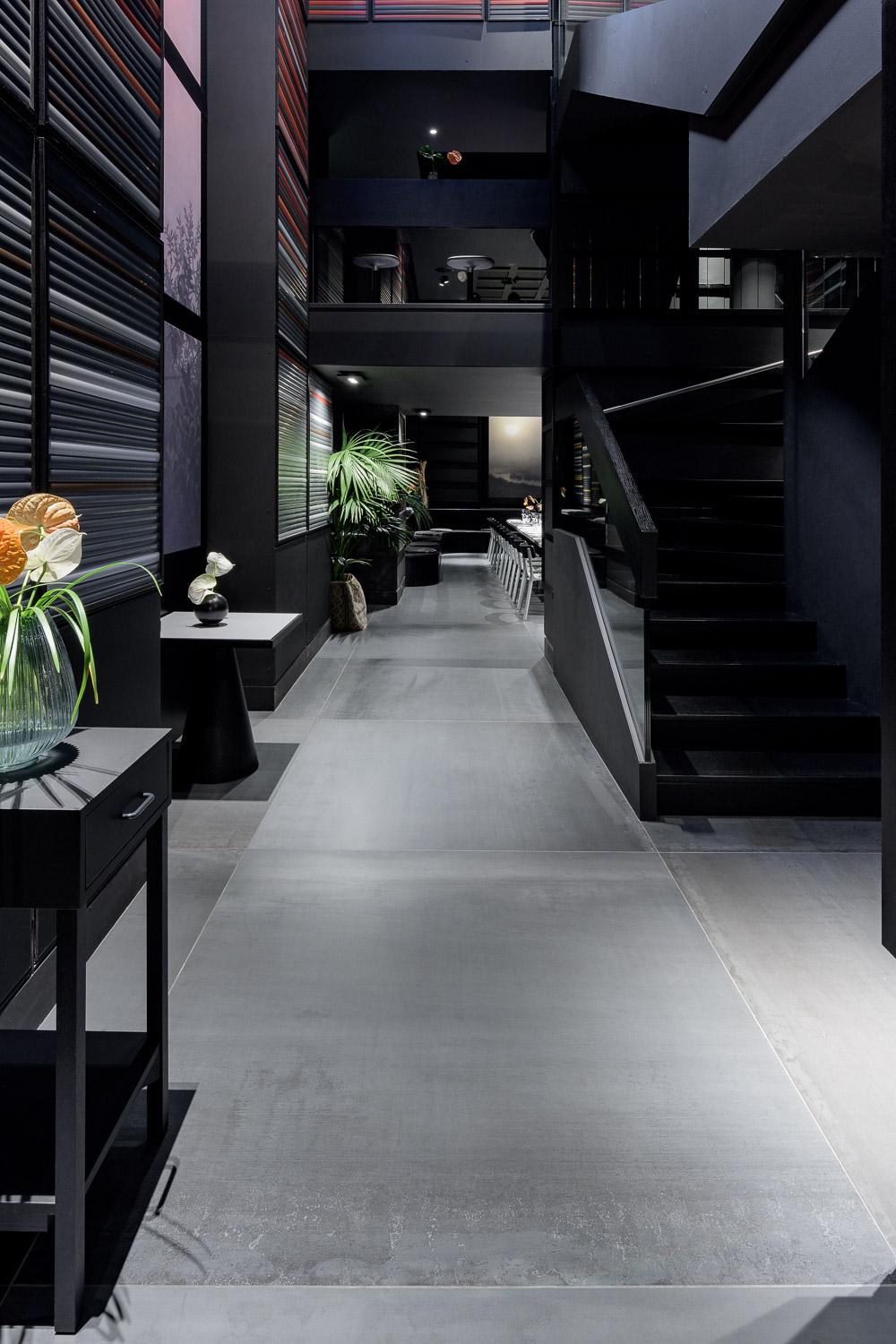 The building envelope emphasizes the surreal dimension of the rooms. The Fenix boiserie features striking colour streaks and paintings of misty landscapes, (spray on canvas) works by the well-known writer Eron “in total chromatic harmony with the modular cladding that serves as a skin for the entire building”. A skin which, on the floor, gives the space a further sensory charge thanks to its dynamic metallic reflections, in perfect harmony with the raw details of the furnishings. It consists of extra-large, slimline (6 mm) porcelain stoneware from the Grande Metal Look series. For the project, Marazzi supplied a large 160×160 cm custom size, obtained by cutting 160×320 cm slabs, confirming its ability to respond to a designer’s every need with tailored support. In this case, there was a technical requirement for a high-performance, low-maintenance, seamless and above all expressive floor. The mineral charm of the Iron Dark colour variant responds, with great linguistic coherence, to a desire to give the space a strong, tactile and urban-chic character.