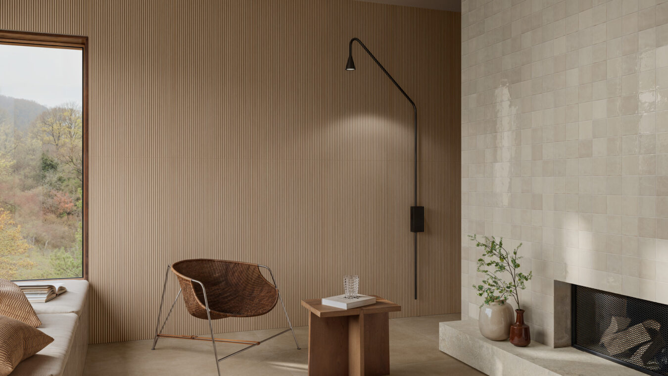 Tone-on-tone combinations are an attractive strategy for creating tasteful interiors with a relaxing look. One example is the pairing of a taupe floor with warm grey walls, a very common choice in open-plan living rooms: Marazzi’s Mystone Pietra di Sicilia and Slow Cold collections are perfect for anyone wishing to achieve visual continuity.