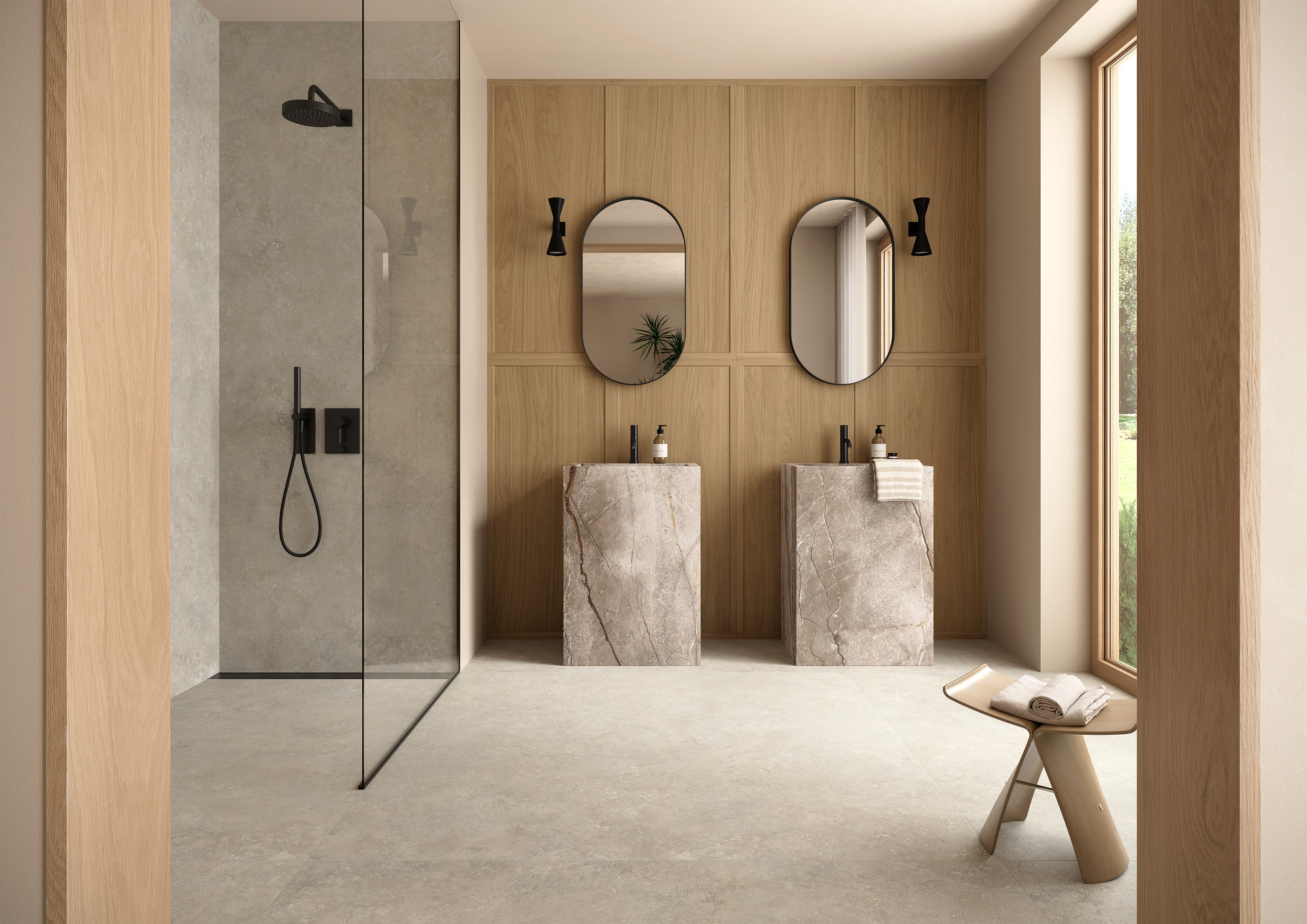 When you choose a floor in a neutral shade such as beige or taupe, it’s fundamental to create a coordinated dialogue between the horizontal and vertical surfaces. These delicate colours offer great versatility with regard to combinations, but still require care to avoid a result that’s too dull or lacking in personality.