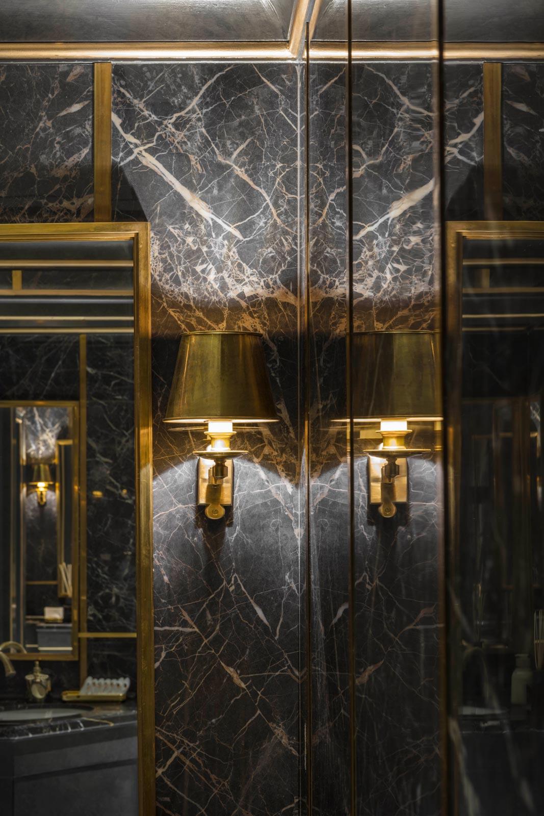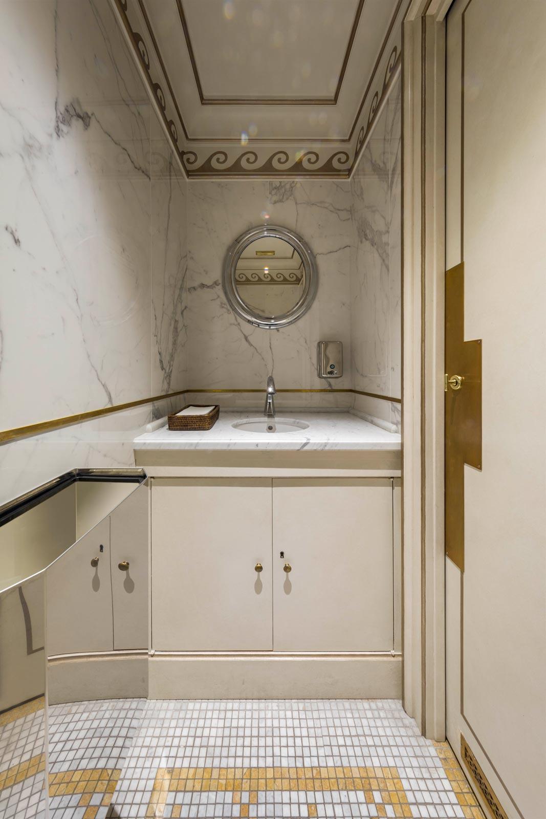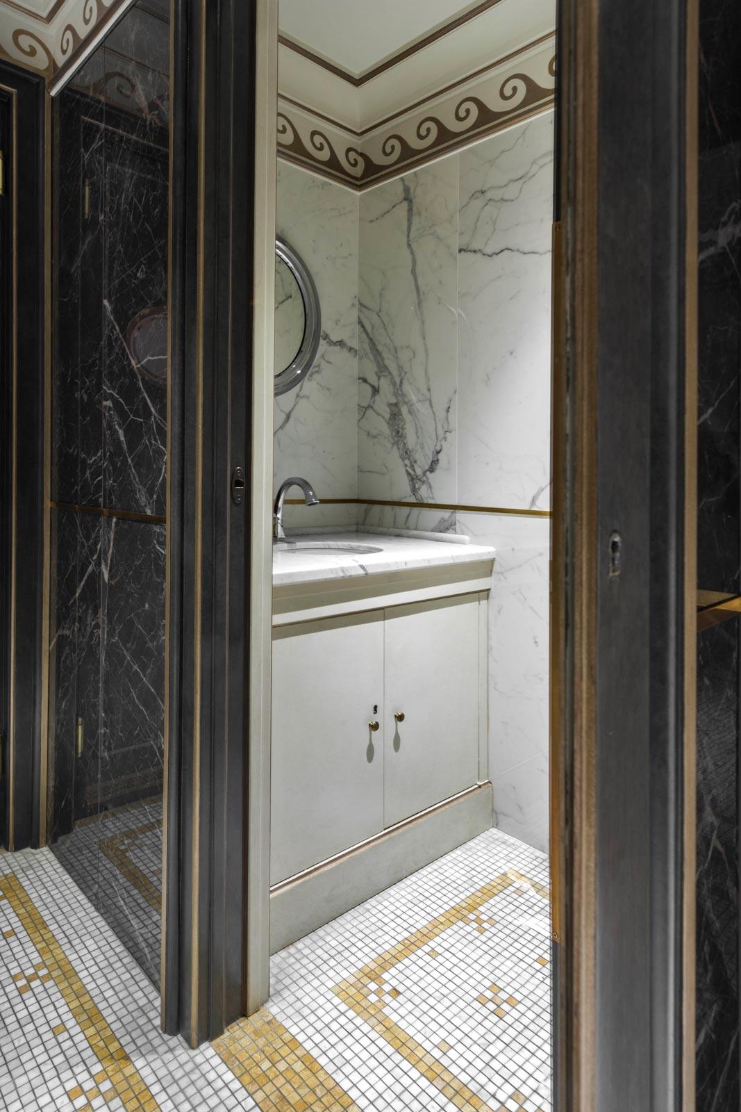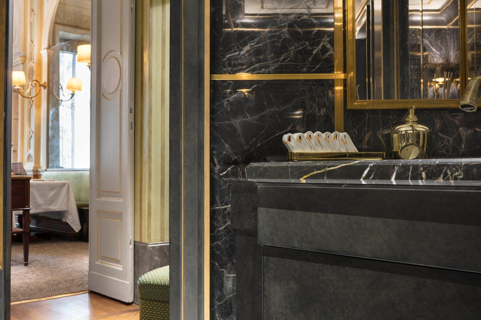 In the elegant washrooms, the Allmarble marble-effect stoneware by Marazzi, in the glossy Saint Laurent and Statuario finishes, dialogues skilfully with the natural marble, with which it provides a fine match, while the Mystone Lavagna stone-effect stoneware was chosen for the floor coverings of all the technical areas, including the kitchens.