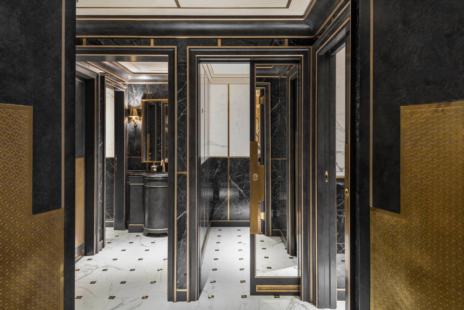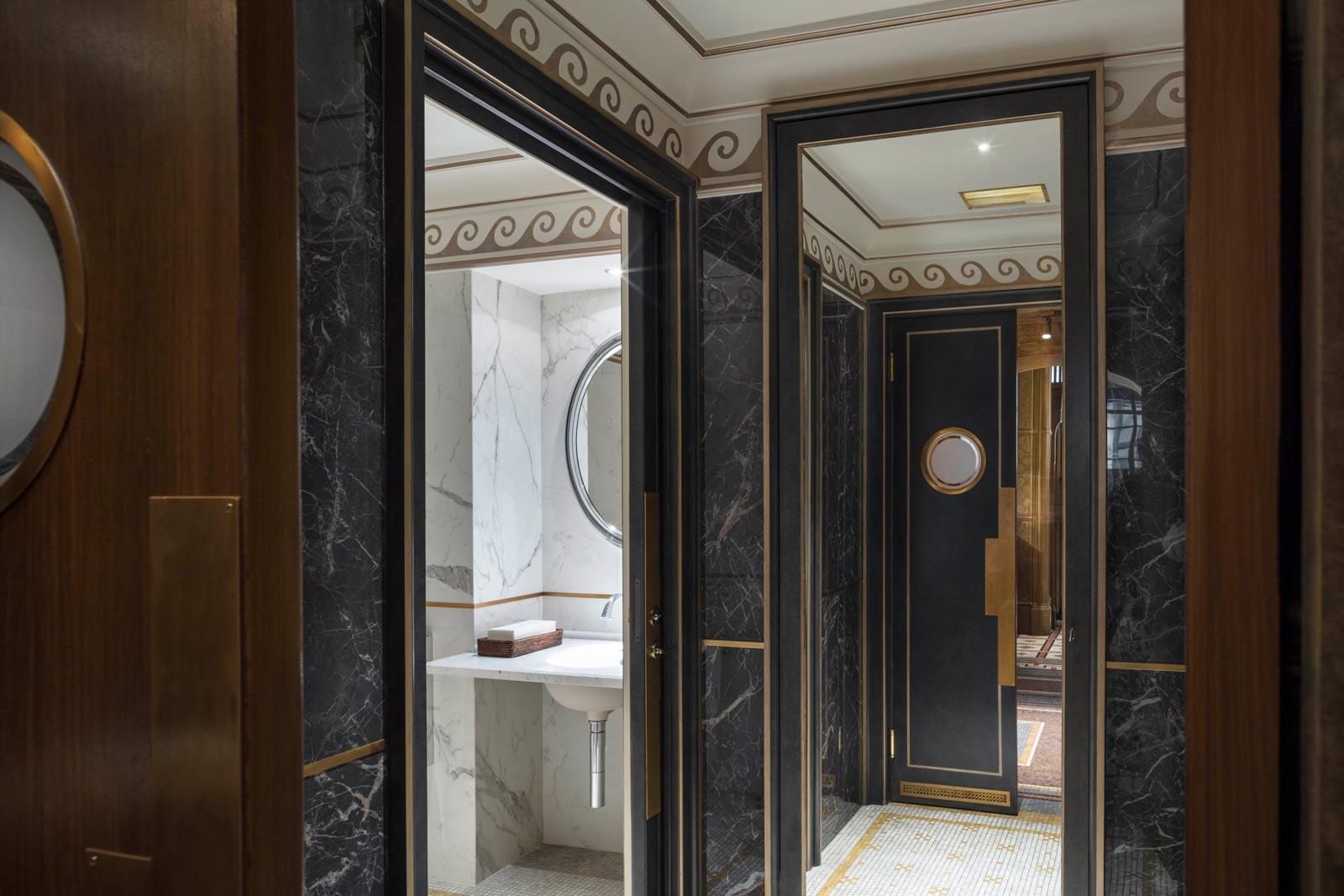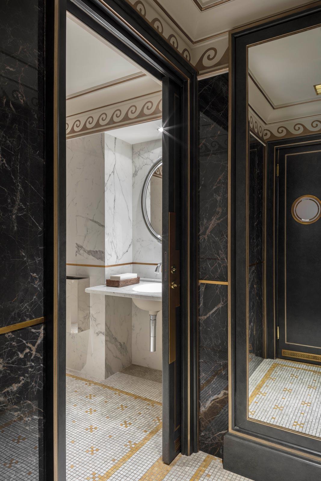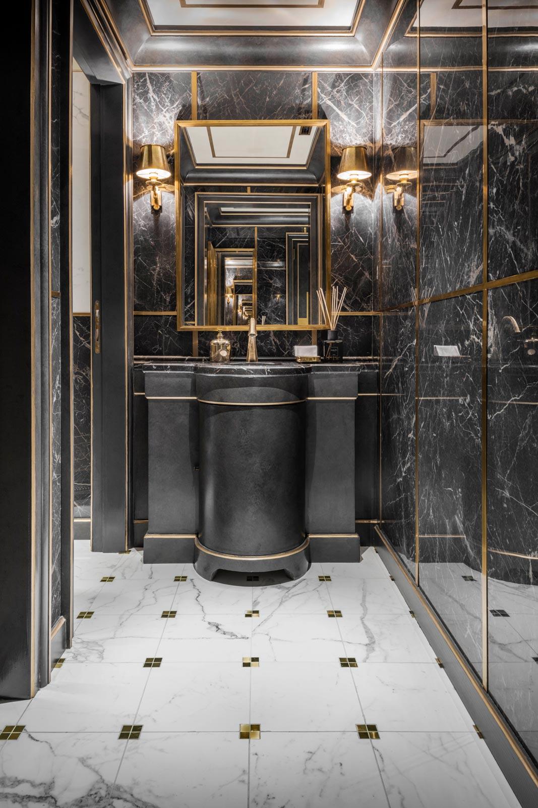 In the elegant washrooms, the Allmarble marble-effect stoneware by Marazzi, in the glossy Saint Laurent and Statuario finishes, dialogues skilfully with the natural marble, with which it provides a fine match, while the Mystone Lavagna stone-effect stoneware was chosen for the floor coverings of all the technical areas, including the kitchens.