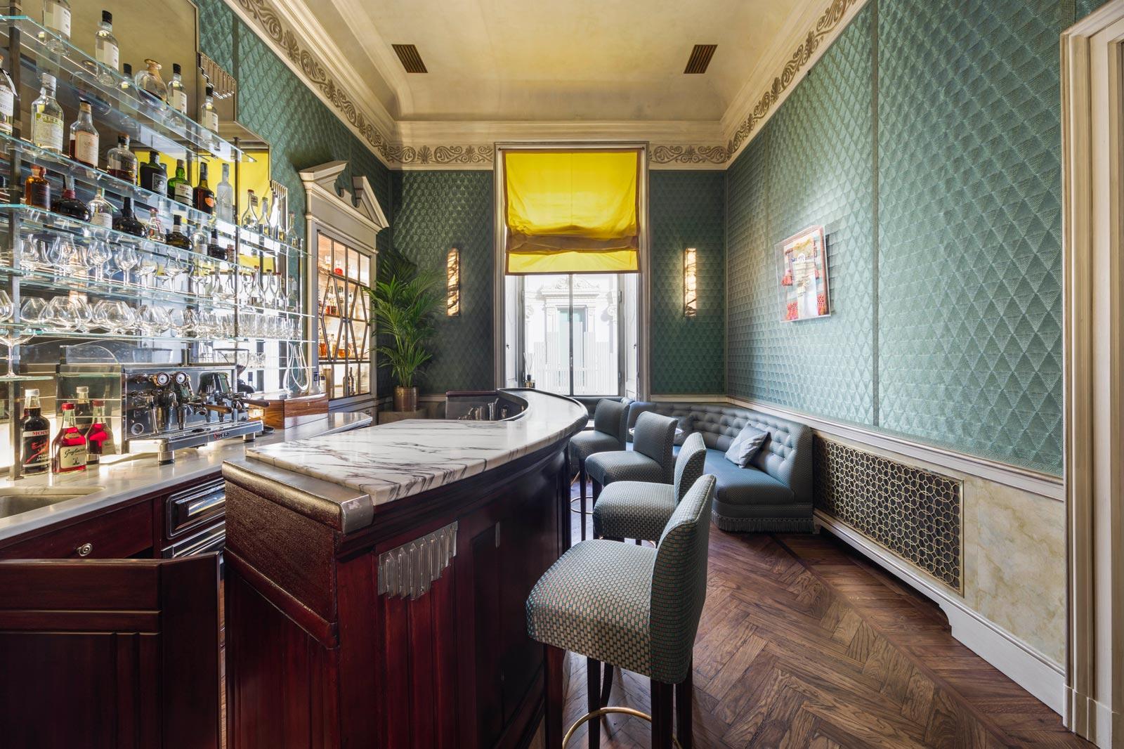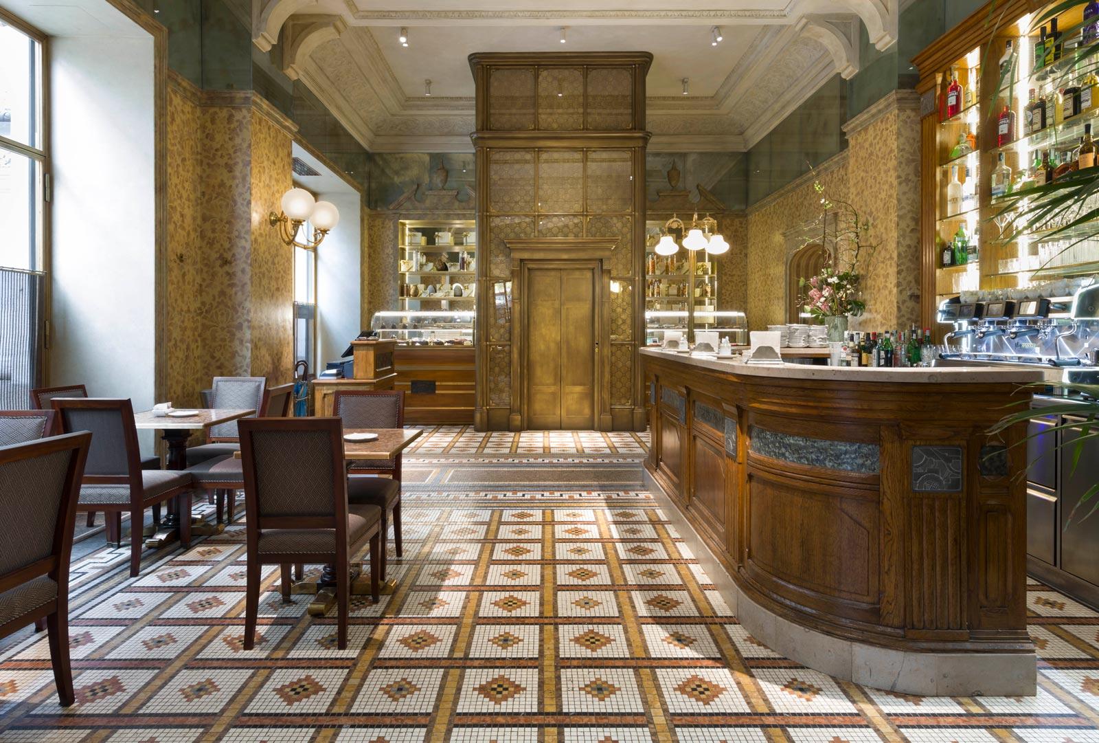 The entrance, on the ground floor, leads into the bistro, where the plaster walls, hand-painted with a damask motif, recall the Fortuny patterns; the interior is further enriched by a mosaic floor and a large bar-counter dating from the late 19C.