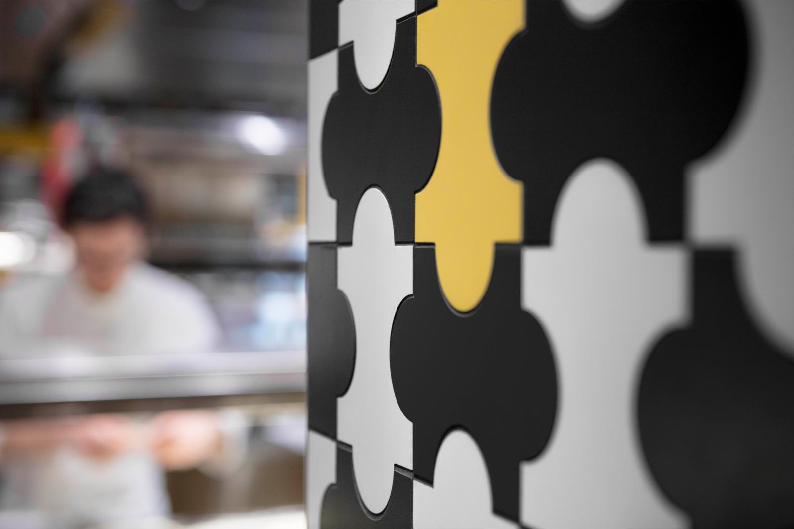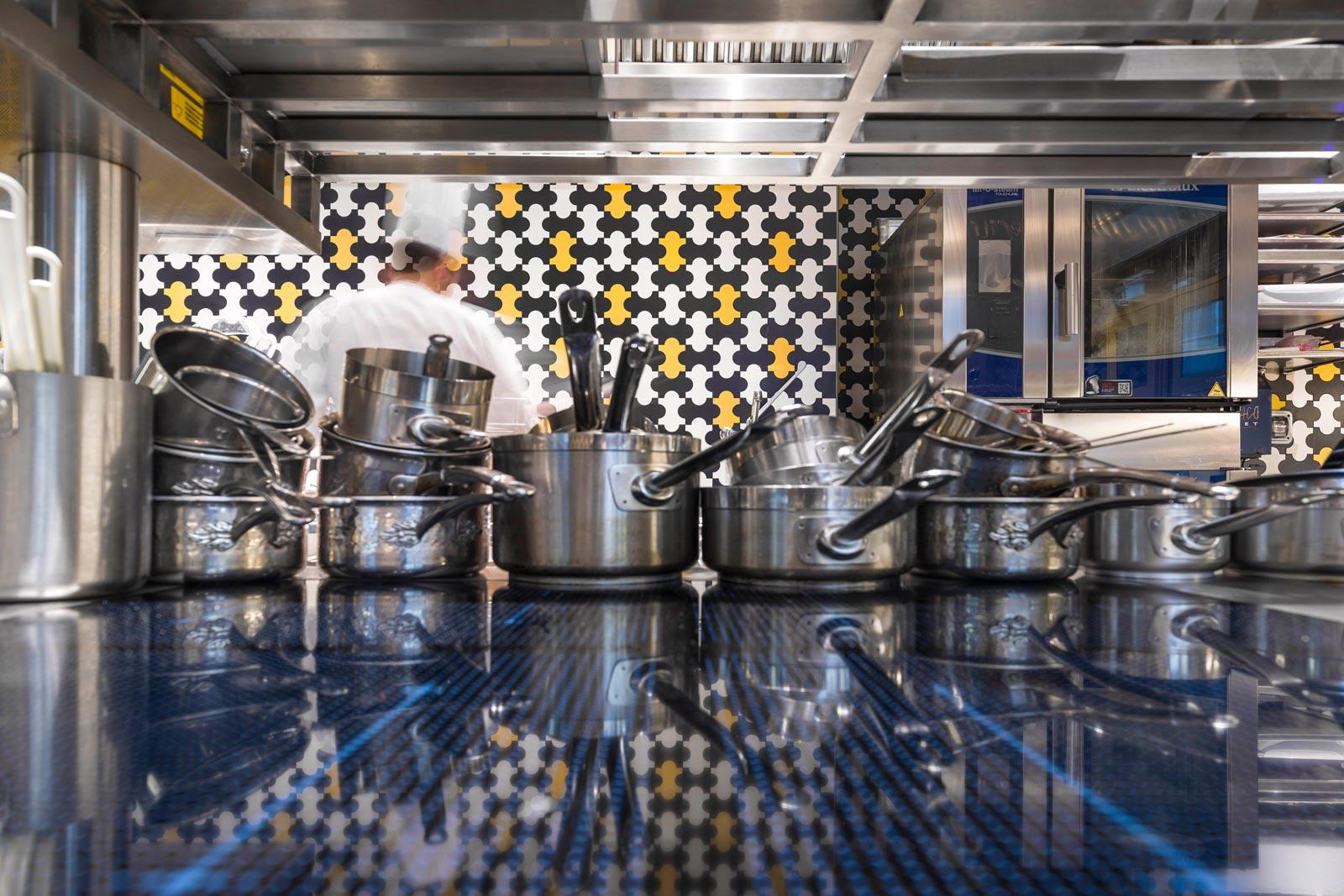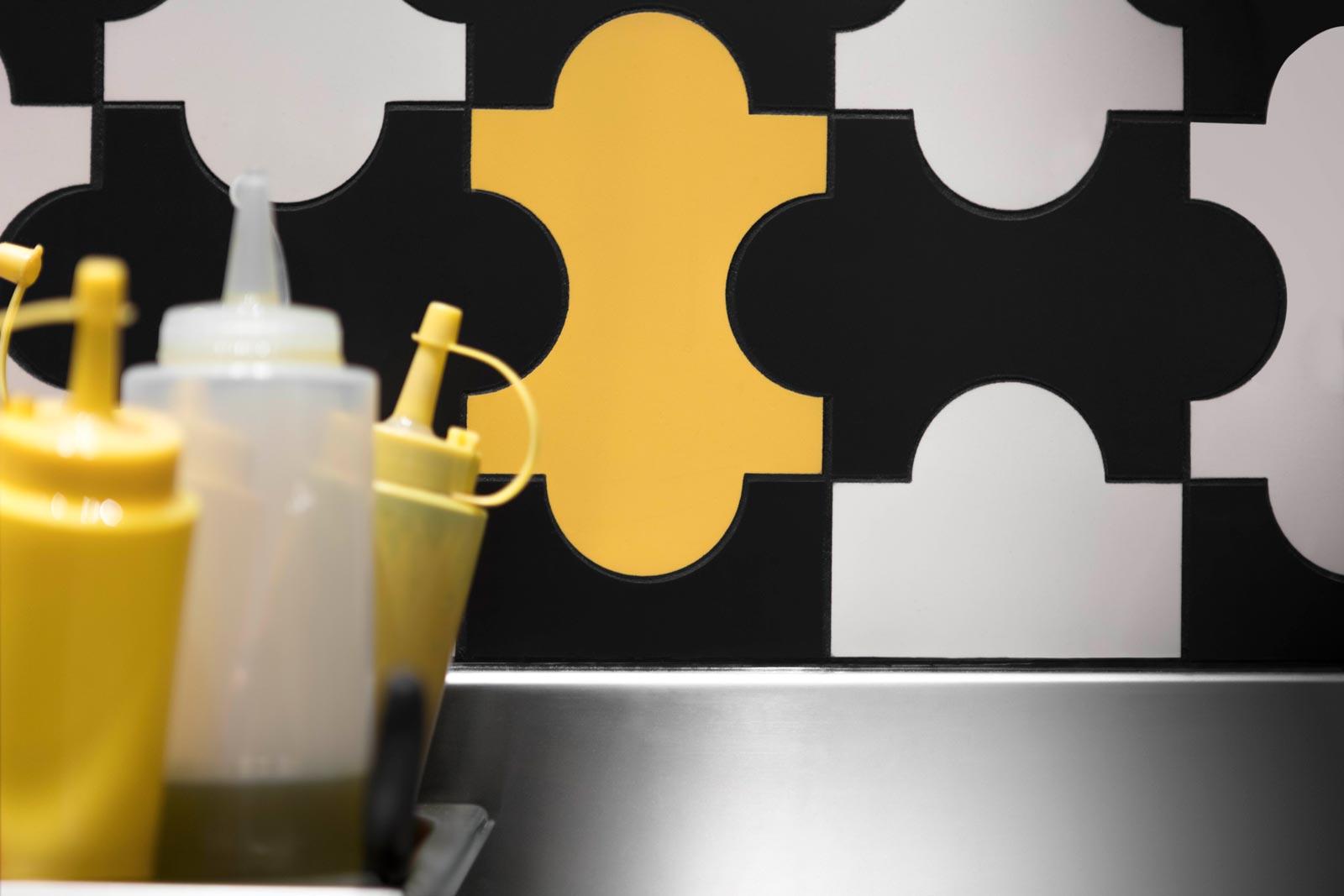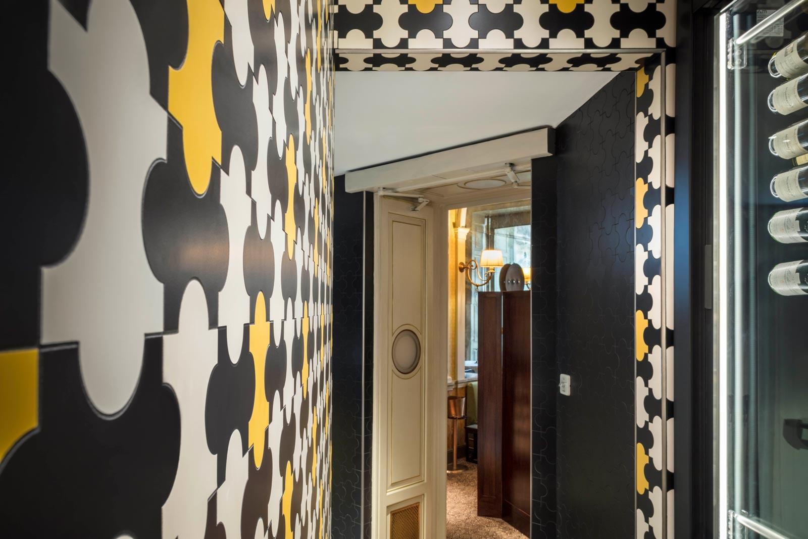 A refined style native to Milan is also expressed in the choice of the Triennale four curve tile – designed by Gio Ponti and Alberto Rosselli for Marazzi in 1960, and used in a jigsaw of Avorio, Ocra and Nero colours – as the wall covering for all the kitchens, included on all five floors.