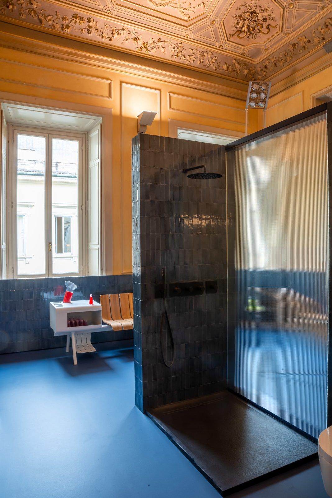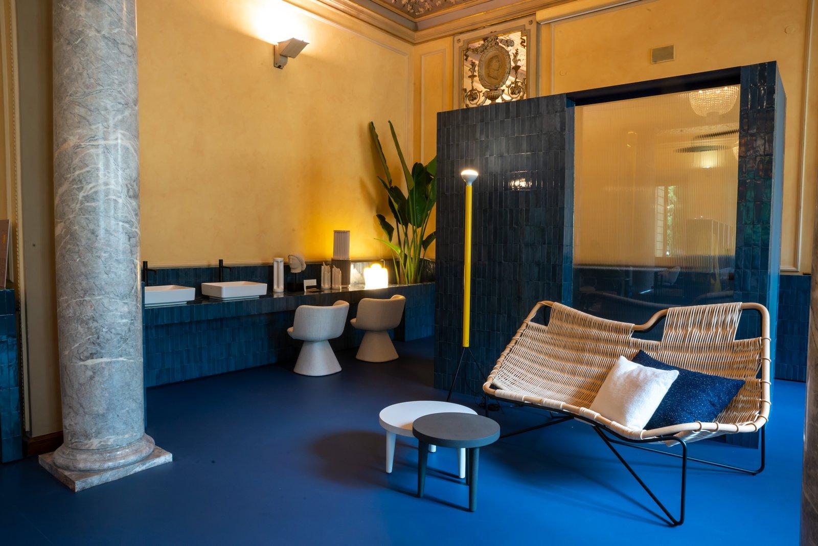 In this room, from a certain height on the walls upwards, visitors are able to appreciate the beauty of the Eighteenth Century architecture, with its pillars and period decorations. The walls surrounding the exhibit itself, on the other hand, are clad with a boiserie panel of small (15×5 cm) porcelain stoneware brick-size tiles in “Blu” shade, with a luminescent surface: they come from the Crogiolo Rice collection, with an uneven texture that evokes “hand-made” ceramics.