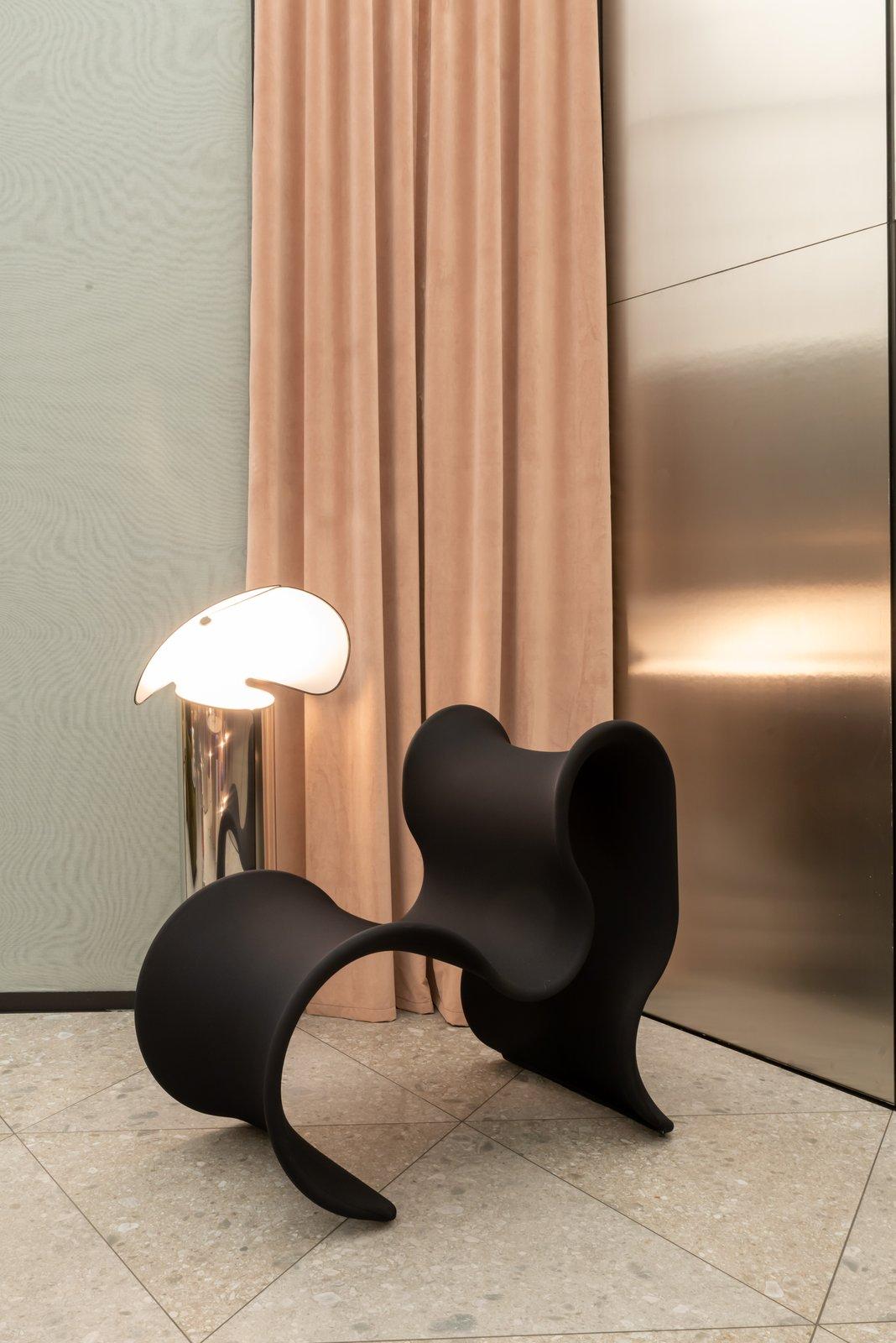 The reference for this interior is the monochrome homes created in the Seventies by Nanda Vigo. Specifically, it evokes the “Casa Bianca” (White House) which, in turn, built on the designer’s work in the interiors of the “Lo scarabeo sotto la foglia” (The beetle under the leaf) villa, the home of collector Giobatta Meneguzzo, designed by Gio Ponti.