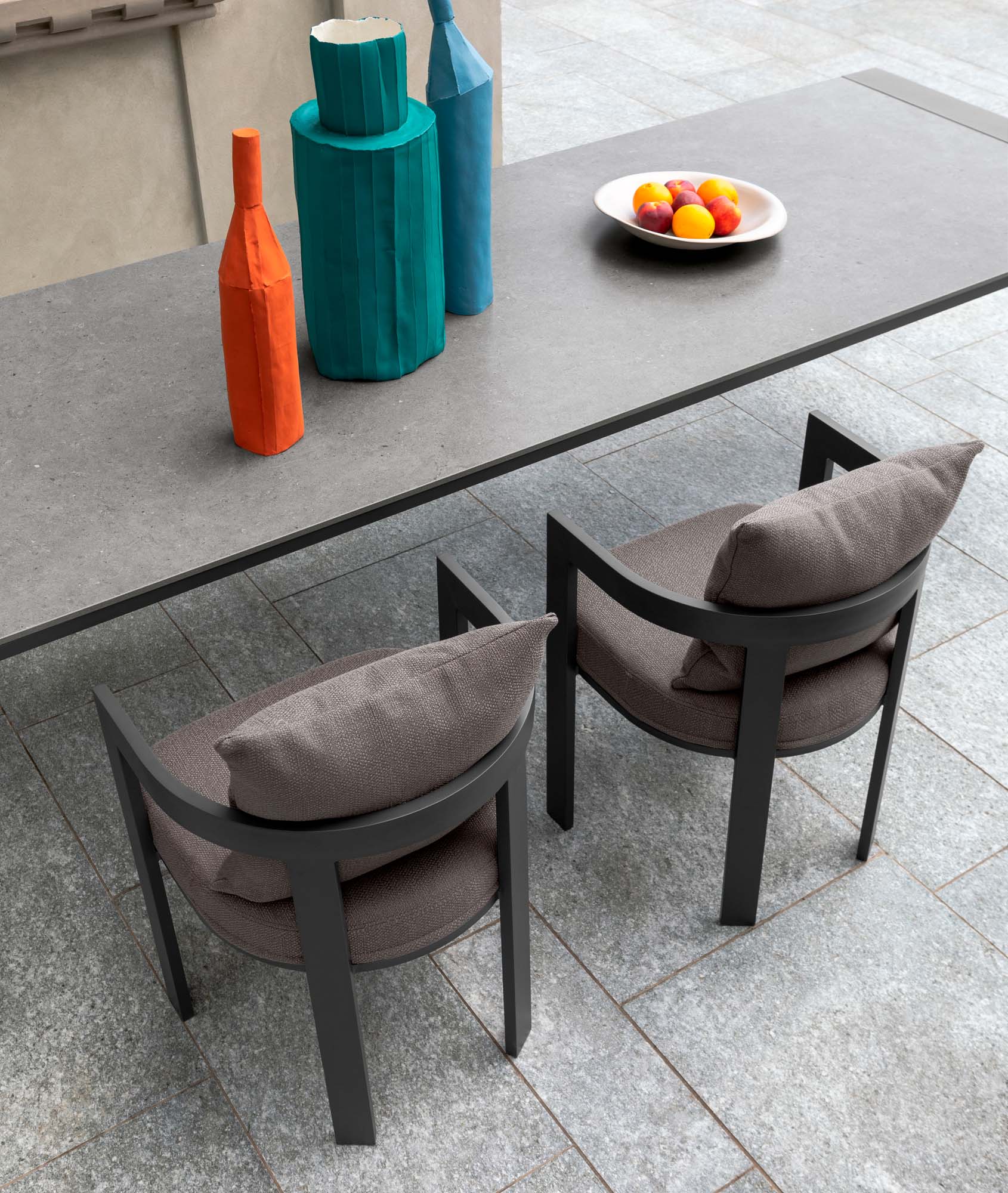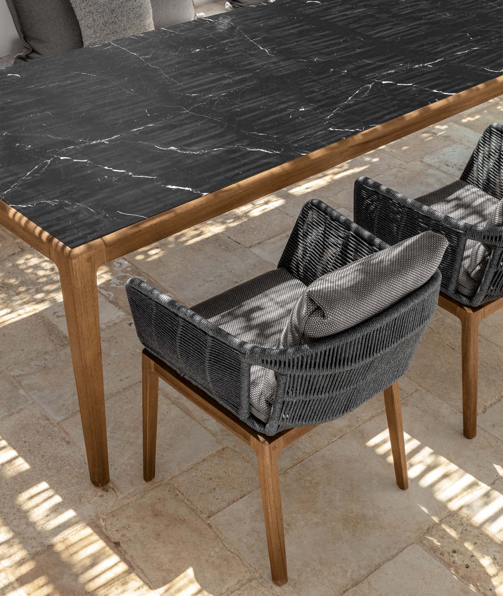 Probably the 320×120 cm Cruise Teak table, where the top in The Top Marble Look Capraia or Elegant Black finish contrasts perfectly with the Smoke Teak frame. It’s one of our most elegant products, displaying all our know-how in terms of craftsmanship and attention to details. A piece where the stoneware slab definitely plays a leading role.