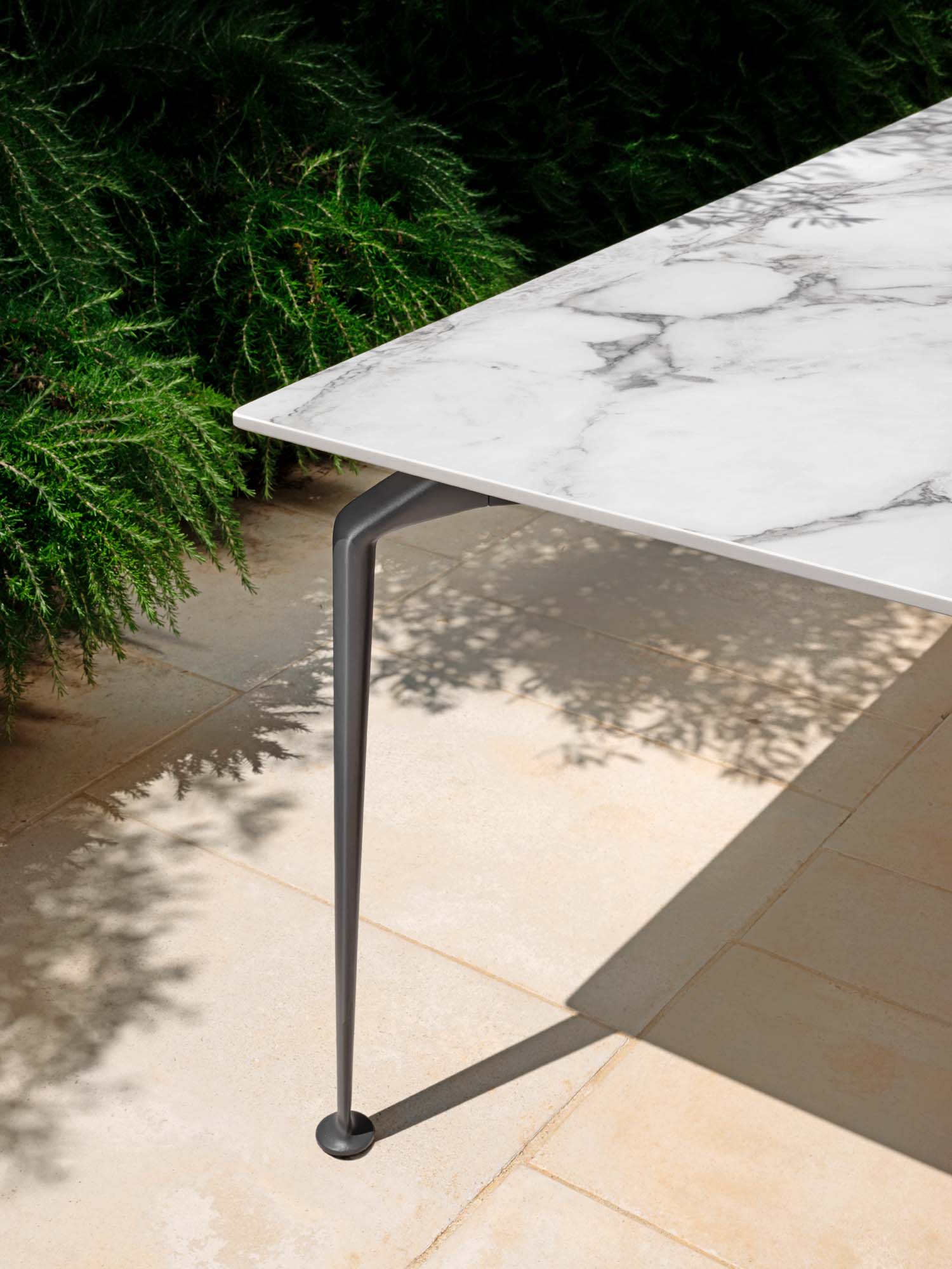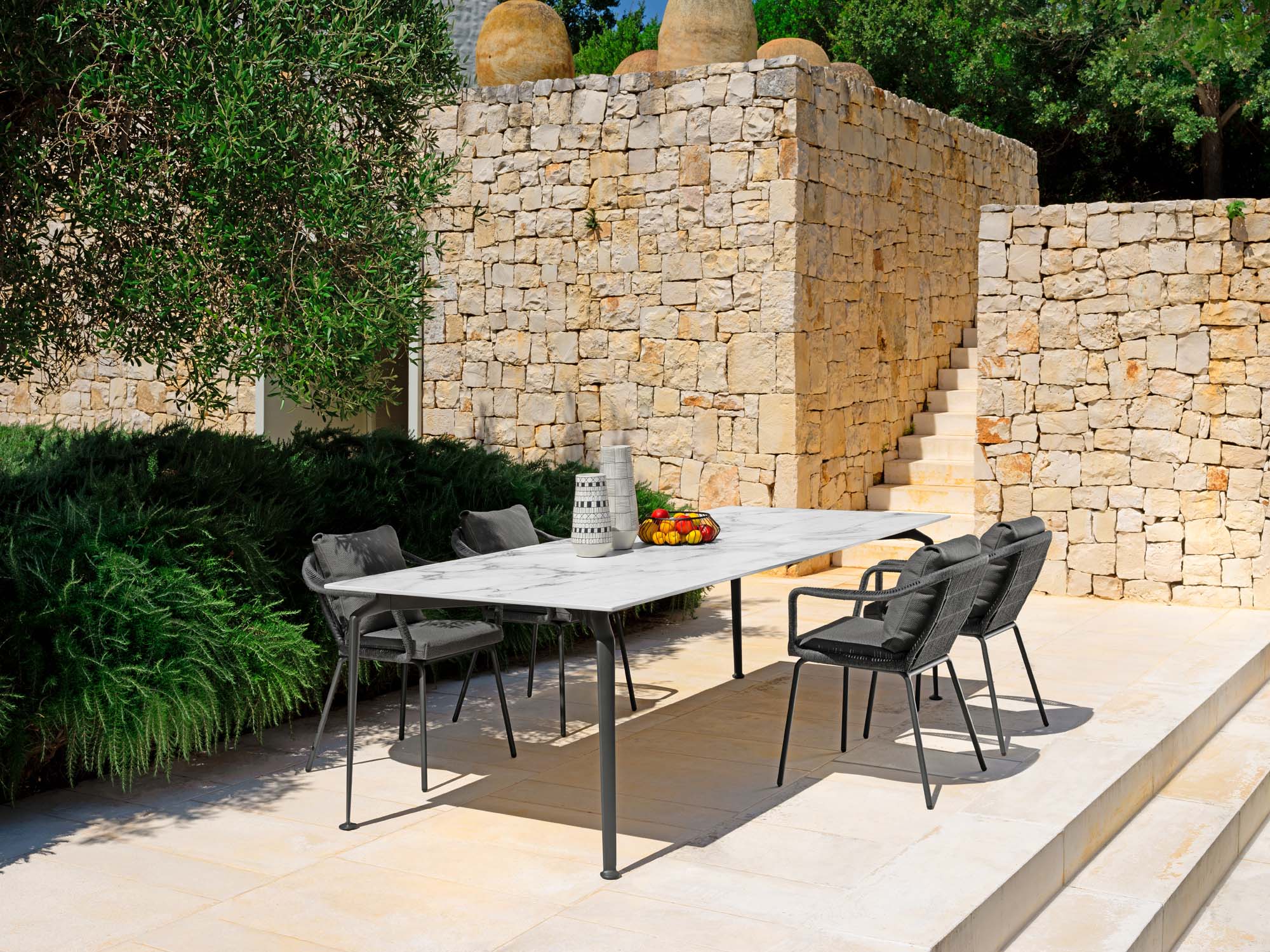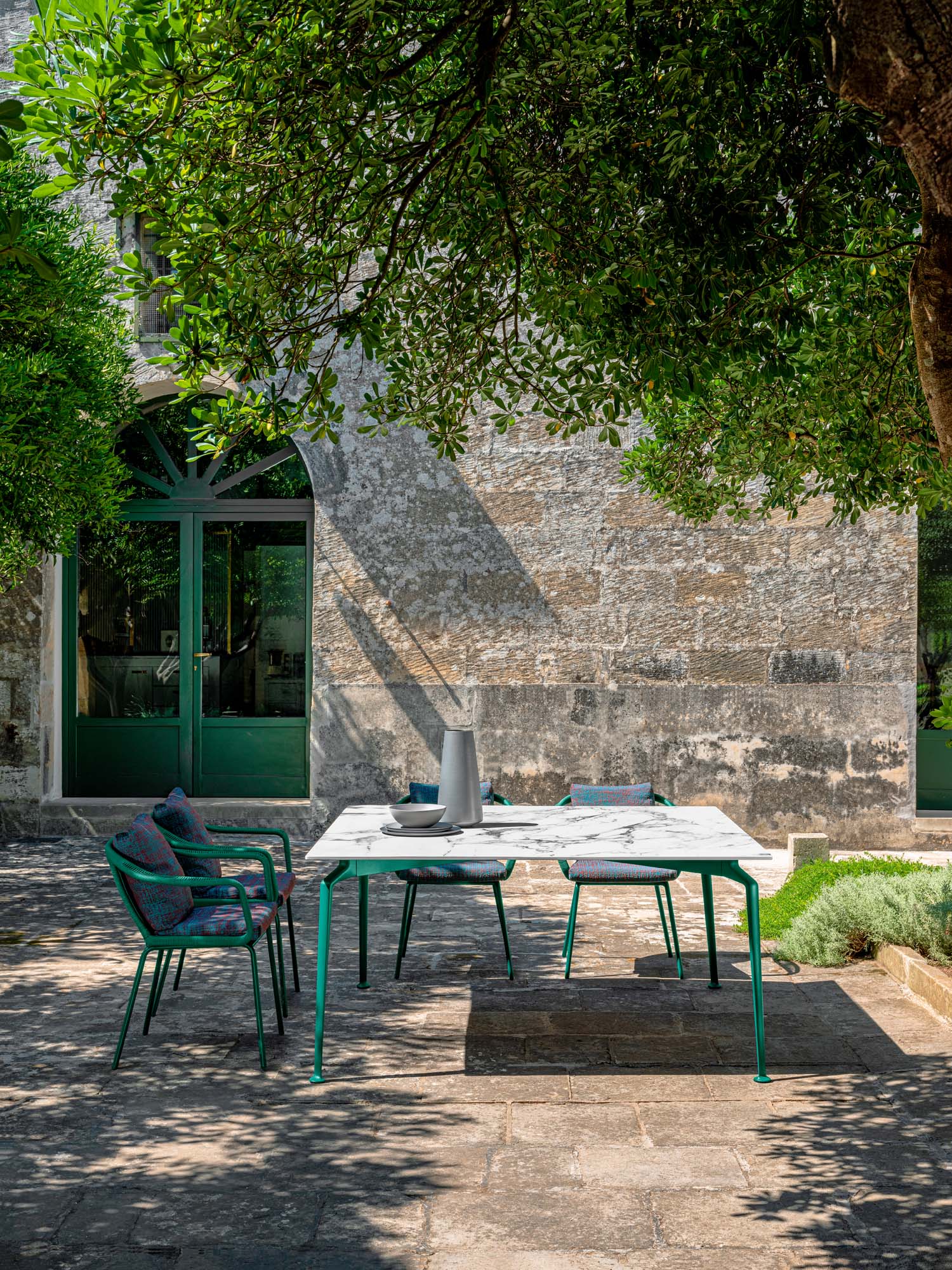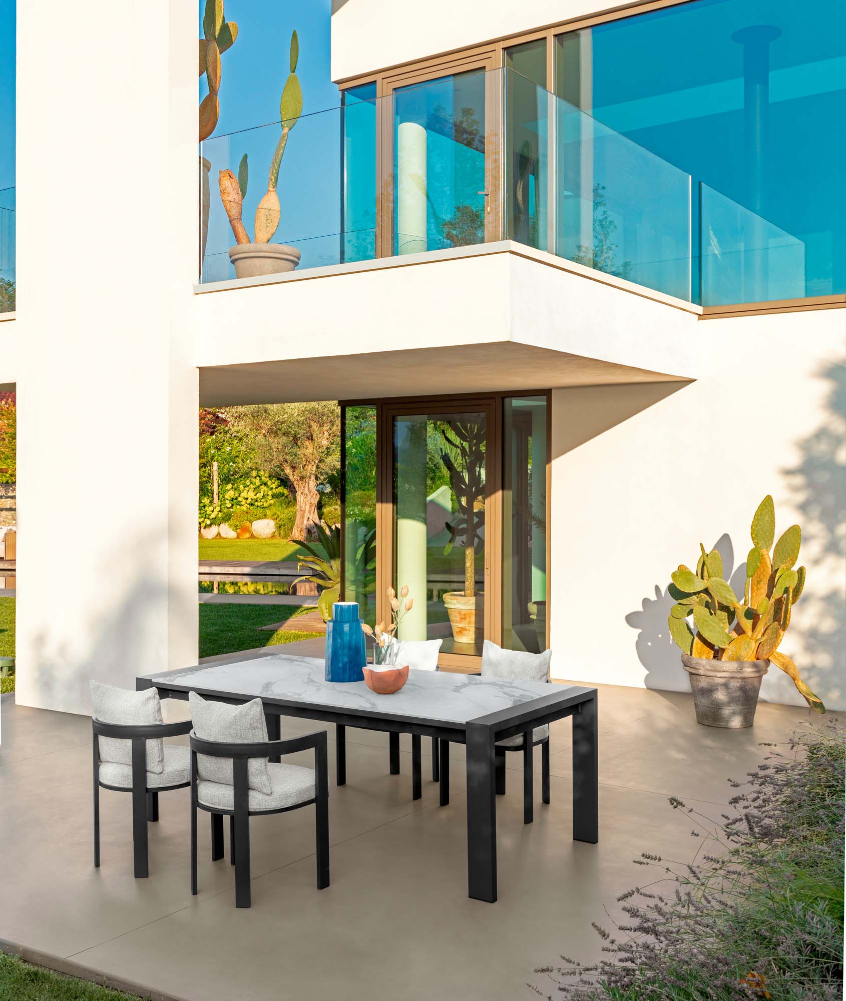 Weather-resistance and sustainability are essential. Therefore, most of our output focuses on easily recyclable materials. Apart from timbers such as FSC-certified Teak and Accoya, a fast-growing wood treated using a non-toxic process, we also use aluminium, which is versatile and recyclable ad infinitum, steel, with its excellent resistance to corrosion, and crafted concrete. For the tops of our tables, we choose eco-friendly raw materials that are not only resistant to rain and thermal shock but also easy to care for. Porcelain stoneware is one of our stalwarts: included in 70% of our collections, it’s extremely versatile with its vast range of finishes. It’s followed by VittEr, a compact laminate produced without formaldehyde, and natural and lava stones, the latter with an extra gloss finish provided by the ceramisation of melted recycled glass.