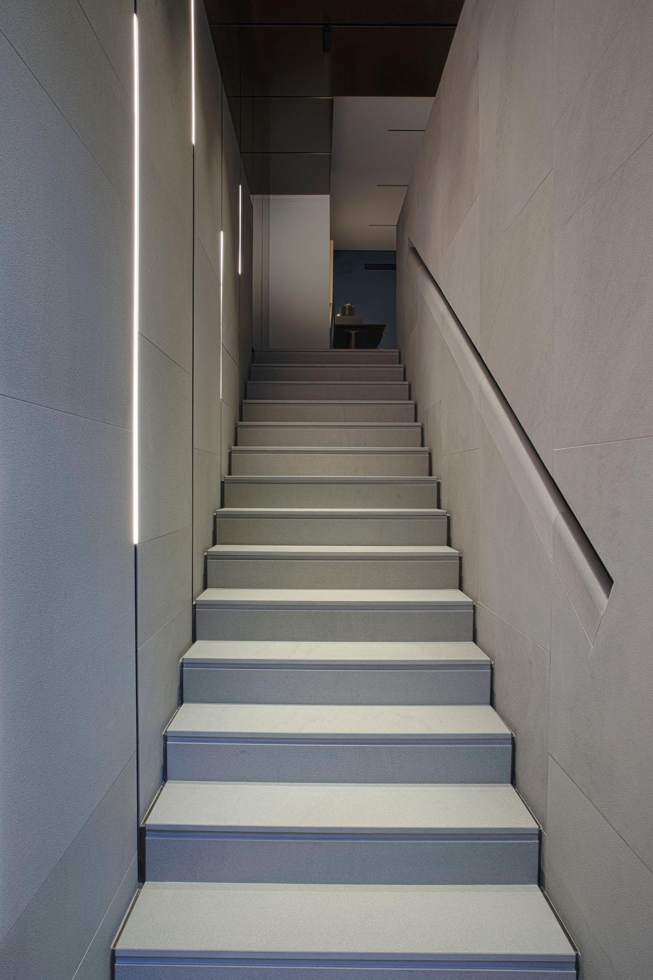 Porcelain stoneware offers versatility in uses and sizes. We also use it to resolve technical architectural problems: for example, in the same home we’ve used it to create mouldings between the wall and the prefabricated ceiling, to mark the transition point. Thanks to the large sizes, we were able to cut the ceramic material to fit. We can also imagine cutting to less geometrical, more random sizes, or use of the different textures to create patterns tailored to the dimensions of the wall for covering. It’s like fitting a graphic map onto each specific wall.