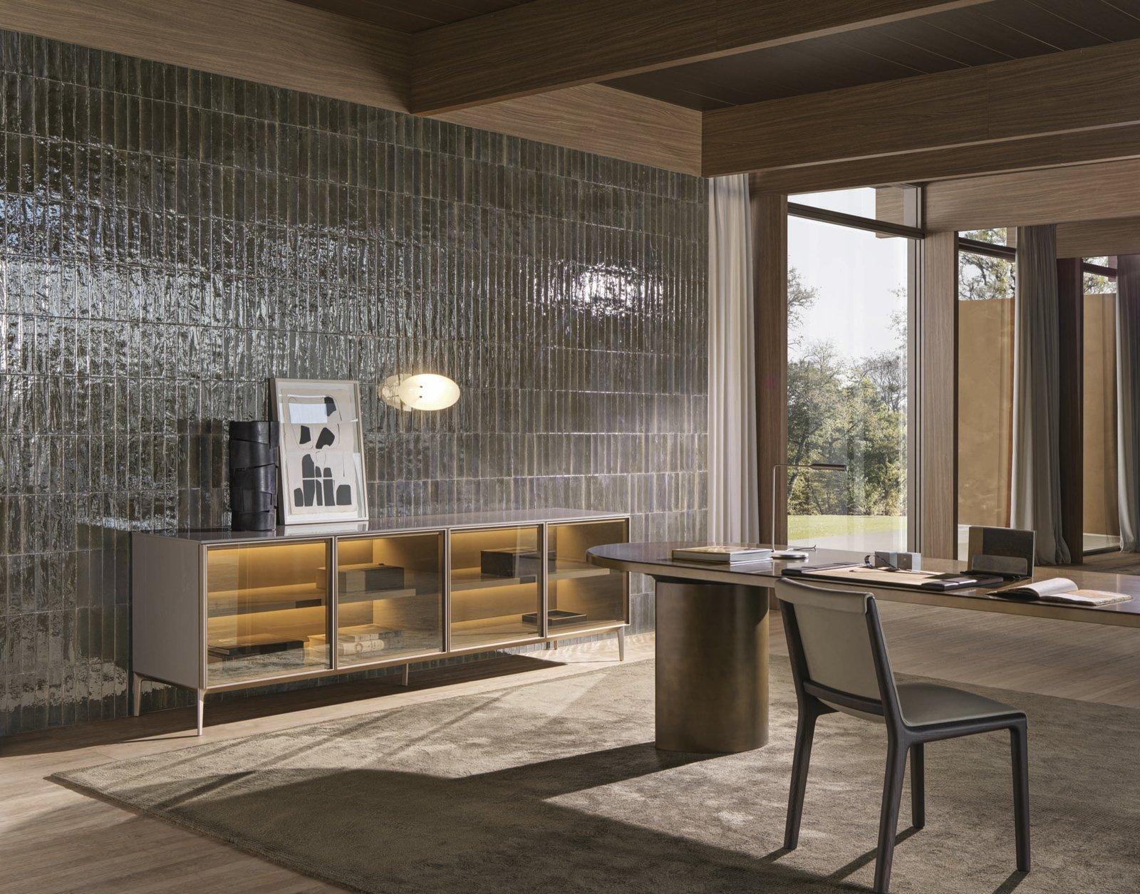 As finishes, Van Duysen has a preference for pure materials with a sensual “feel”. And colours that remind us of the natural world. Light becomes an integral part of the room’s design, since it modulates our perception of it. Just as in ‘40s and ‘50s Los Angeles architect villas, ground plans are constructed around continuous pathways, with doors largely rejected in favour of passageways and internal walls to divide up spaces. Therefore, walls become the protagonists of space, and as such they are covered with narrative and decorative materials like wood and ceramics. The ultra-glossy Crogiolo Lume size 6×24 cm tiles, with slight variations in colour and surface which create a vibrant, dynamic finish, were the material chosen. As individually different as hand-made pieces, Lume tiles give the wall a constantly varied surface, almost a work of art, which interacts with the iridescence of natural daylight – the distinguishing characteristic of the entire project.