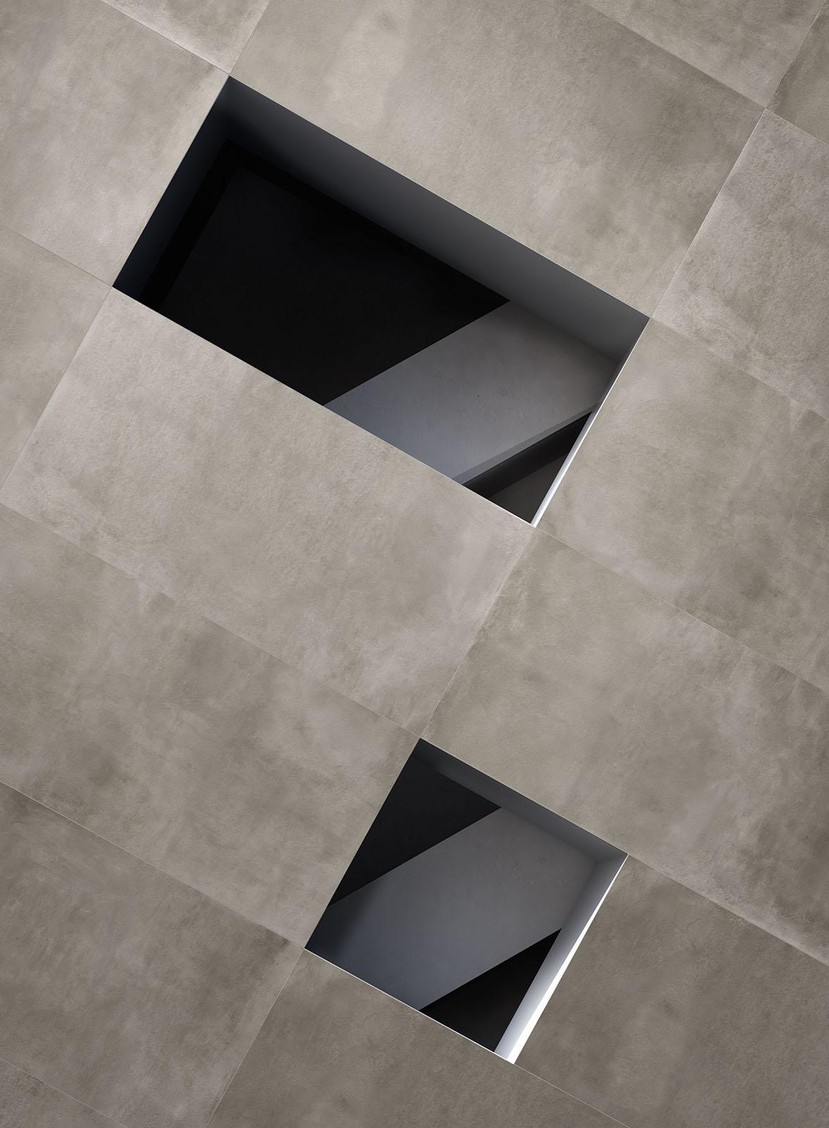 The new, perfectly squared 120×240 cm and 120×120 cm sizes are ideal for seamless installations that express all the tactile appeal of concrete with the greatest possible intensity. The range of neutral and natural colours, in five shades with subtle variations in tone, responds effectively to the most widely differing architectural and stylistic needs of residential and contract projects, including restaurants and stores, with anti-slip properties that also enable the material's use in public locations.