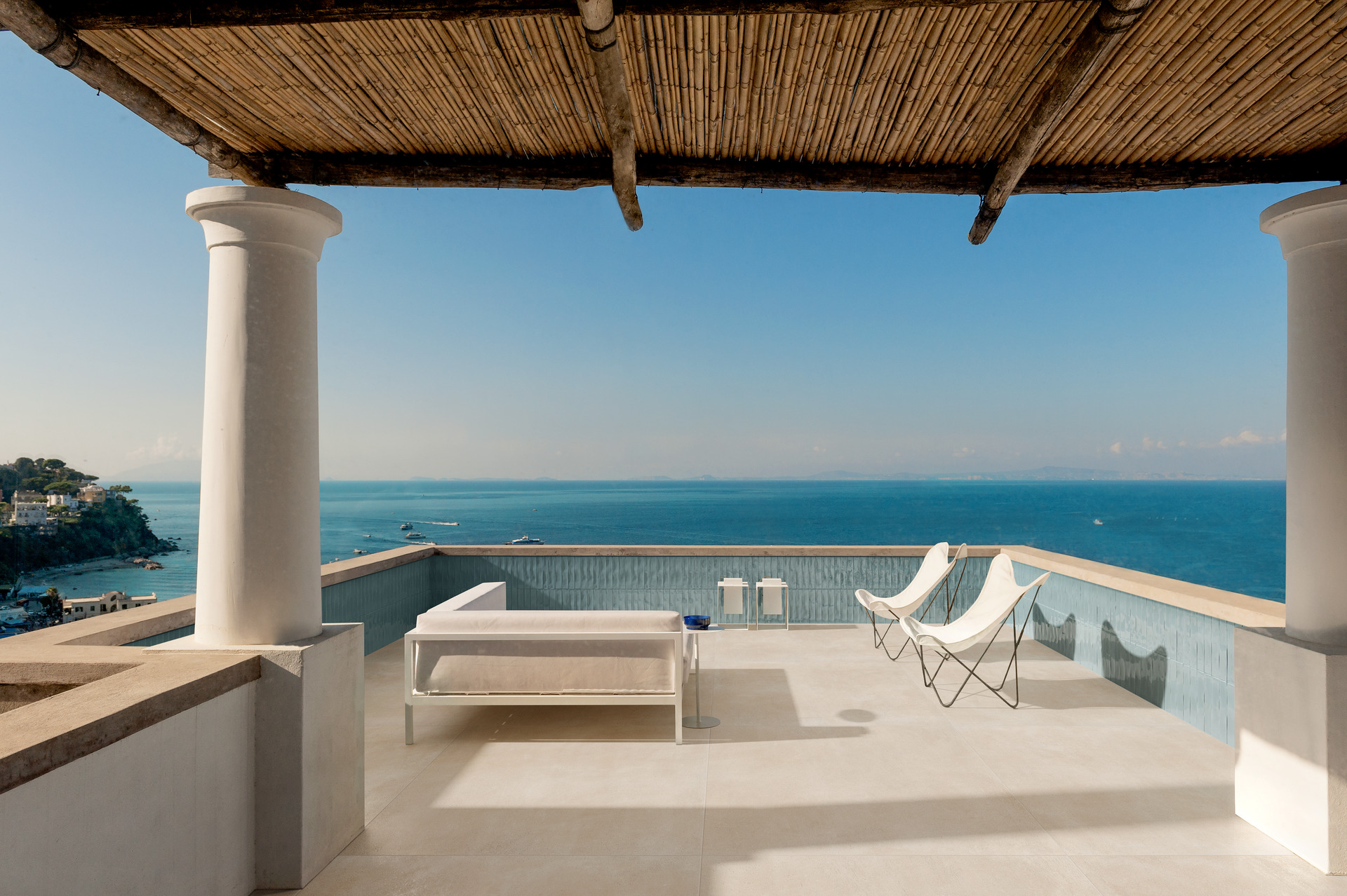 The furnishings of the dining area must be elegant as well as functional: spacious tables, comfortable chairs and light awnings create a space that’s a pleasure to use at even the hottest times of day. The lounge area can be furnished with outdoor sofas, loungers or poufs, completing the effect with outdoor carpets that increase comfort and define the mood. For shady corners, adjustable awnings or wooden pergolas are both attractive and practical.