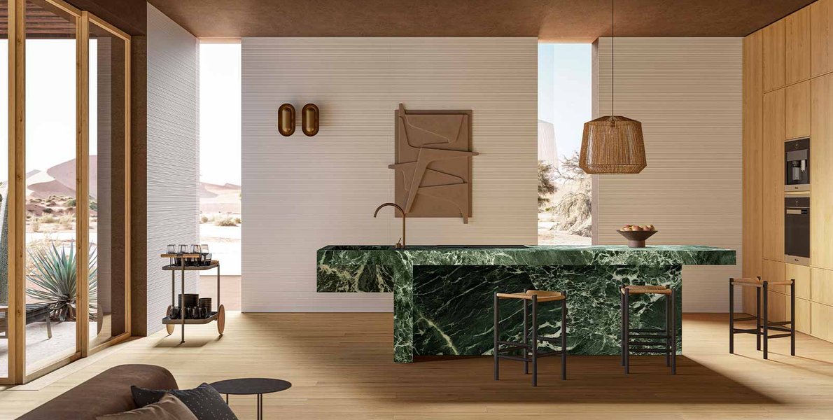 The villa is conceived as a faraway place, a buen retiro, anchored to the earth, but set in mountainous terrain. Cacti, spurges, palms and succulents are the stars of this stage. The colour of the land reflects and almost merges with the colours of the interior and is replicated on the exterior of the building. The materials interact with the natural light that enters through the large windows in a continuous interplay between inside and outside, indoors and outdoors. The ceramics permit a dialogue between the different rooms, creating a material continuum, an uninterrupted flow. Light, according to the interior designer, becomes a design tool: modulated with calibrated inlets, it plays with the textures and colours of the floor and wall surfaces. Mystone Travertino and the new Marazzi wood, marble, concrete and resin-effect collections feature in matches with small-size slabs such as Crogiolo Rice, Lume and Zellige and are also used to cover the large forms of the kitchen, washbasins, and magnificent fireplace in the living area.