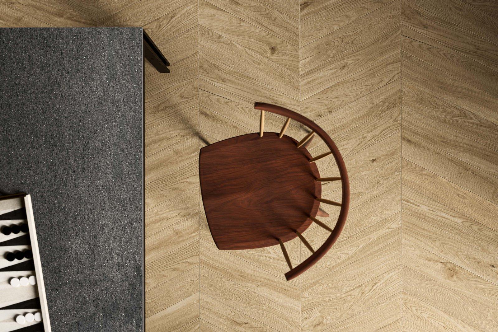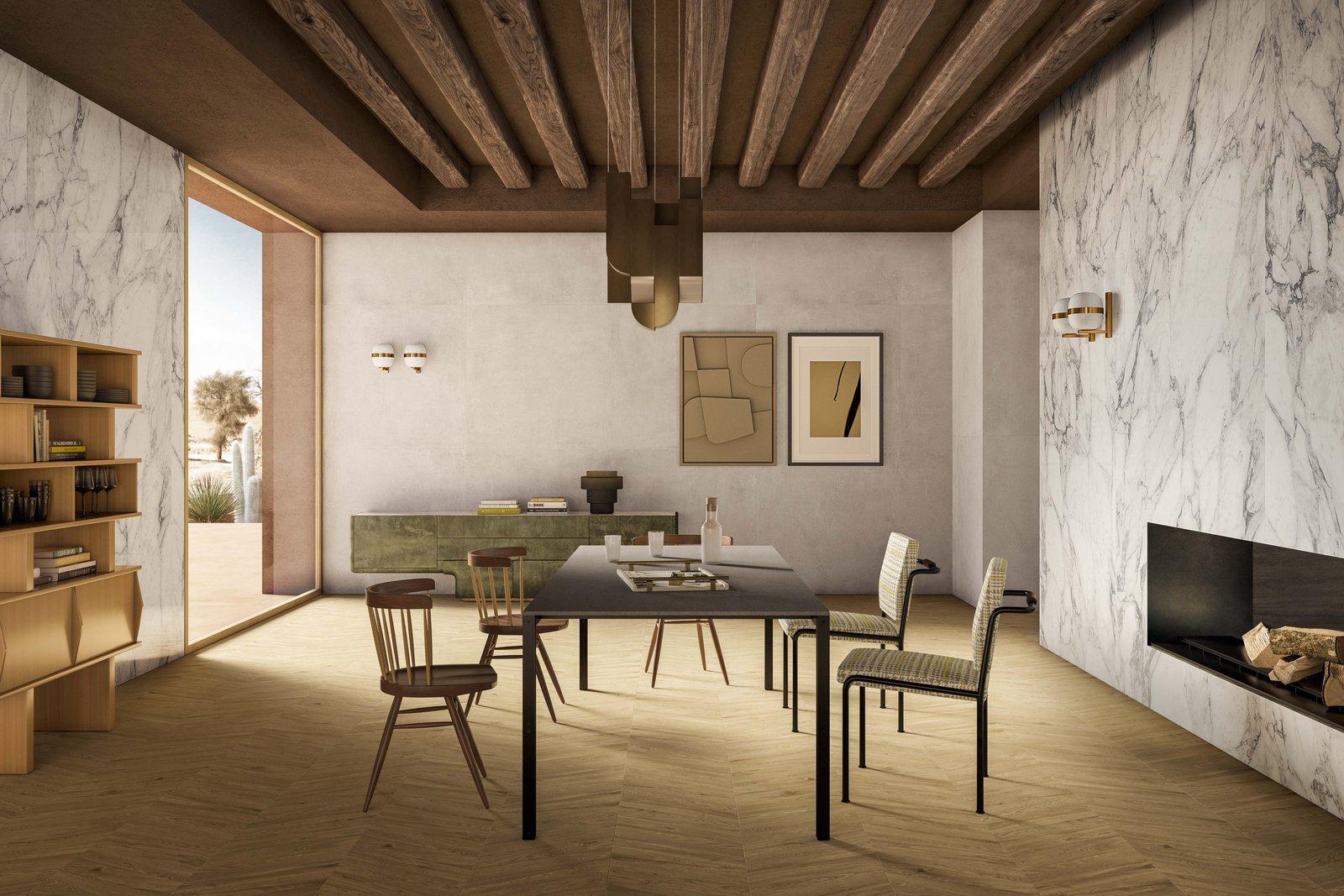 The dining room features exposed beams running across the length of the room and two large bay south-facing bay windows. The Canaletto walnut furniture is juxtaposed with matt British gold metals. The table demonstrates the versatility of the furnishing solutions from the Marazzi The Top collection in the Basaltina 12 mm version with a visible profile. On the floor, the new Chevron size of the Vero wood-effect stoneware collection lends a warm look to the walls, which are covered with Grande Calacatta Extra slabs and the Cementum collection in the Ash colour.
