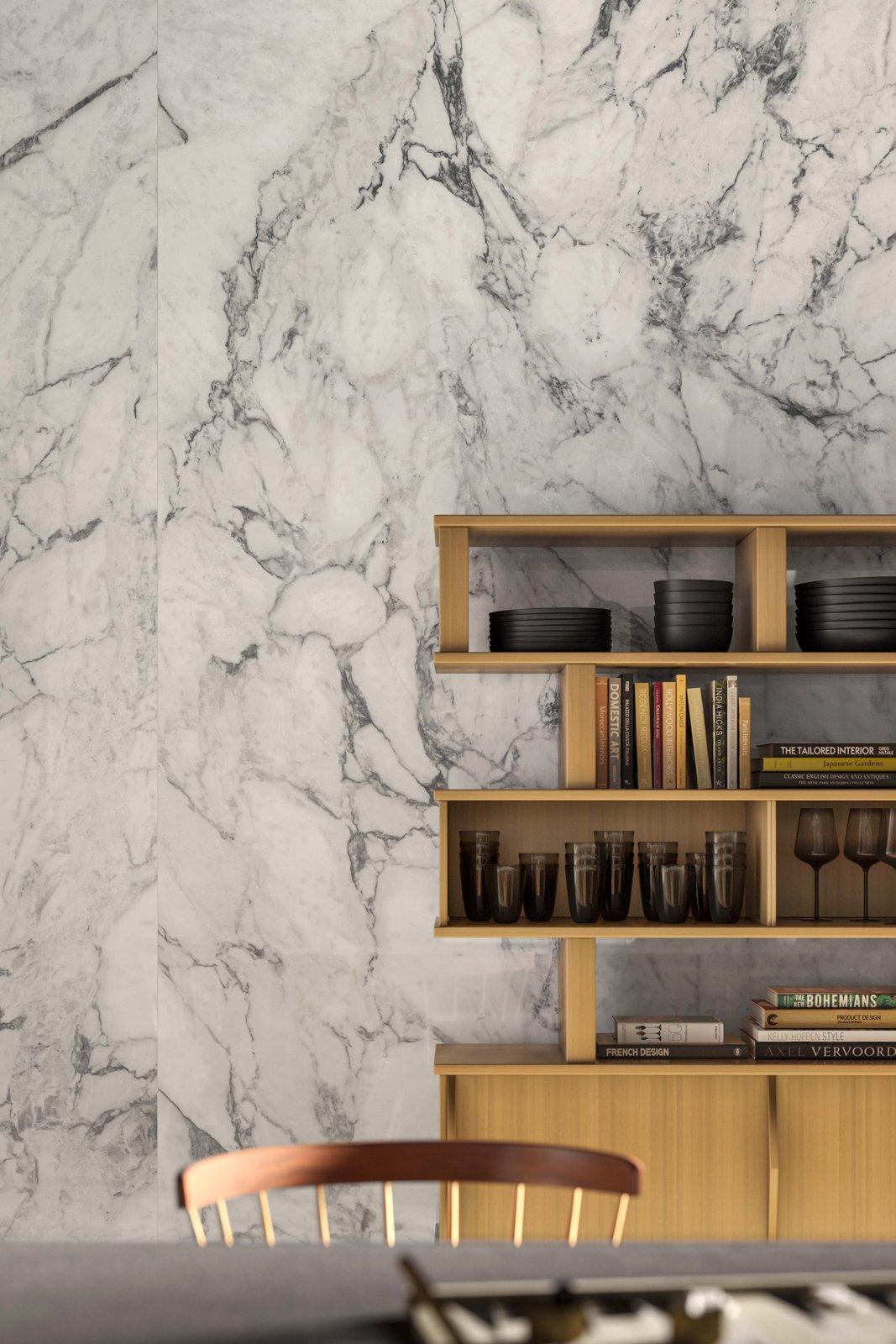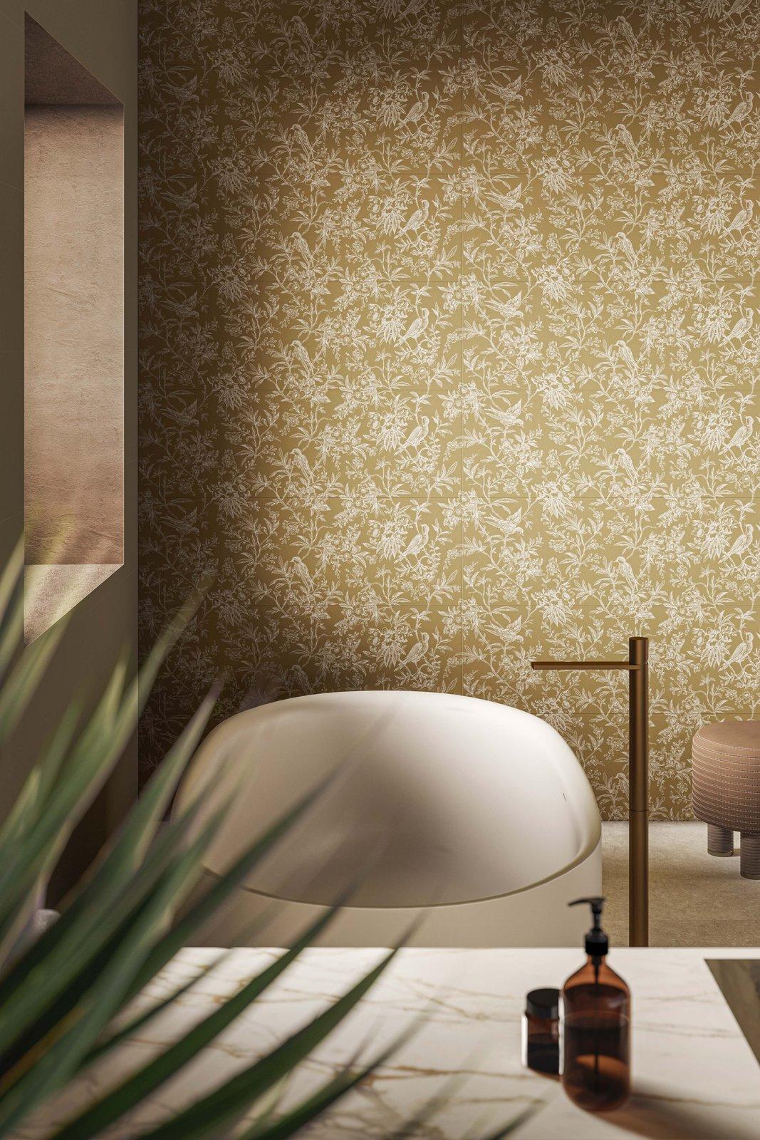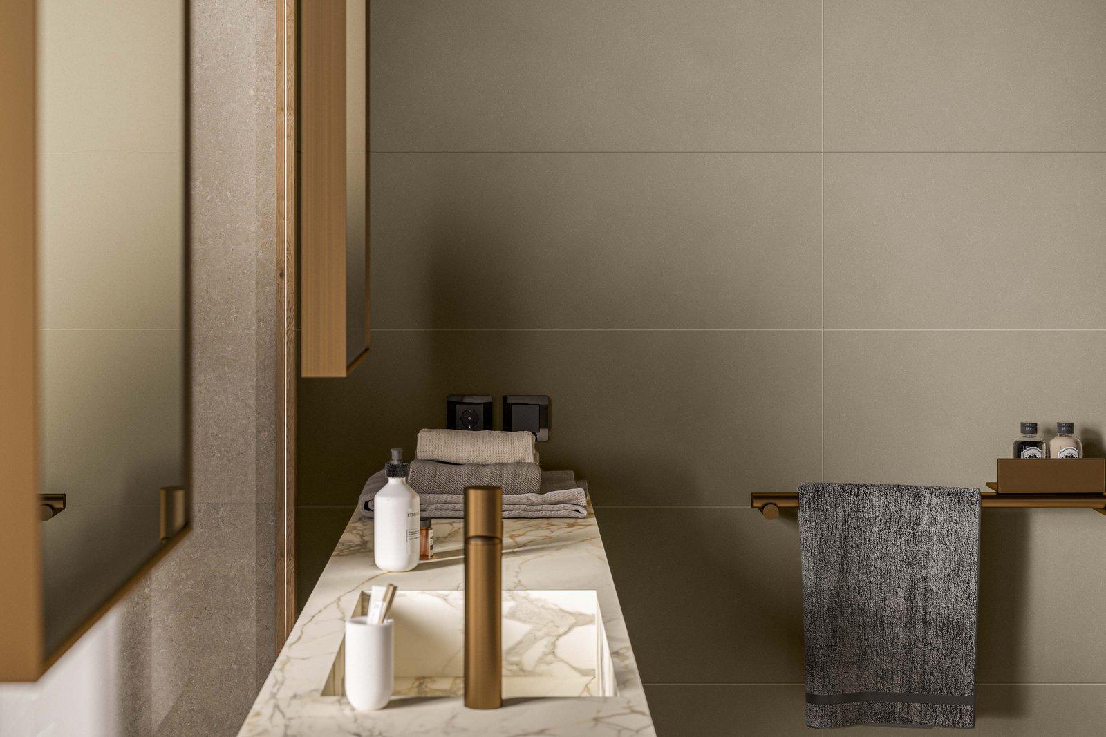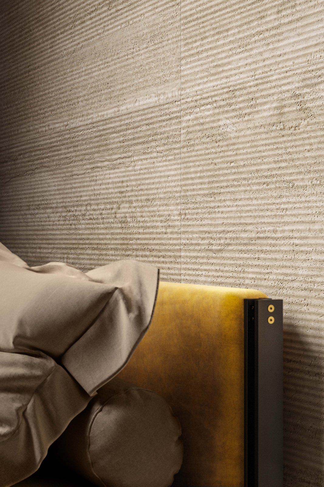 The bedroom and bathroom are designed to be seamless, inviting spaces with a focus on external light. In the master bedroom, the full-height opening is conceived in a way that allows you to enjoy the light of dawn and the small garden. The same wall is covered with 10×10 cm glossy tiles from the Crogiolo Zellige collection in Cammello colour, contrasting with the tactile appeal of Mystone Travertino stoneware chosen for both the floor and the wall, in the latter case in the Scalpello 3D version, which makes it soft and alive when the light changes thanks to the structure of the new Sublime Sync technology. The bathroom features a sculptural Grande Marble Look Calacatta Vena Vecchia stoneware washbasin that spans the entire room and overlooks the green space between the indoor and outdoor areas. A shelf, washbasin and container combined, the bathroom top emphasises the transformability of Grande stoneware slabs. The wall features the Momenti collection (40×120 cm size) in the Tobacco colour with the China Touch decor.