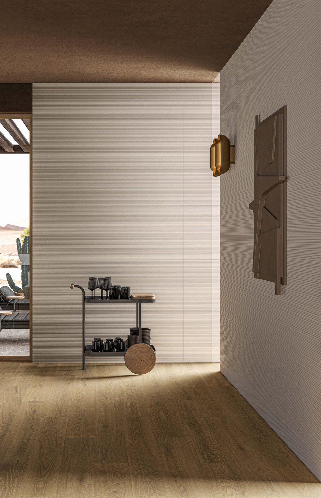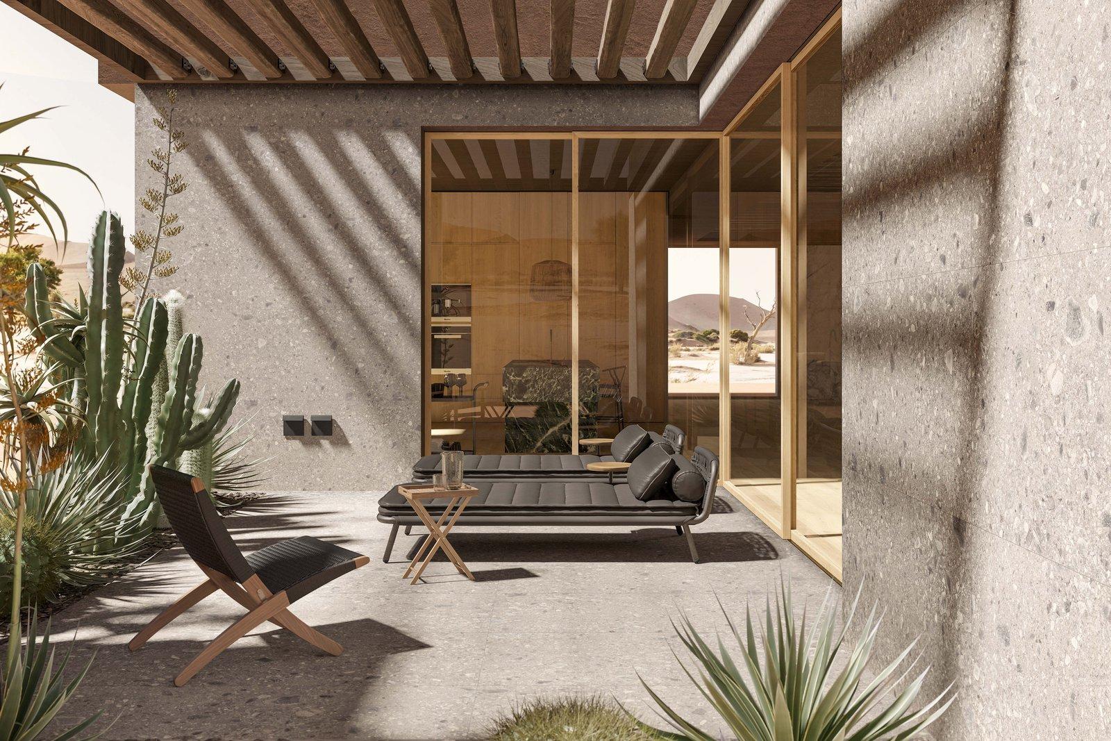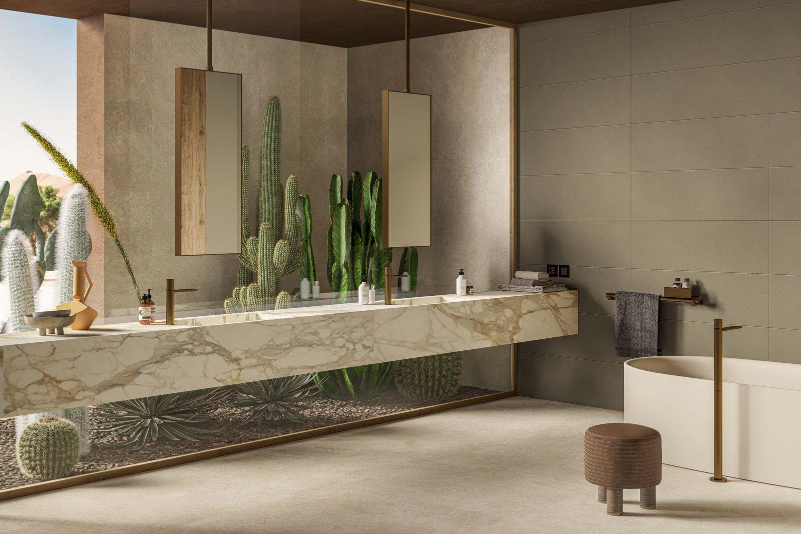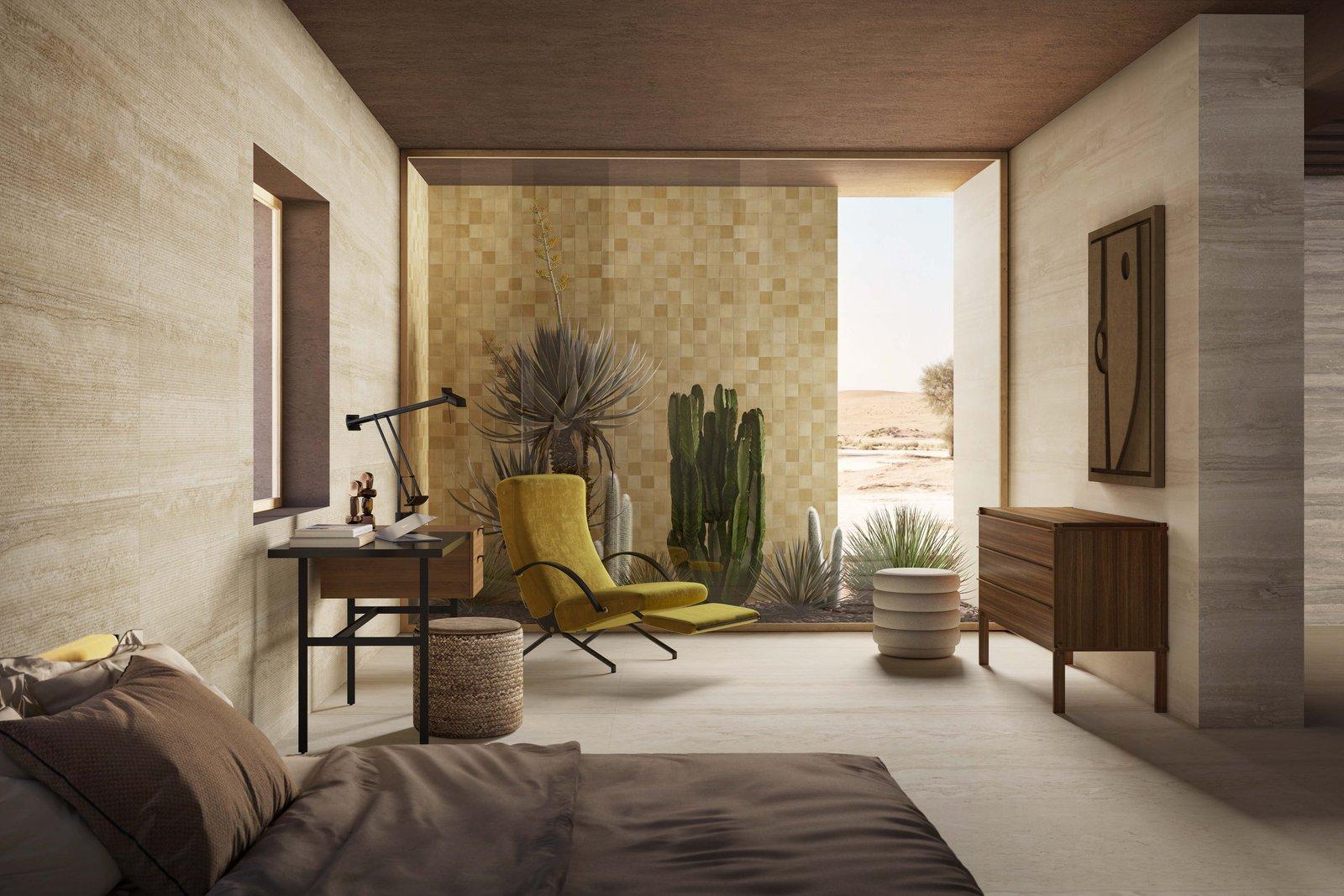 A dream villa, an oasis of peace imagined by Alessandro Pasinelli in the Arizona desert, inspired by its earthy tones and surrounding vegetation. This is the ideal home proposed by Marazzi for Cersaie 2021, showcasing, through the design of a context, the expressive and compositional potential of the new porcelain stoneware collections.