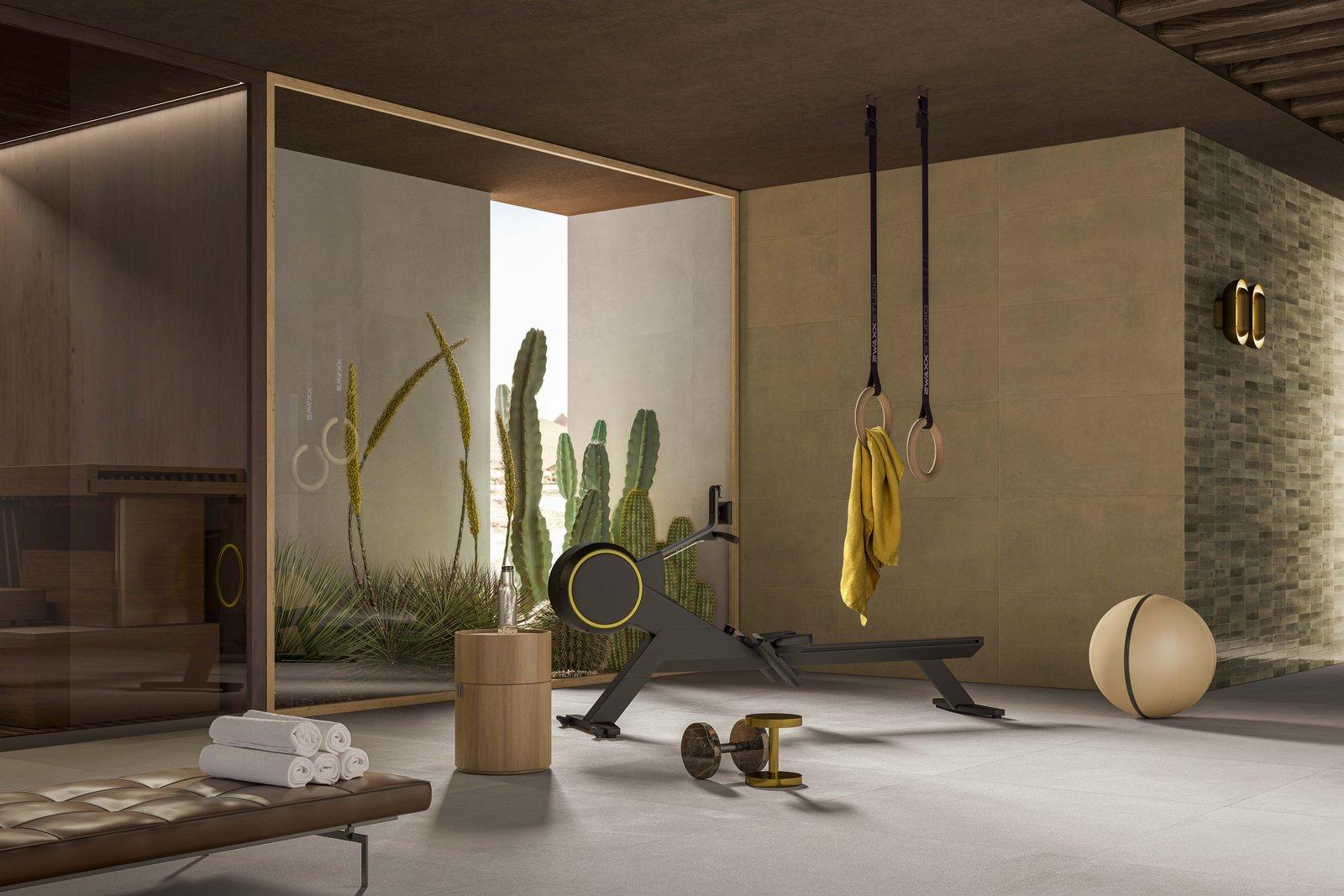 A dream villa has to include areas devoted to the well-being of the body and mind: a spa with a gym and outdoor swimming pool. The practicality and performance required of these types of environments are combined with the aesthetic warmth of the surfaces: the floors and walls in the spa feature the matt, technical surfaces of the Cementum collection in the Olive colour, contrasting with glossy Crogiolo Lume stoneware, while around the swimming pool the same collection, in the 60x120cm size and Cotto colour, offers a non-slip, soft-touch surface thanks to StepWise technology.