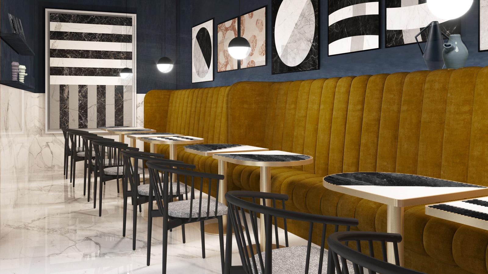 Inspired by London's Gentleman’s Clubs, The Tile Club is open to anyone interested in ceramics as an artistic and architectural form and has been designed throughout using the new slabs in the Marazzi Grande 2018 collection: new sizes – 160×320 cm and 162×324 cm – new thickness of 12 mm as alternative to 6 mm, new looks inspired by the finest marbles, the tactile personality of concrete and the mineral allure of metal, are all now presented alongside Grand Carpet, the collection signed by Antonio Citterio Patricia Viel, which provides the complete wall coverings for the café and wunderkammer, two of the Club's five rooms.