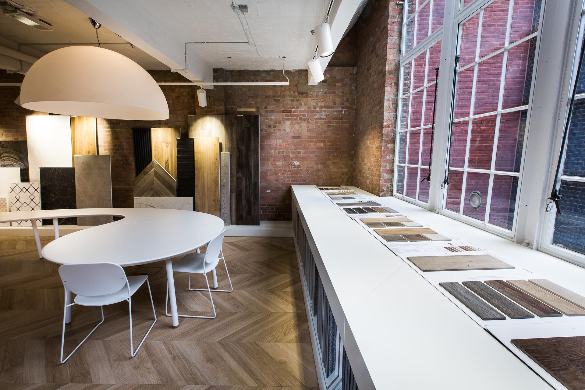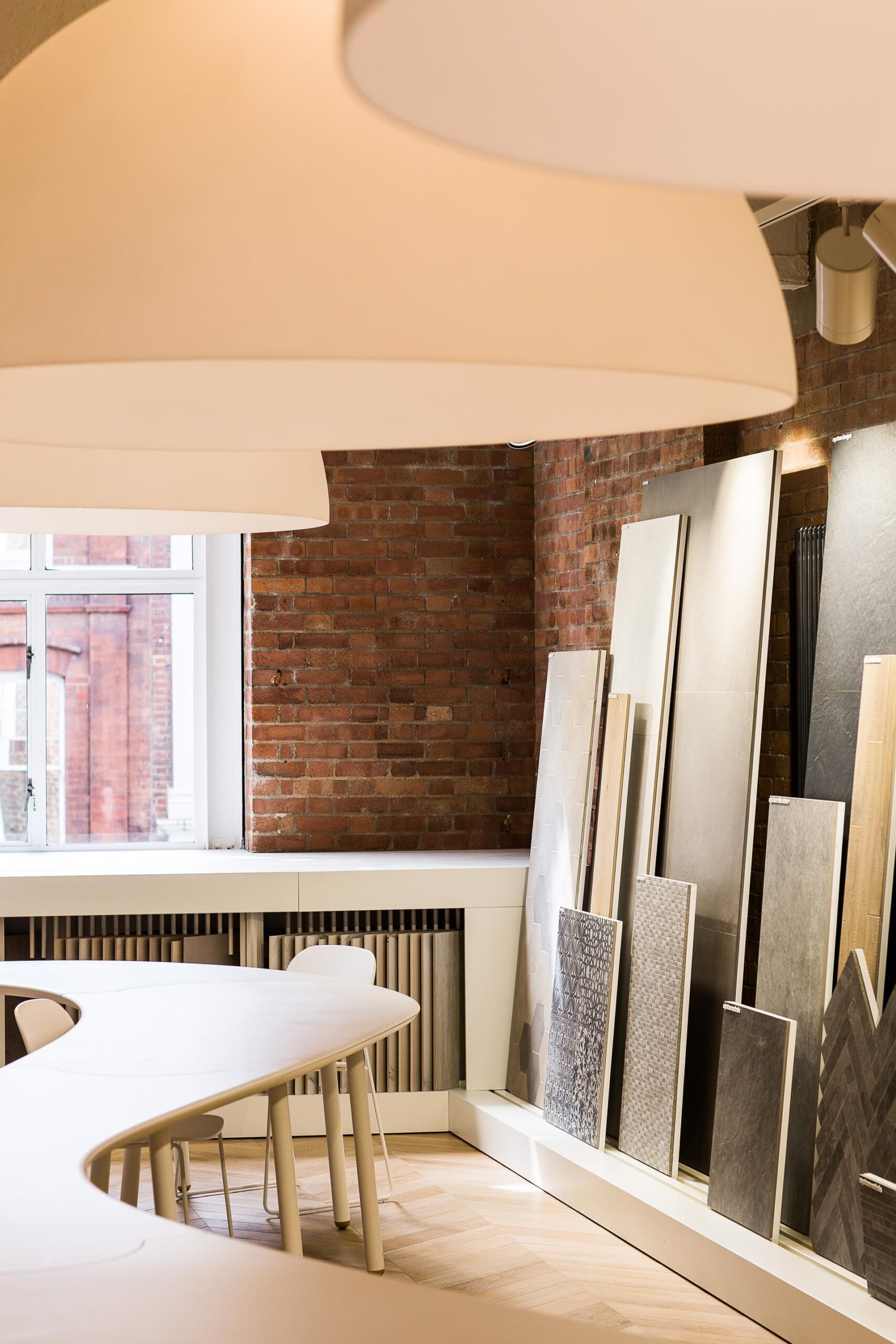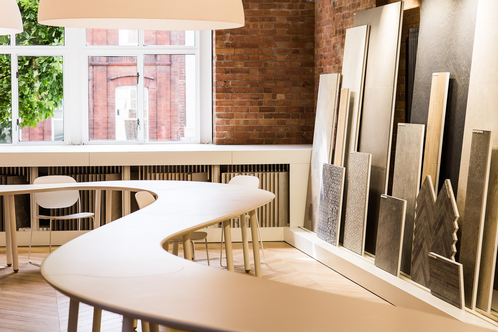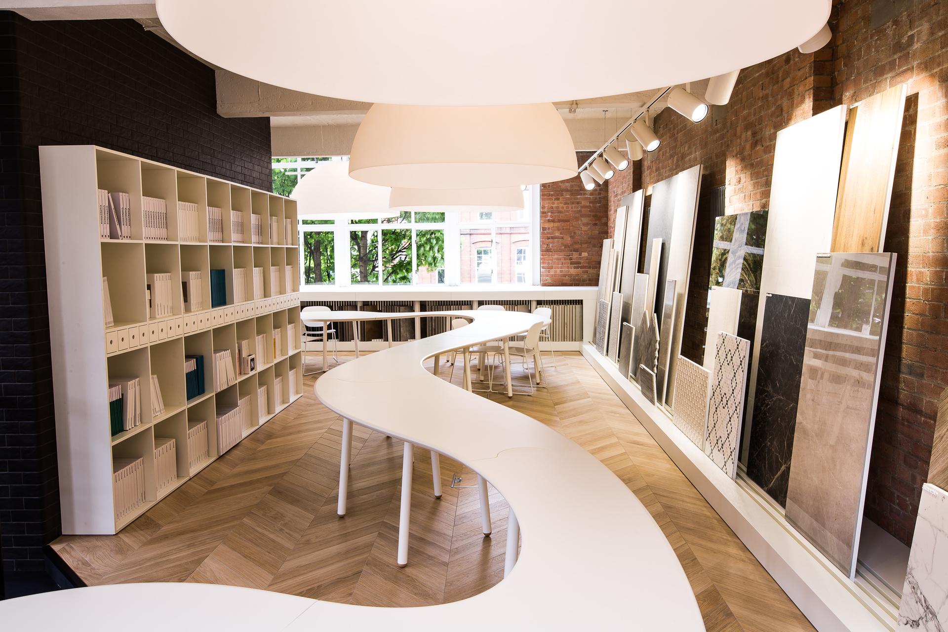 The remainder of the room faithfully maintains many original features: the main wall in exposed red brickwork becomes a background for presenting mood boards of ceramic materials, which thus resemble huge paintings. The large steel-frame windows with multiple panes provide the chance to create work surfaces that can be used for displaying the stoneware slabs stored in the shelving system below.