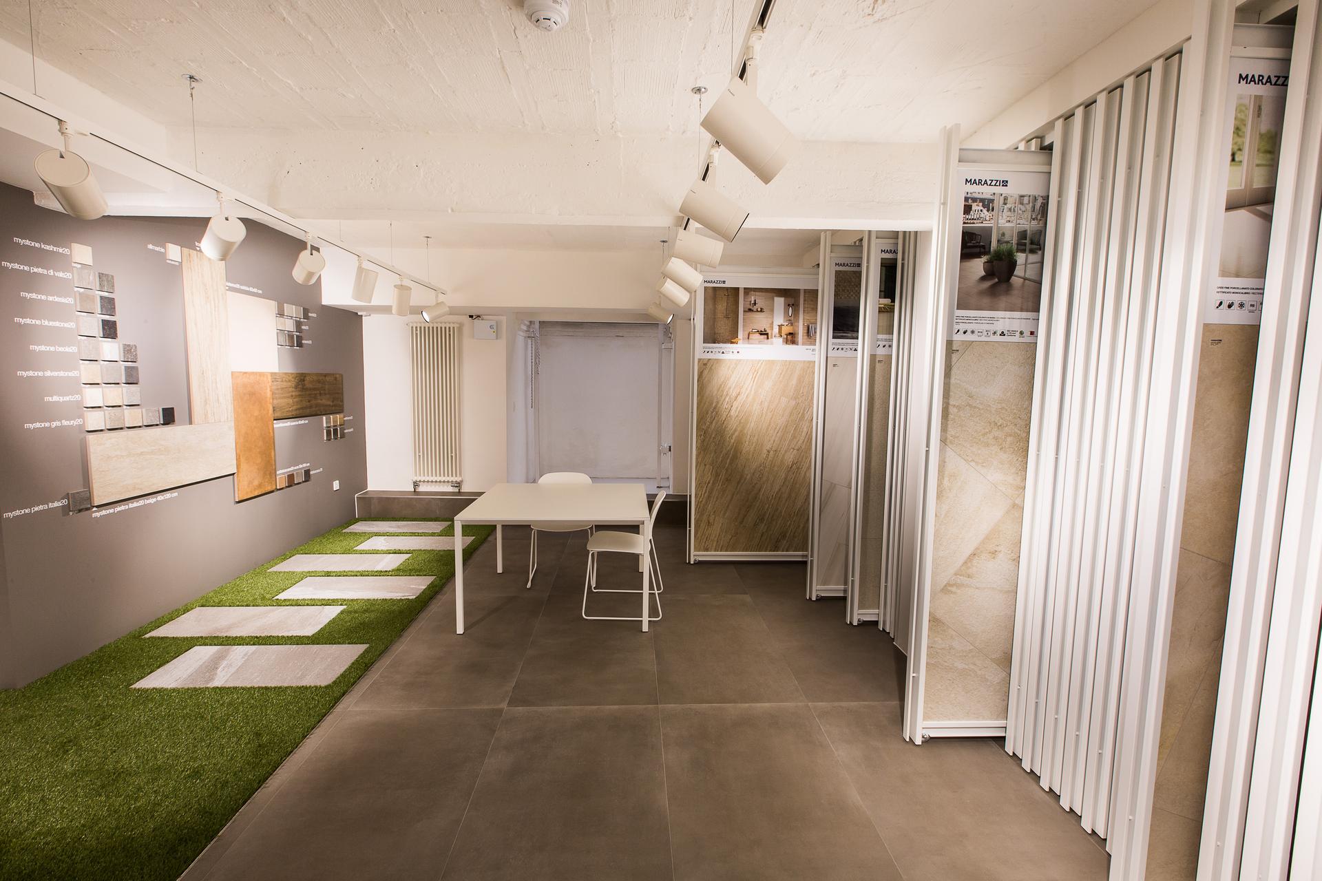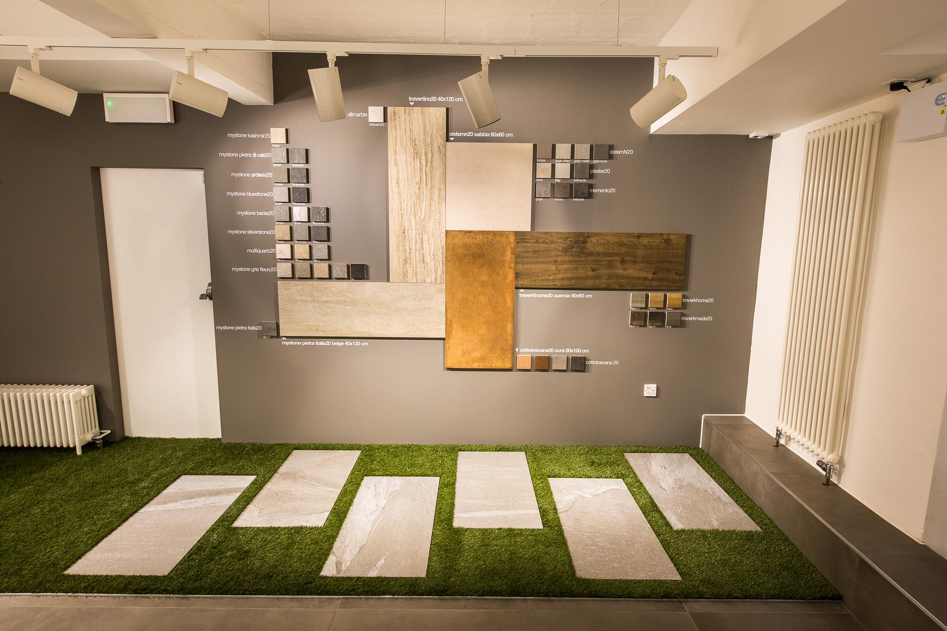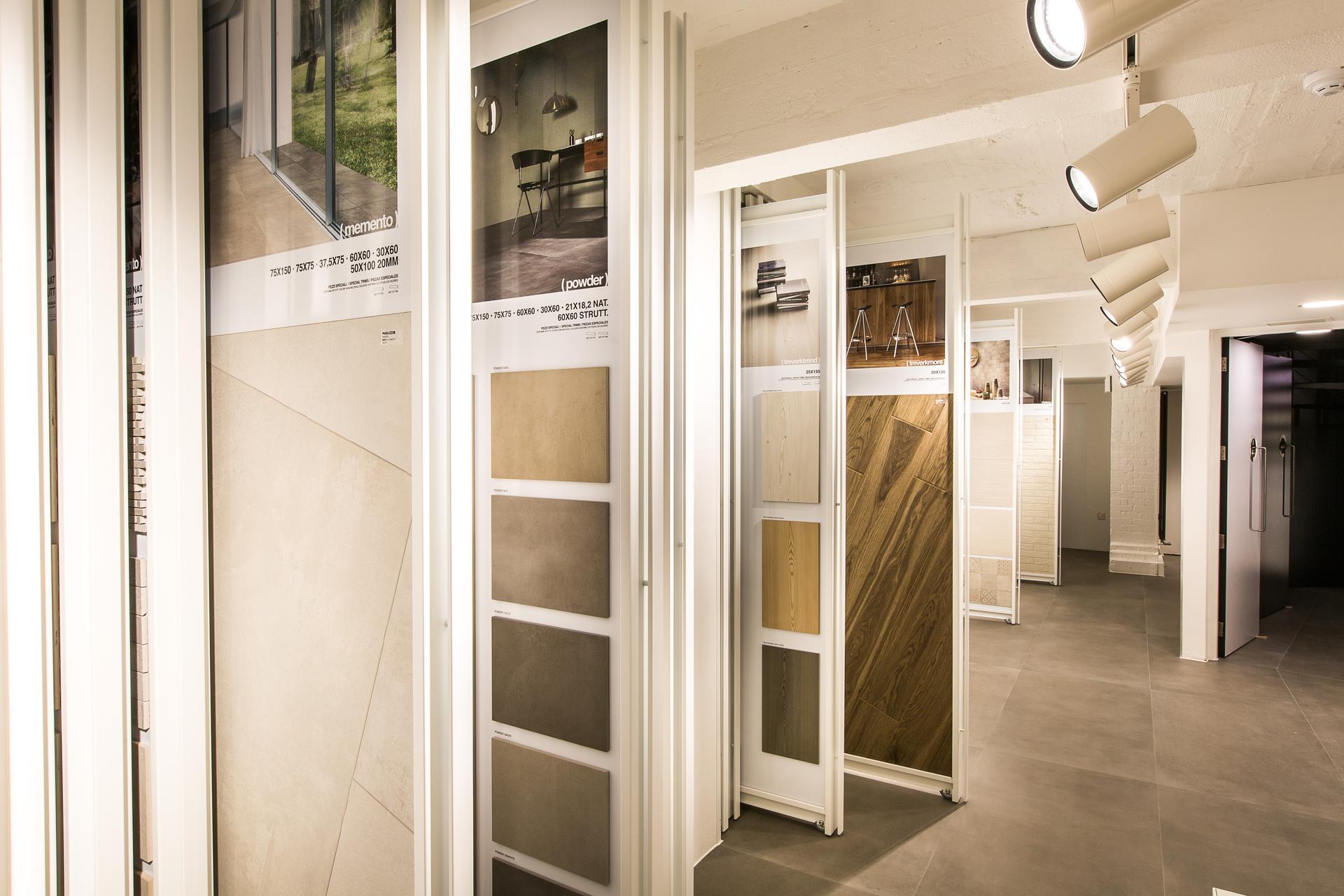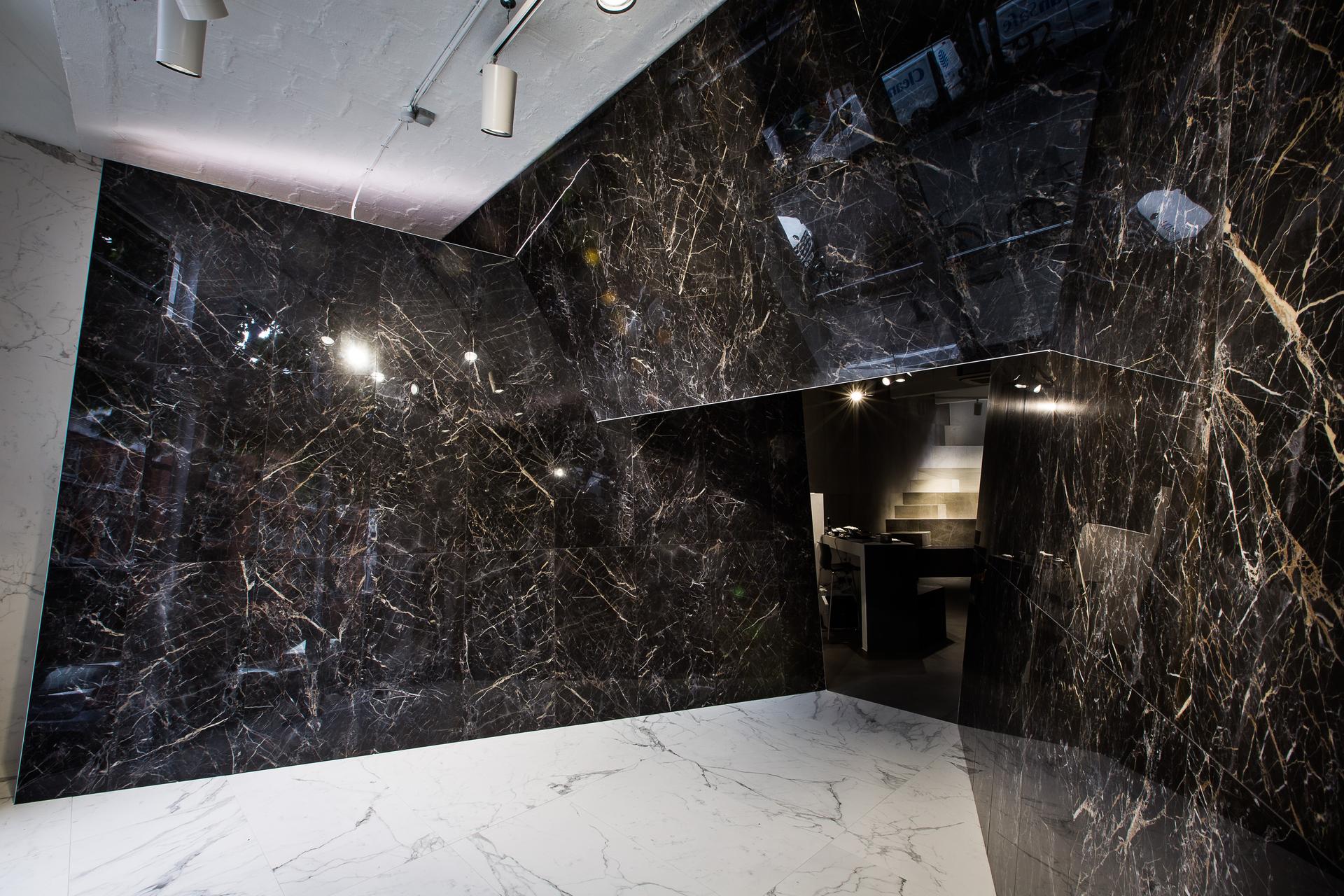 The entrance is eye-catching, evoking a dramatic scene change. A portal, a veritable second facade, creates a theatrical curtain: the stoneware slabs converge in a striking composition that conveys precision, attention to detail and innovation. The ceramic material employed is both protagonist and background and the installation is not simply a way of showcasing the product, but becomes a narrative device, the chance to tell a story or put across an idea.