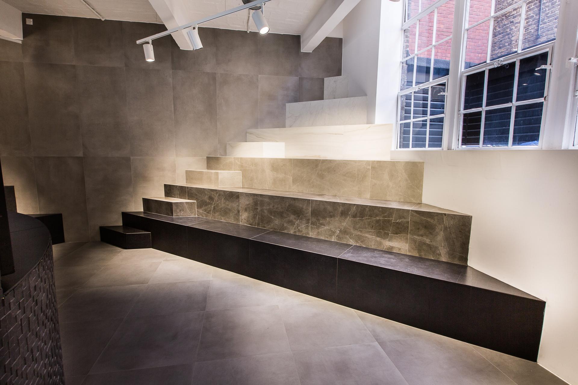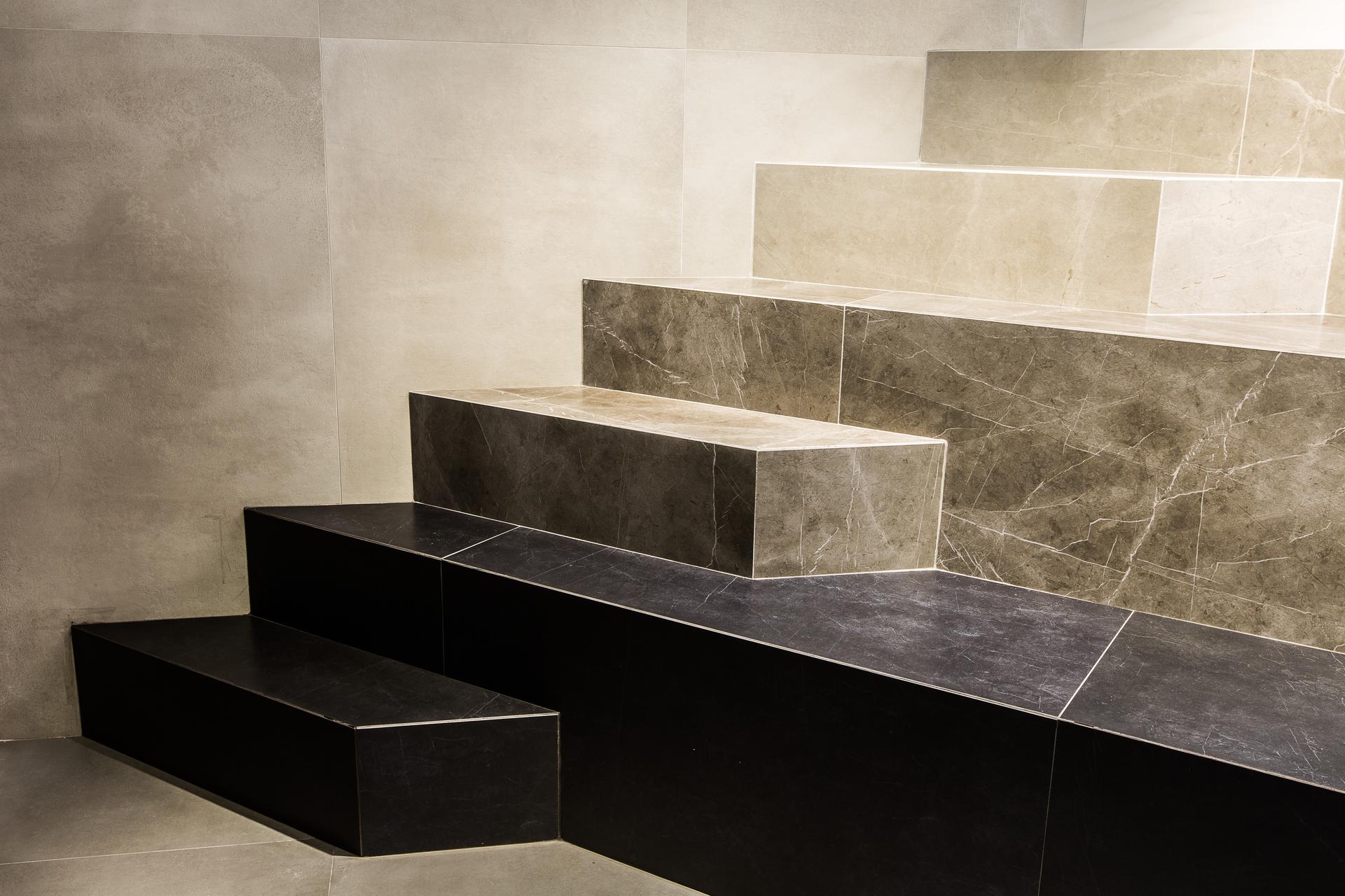 Crossing this second threshold, one comes to the main area, a welcoming space that draws inspiration from ancient theatre design, with solid steps rising up towards the ceiling and forcing the observer to look at the material not only as a covering, but also as a volume. These unexpected blocks are imposing and almost outsized, there to be admired but also to be used as seating for presentations and performances. Each set of steps is made with different stoneware: concrete effect, marble effect and stone effect, all however featuring the same colour shading from dark to lighter hues, a trick that helps bring the space together and emphasise its vertical dimension. The fourth corner, meanwhile, is taken up by the spiral staircase, encased in a great black drum covered with three-dimensional mosaic tiles.