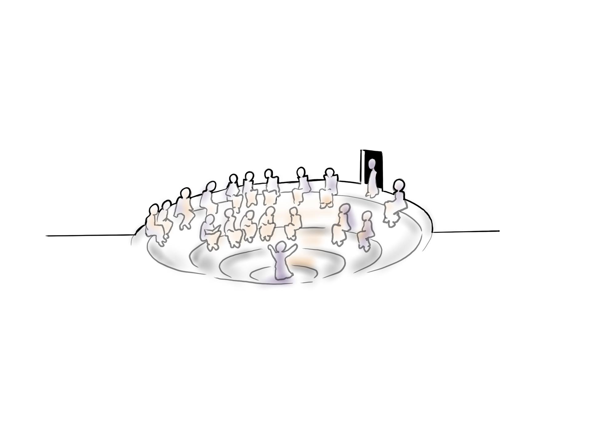 The first floor has been designed to provide a flexible working area, a bright open space that reflects the industrial mood of Clerkenwell as faithfully as possible. To achieve this, all the interior partitions have been eliminated, leaving one big open space, a cross between an artist’s atelier and an architectural studio. The dominant feature in this space is a massive, 20-metre-long meandering table that can be used for individual as well as team work. White domes suspended above the table define separate working areas and ensure acoustic comfort.