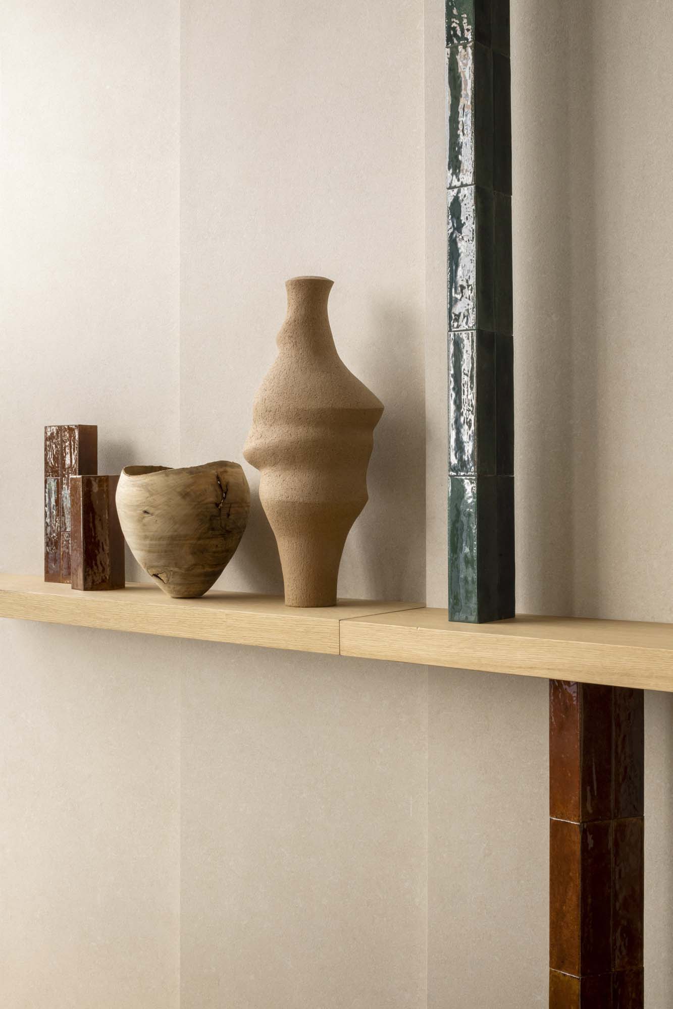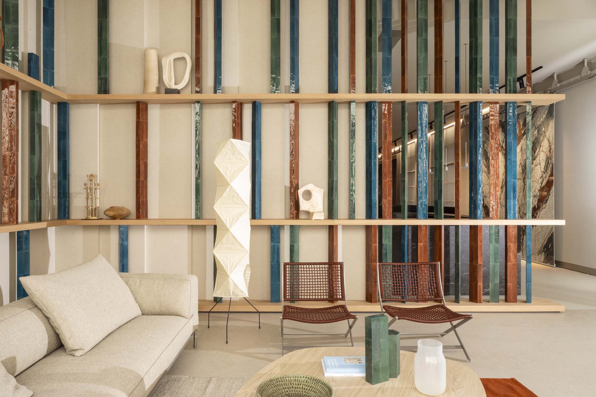 The installation explores its materiality, pushing its application potential to the limit: from the pleated wall to the three-dimensional and changing surfaces of the vertical bars made with the glazed bricks of the Crogiolo Lume collection, in Caramel, Green, and Ocean shades.