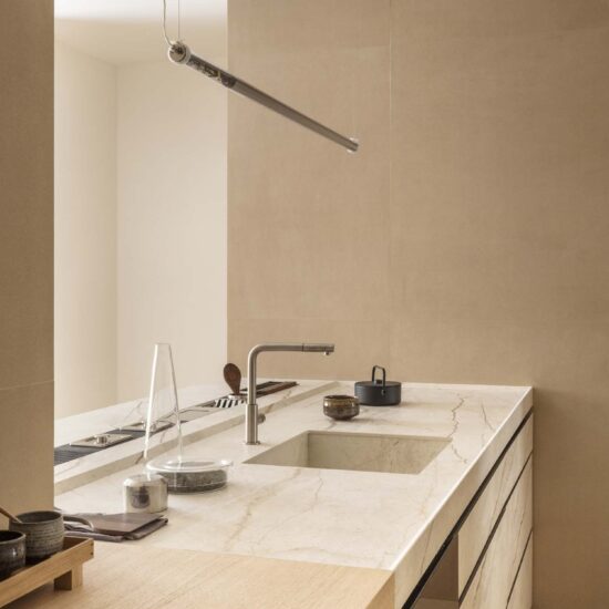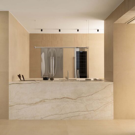 On the floor, the irregular texture inspired by the hand-beaten earth of the Slow collection, in the soft Calce shade, is combined with the glossy finish and the precious circular cut of the Grande Marble Look slabs inspired by the rare Brazilian marbles Patagonia.