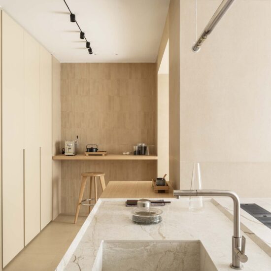 The working area has been radically modified, introducing an open kitchen that hybridizes functions and languages. The kitchen is monolithic and clad with large slabs of The Top Stone Look Silver Root, in White color, whose distinctive feature is the marked veins that chase each other on a background of intense shades.