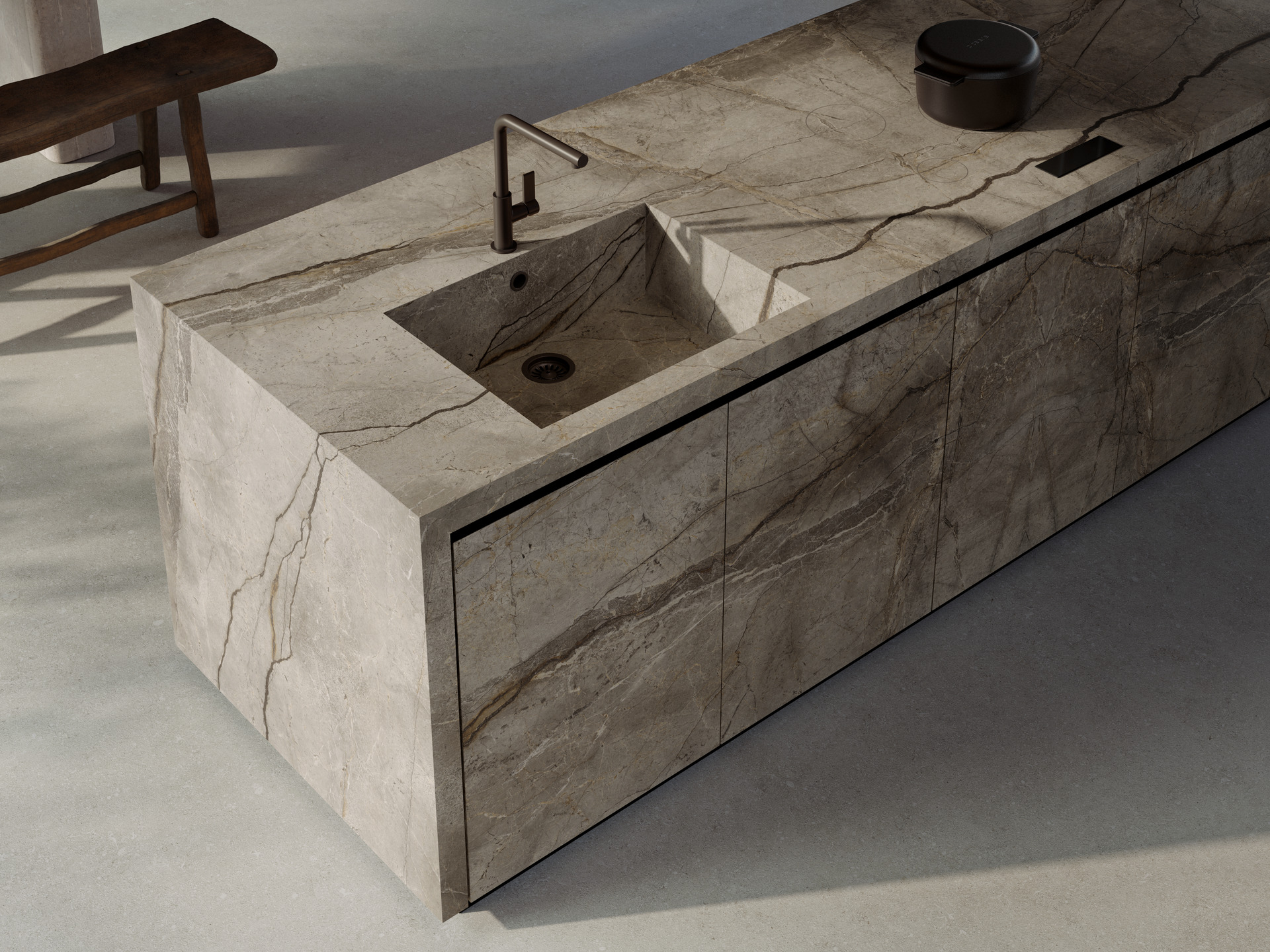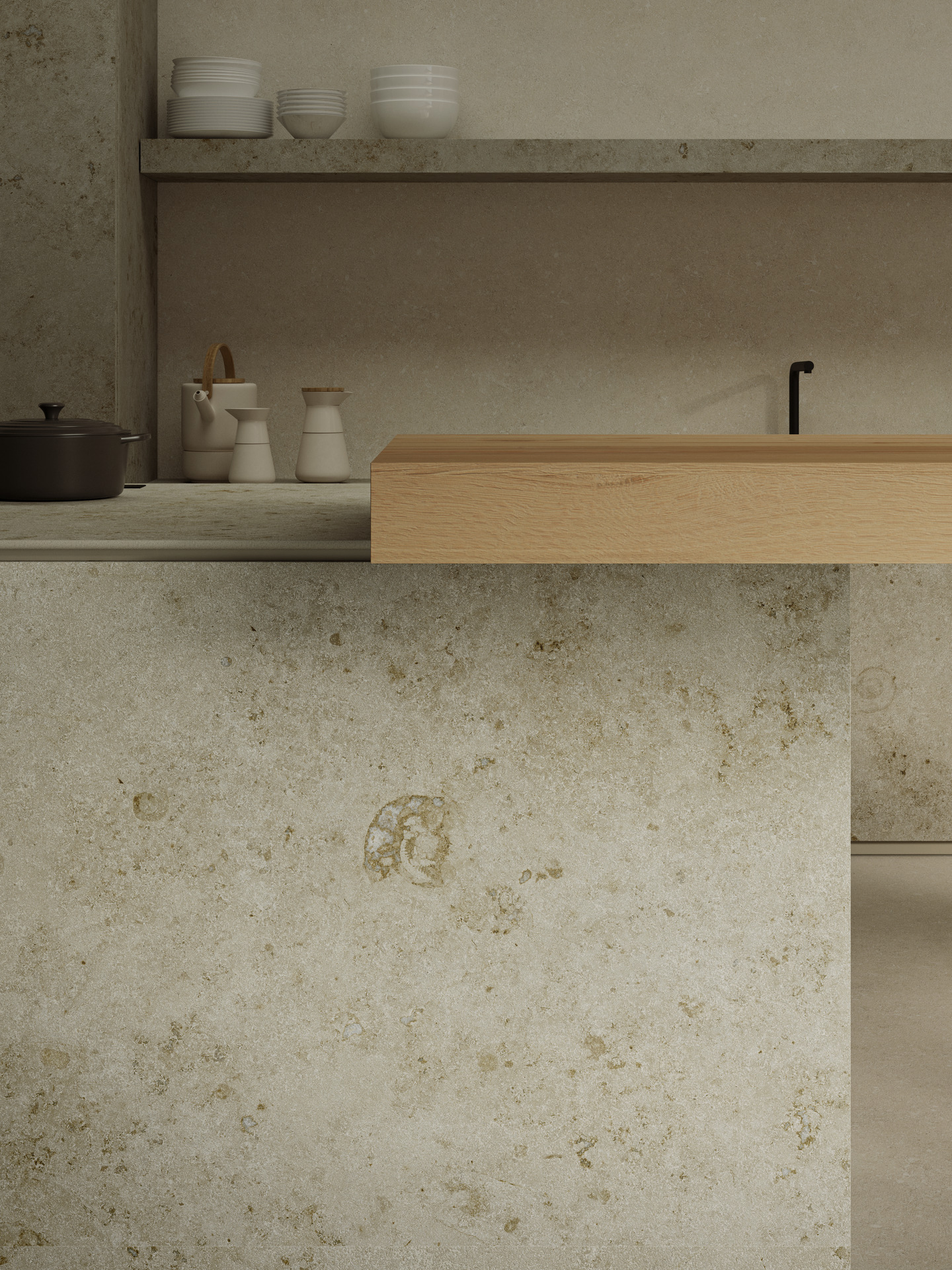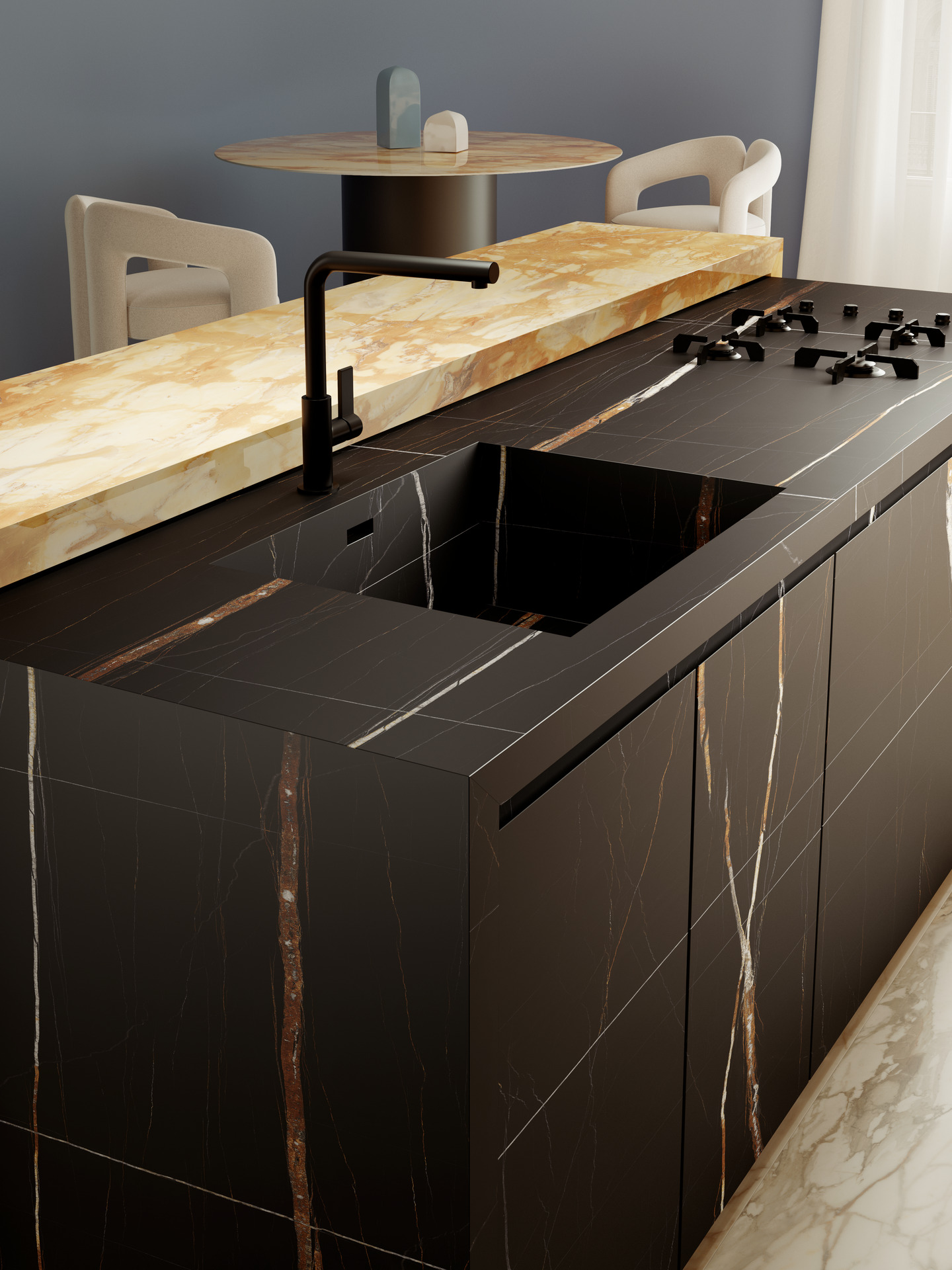 Porcelain stoneware’s technical characteristics make it exceptionally resistant to scratches, knocks, extreme temperatures and chemicals, all of fundamental importance for a kitchen countertop and zones that are intensively used and cleaned every day.