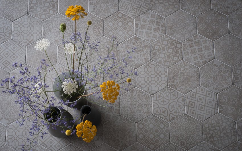 In addition to the 75×150 cm, 75×75 cm, 30×60 cm and 60×60 cm sizes, there are hexagon tiles in size 21×18.2 cm, available in all 5 colours. A herringbone mosaic tile further enriches the range. Hexagonal Déco “cementine” cement tiles 21×18.2 and Liberty decor tiles in the 75×75 cm size are available in Sand and Graphite colours, featuring 4 different geometric and floral designs with shaded, dusty patterning.