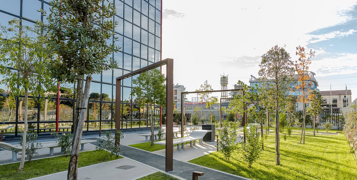 The aim, agreed with the property’s owners, was to create a well structured, complex, multiform space outside the buildings’ main entrance, featuring new pathways, areas with seating and a system of trees and gardens, also completely new. The glazed main facade of one of the complex’s three buildings overlooks Via Tiburtina, one of Rome’s main highways, which carries heavy traffic. The outdoor area next to this facade provides a filter between the building and the busy road. The project thus set out to create a green “promenade” comprising two gardens either side of the building’s main entrance. The larger garden is conceived as a spacious relaxation area, including a pedestrian pathway and islands planted with trees.