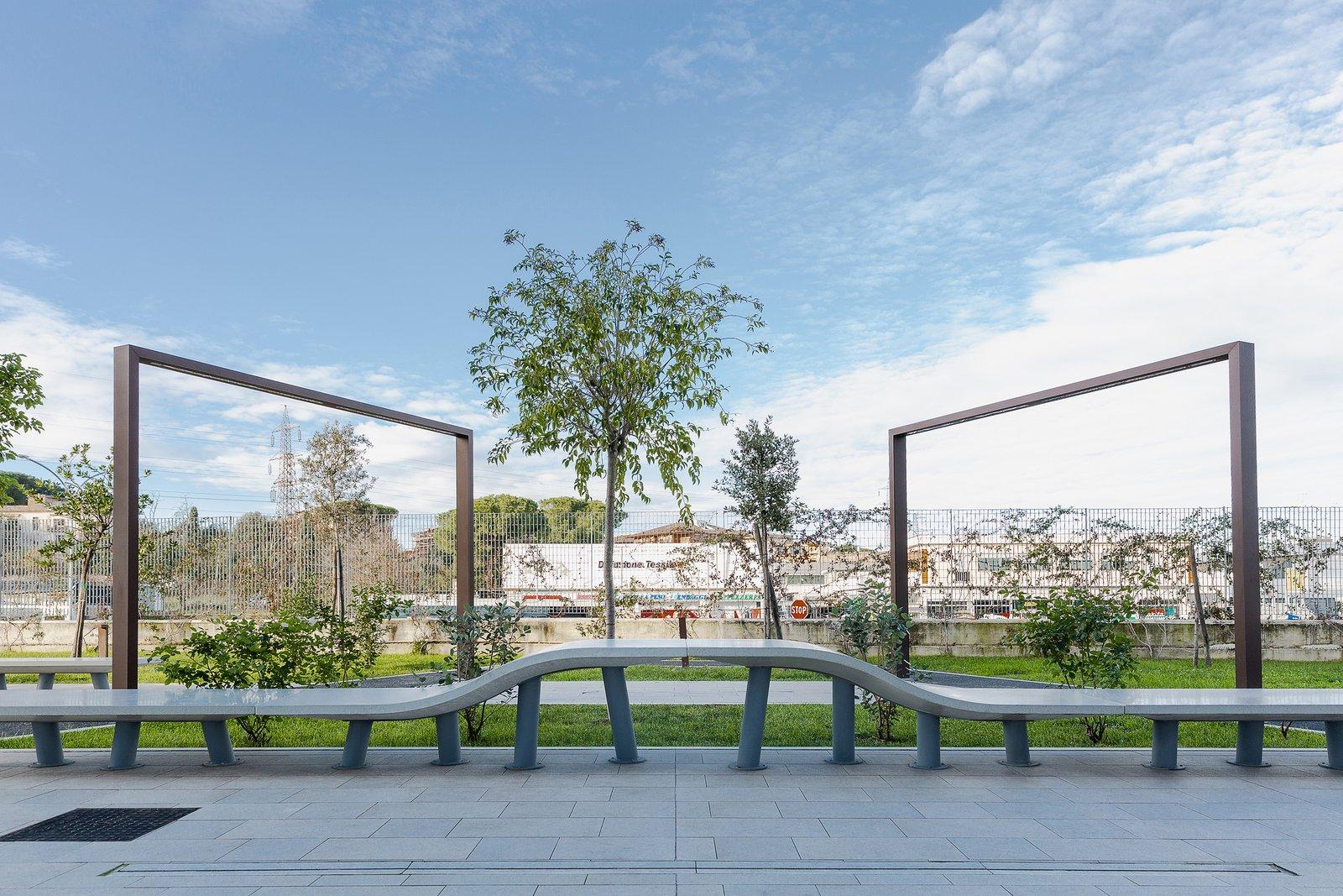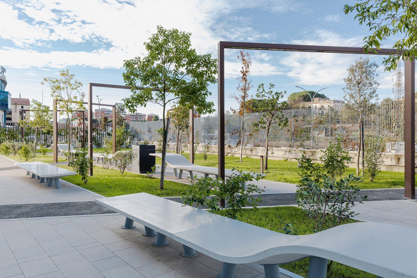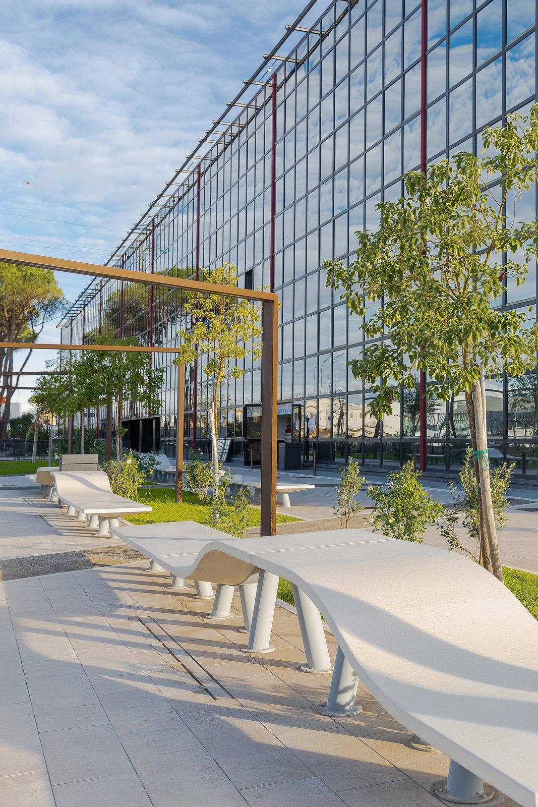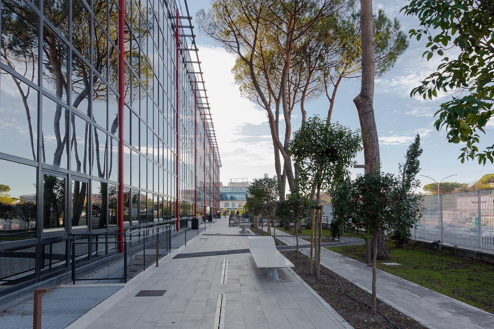 The aim, agreed with the property’s owners, was to create a well structured, complex, multiform space outside the buildings’ main entrance, featuring new pathways, areas with seating and a system of trees and gardens, also completely new. The glazed main facade of one of the complex’s three buildings overlooks Via Tiburtina, one of Rome’s main highways, which carries heavy traffic. The outdoor area next to this facade provides a filter between the building and the busy road. The project thus set out to create a green “promenade” comprising two gardens either side of the building’s main entrance. The larger garden is conceived as a spacious relaxation area, including a pedestrian pathway and islands planted with trees.