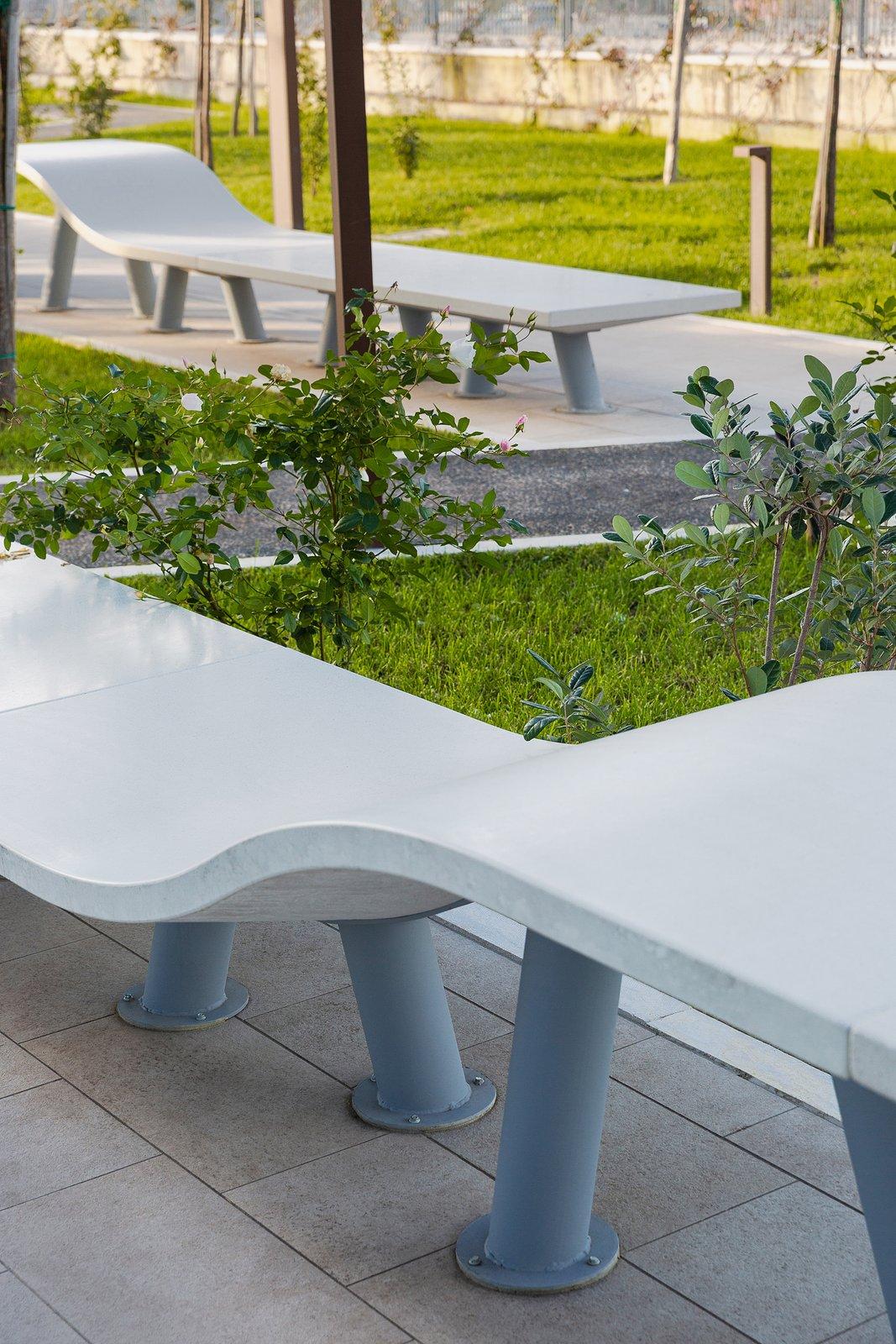 One of the project’s distinctive features is the lighting: the system of Corten steel portals emphasises the pathway, especially in the evening, placing the focus on the main pedestrian route, lined with seats with curvy contemporary design. This main pathway intersects with secondary cross-paths which create and delimit the planted areas. Particular care was taken over the sustainability of the technologies and materials selected for the project. All light fittings are energy-saving type and large portions of draining paving were installed, while many different varieties of trees and shrubs were planted to double the existing area of vegetation.